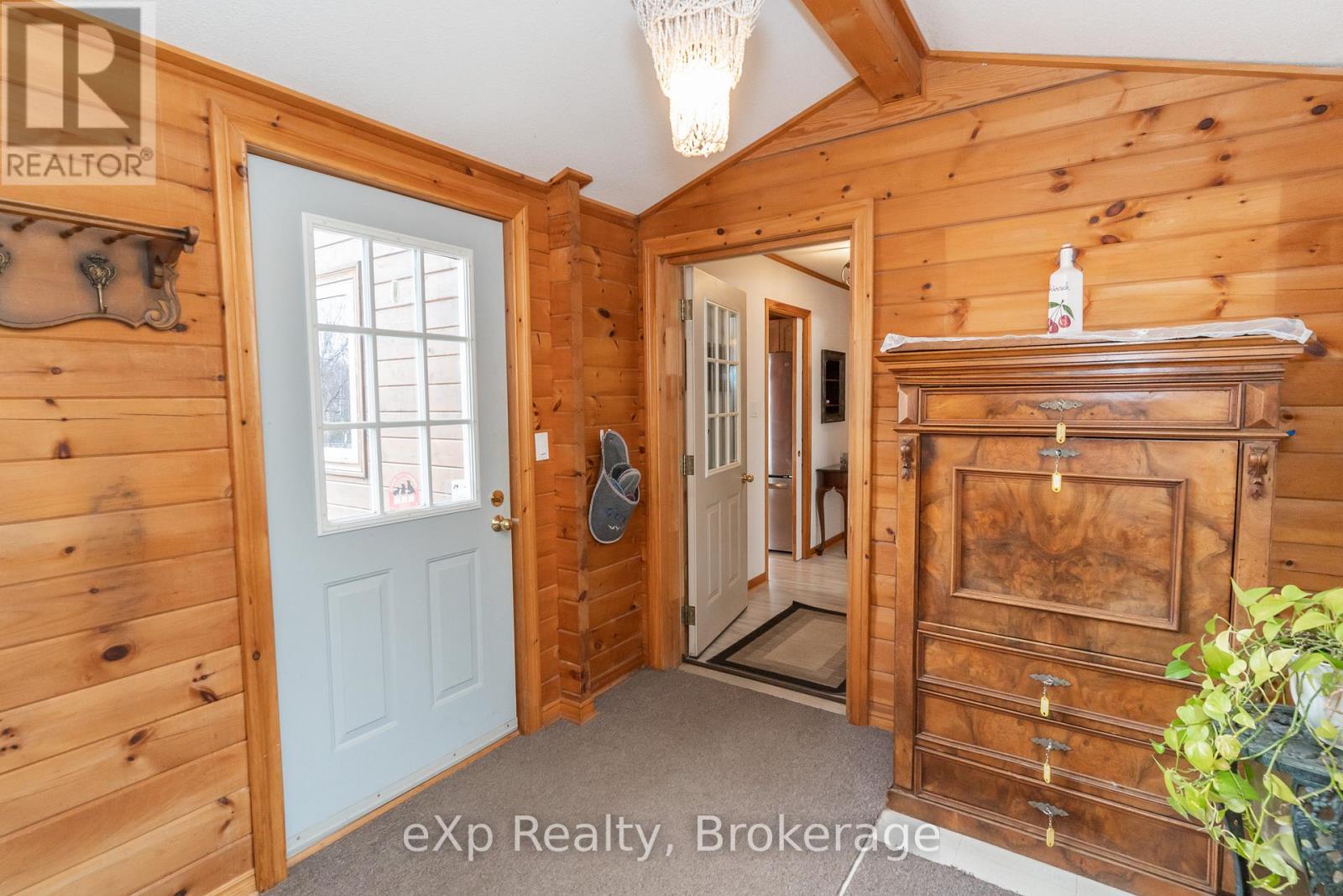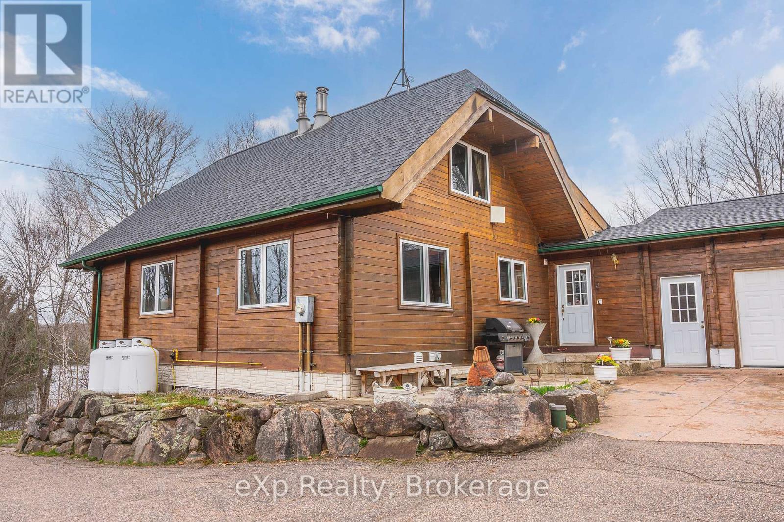 Waterfront Home with Income Potential. This spacious 3-bedroom, 2-bathroom Panabode home sits on 8.2 acres along the shores of beautiful Ahmic Lake, featuring a 3-bay garage. The large eat-in kitchen offers ample counter with cupboard storage, perfect for family gatherings. The living room boasts a cathedral ceiling and walkout to a lakefront deck. A mezzanine level provides space for a home office or studio. The entry foyer provides abundant storage which connects the home to the garage. The lower level features two additional bedrooms, two bathrooms, a shared kitchenette, all accessible via a separate entrance ideal for extended family, guests, or as a bed and breakfast for additional income. Enjoy this stunning property as your new lakefront family home. (id:64974)