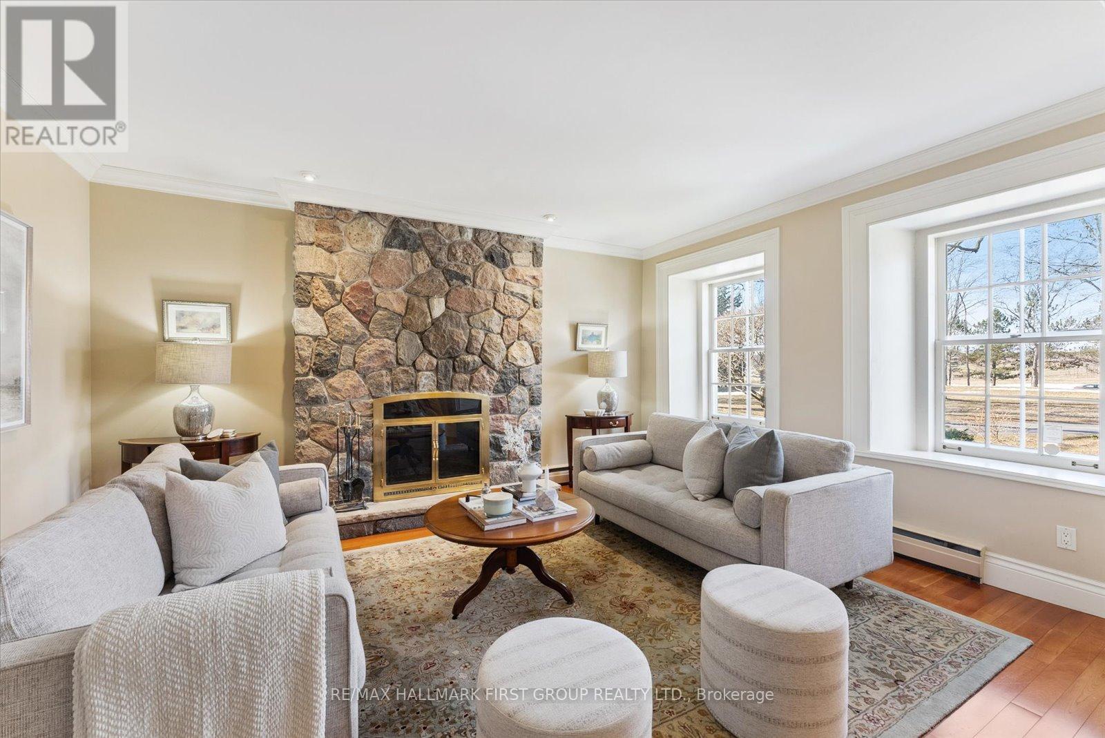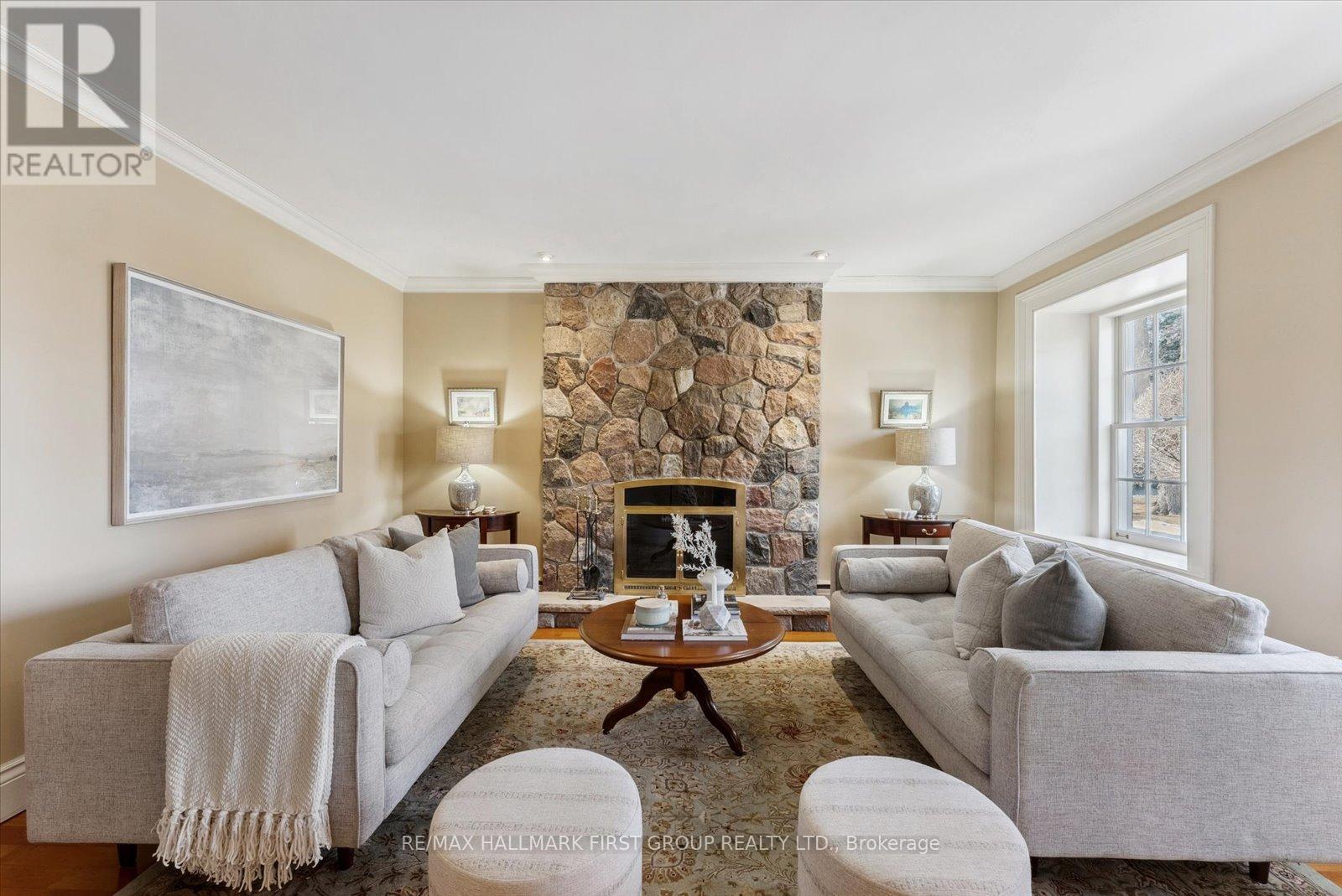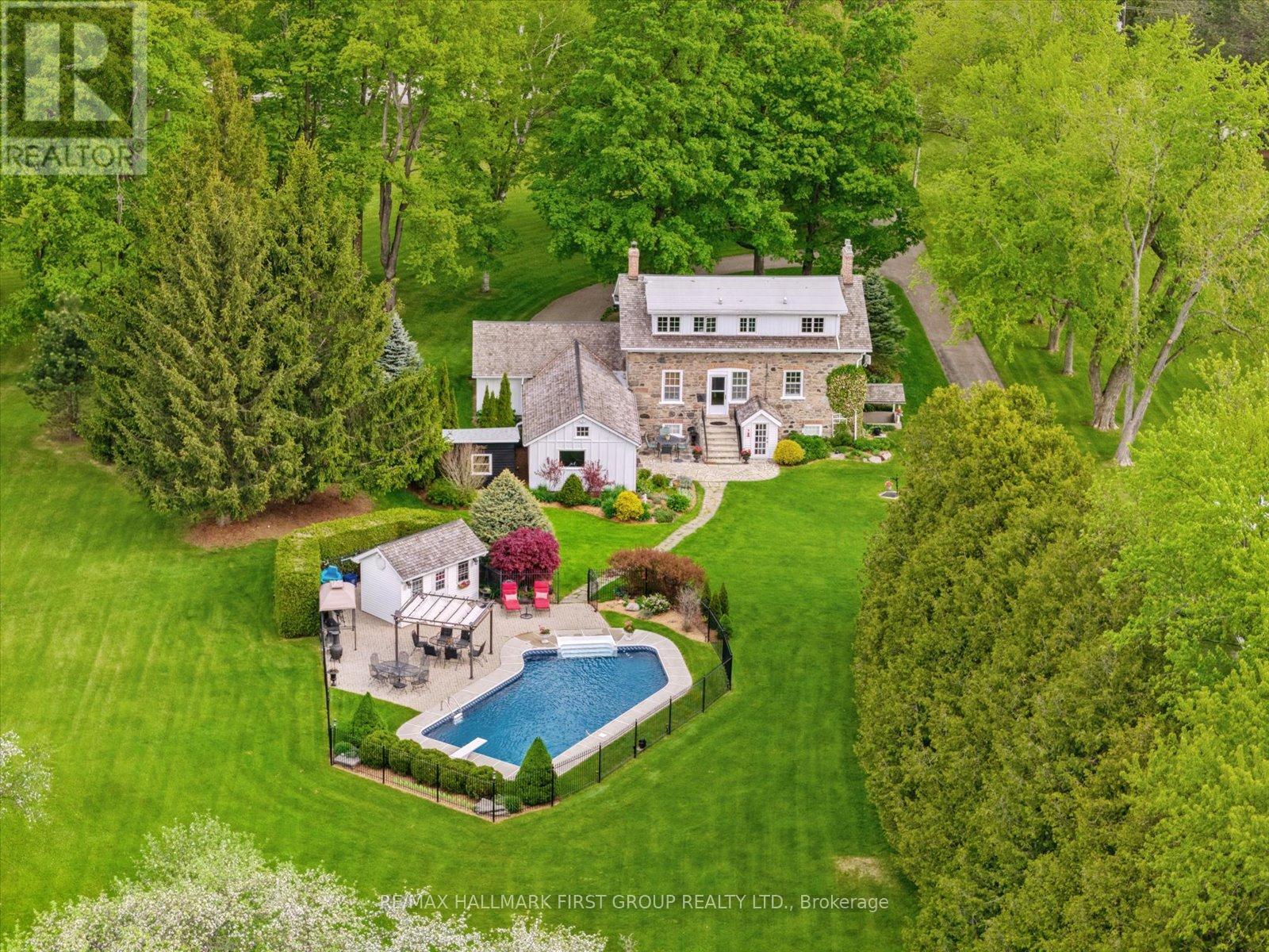 Welcome to Stone Eden-a place where timeless character and intentional living come together.Set on 10.87 rolling acres in the quiet countryside of Ashburn in Whitby, this remarkable property and home is a legacy meant to be lived in and cherished.From the moment you pass through the custom wrought-iron gate, a sense of calm settles in. The winding private drive leads you past two serene ponds, a mature apple orchard, and a heated in-ground pool, each element adding to the estate's rare privacy and natural beauty. A 37' x 28' barn enhances the possibilities-ideal for equestrian use, a hobby farm, creative workspace, or flexible storage.At the centre of the property stands the original hand-crafted stone residence, meticulously restored and updated to honour its heritage while offering modern comfort. Sunlight fills the inviting living and dining rooms, where warm hardwood floors and a gas fireplace set the tone for family gatherings and quiet evenings. The kitchen blends charm with functionality, featuring built-in appliances, a gas cooktop, and heated floors.The main floor also includes a sophisticated office with custom built-ins, perfect for focused work or study. Upstairs, four well-appointed bedrooms provide space and flexibility for families, guests, or multi-generational living. The finished walk-up basement adds yet another dimension, offering a stylish bar, gas fireplace, and a spacious area for relaxing or entertaining. Every detail of Stone Eden reflects pride of ownership-from the cedar roof (2020) and MagicWindows to the curated gardens and thoughtfully maintained trails. This is a property where history is preserved, nature is celebrated, and future memories are waiting to be made.Whether you're seeking a peaceful retreat, a multi-generational haven, or a place to fully embrace country living without compromise, Stone Eden invites you in. A truly rare and extraordinary opportunity. (id:64974)