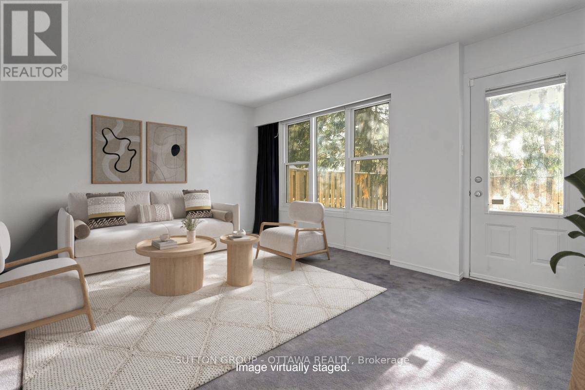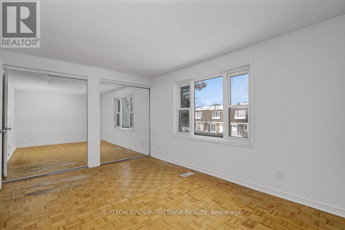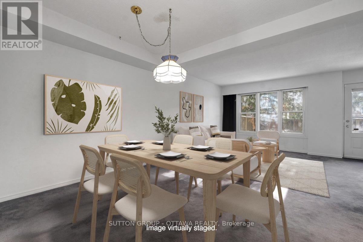 Bright and comfortable, easy-care townhouse in a quiet enclave just minutes from everyday amenities, parks, and the city core. This two-storey, three-bedroom home is located near Carleton University, Mooney's Bay, and shopping immediately next door including grocery, banking, coffee, and transit. The home is clean, well maintained, and move-in ready, offering a solid opportunity for buyers who want to update at their own pace. Tile flooring greets you at the entrance and continues through the kitchen for durability, while original parquet flooring lies beneath the carpet on the main level and runs throughout the upper floor, adding warmth and character. The functional kitchen offers full-size appliances and good storage, and the main living and dining areas benefit from excellent natural light and a practical, comfortable layout. Upstairs, a spacious primary bedroom with mirrored closet doors is complemented by two additional good-sized bedrooms, providing flexibility for family living, guests, or home office space, along with a full bathroom. The partially finished basement includes a rec room with finished walls and a separate laundry and storage area, offering flexible additional space that can be adapted to suit a buyer's needs. The private, fenced backyard with gate access provides usable outdoor space for relaxing, gardening, or pets. Additional highlights include underground parking with a separate garage and access to an indoor pool and sauna, adding year-round lifestyle appeal. Walk or bike to nearby parks, Mooney's Bay, and the Rideau Canal pathways, with everyday shopping amenities and transit just steps away. This property is well suited to first-time buyers, downsizers seeking manageable space with amenities, or investors looking for a well-located, rentable townhouse. (id:64974)