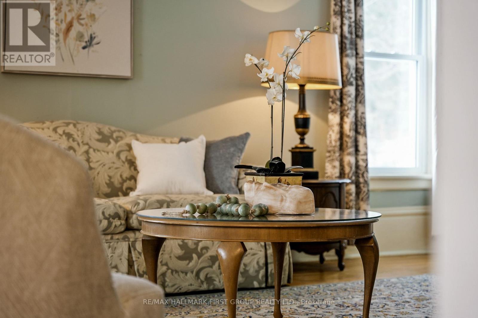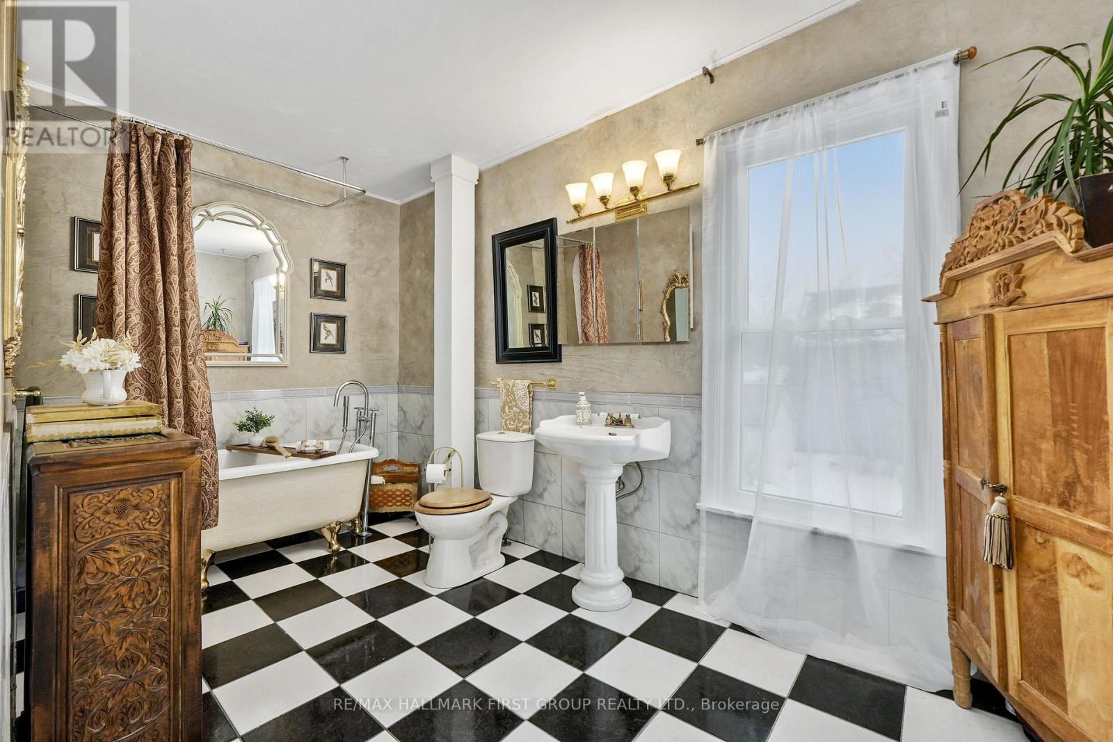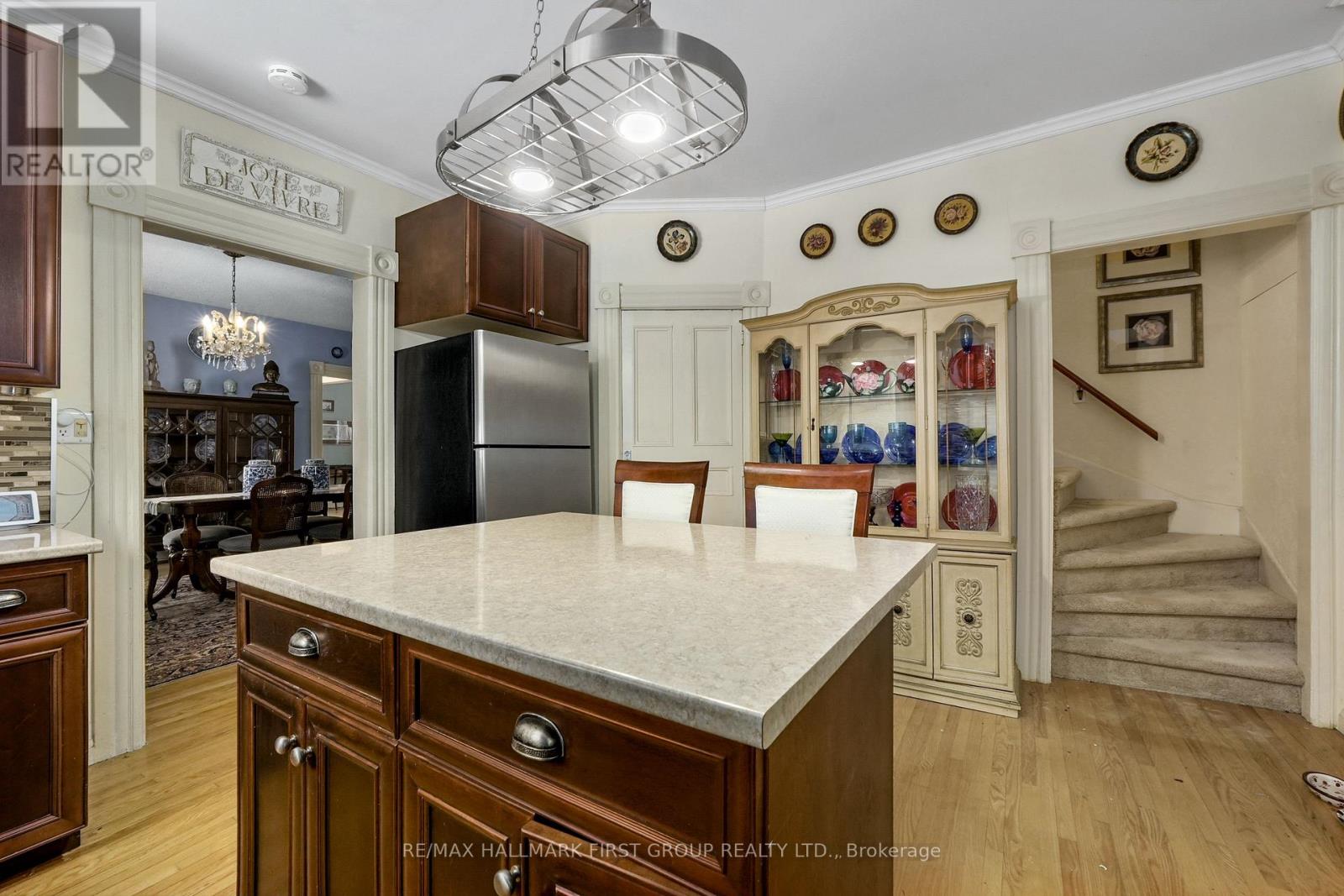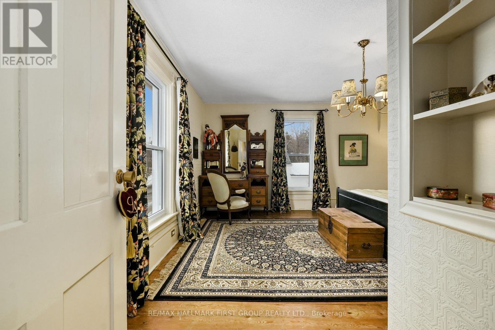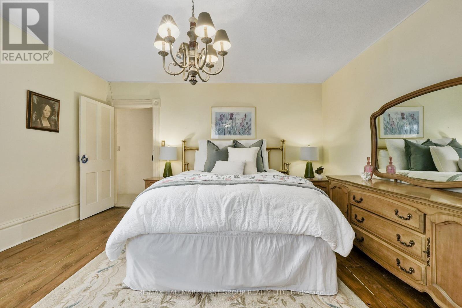 Full of character and timeless appeal, this brick home sits in the heart of Cramahe and blends period charm with thoughtful modern updates. An expansive front veranda sets the tone, leading into a spacious front foyer where classic craftsmanship is immediately on display. The inviting living room features extra-high baseboards, hardwood floors, and a fireplace, creating a warm and elegant space to relax or entertain. The dining room easily accommodates large gatherings and offers a walkout to the sunroom, an ideal spot to enjoy a quiet morning coffee or unwind at the end of the day. The kitchen delivers modern convenience with a tile backsplash, ample counter and cabinet space, an island with breakfast bar, and stainless steel appliances. The main level is completed by a guest bedroom, a bathroom, and the added convenience of main-floor laundry. Upstairs, the sun-soaked primary bedroom offers dual closets and access to a spacious bathroom, along with three additional well-sized bedrooms to suit family, guests, or home office needs. Outside, the sprawling property is surrounded by mature trees and features a covered back porch, perfect for outdoor enjoyment. Ideally located close to amenities with direct access to the 401, this home offers space, charm, and convenience. (id:64974)