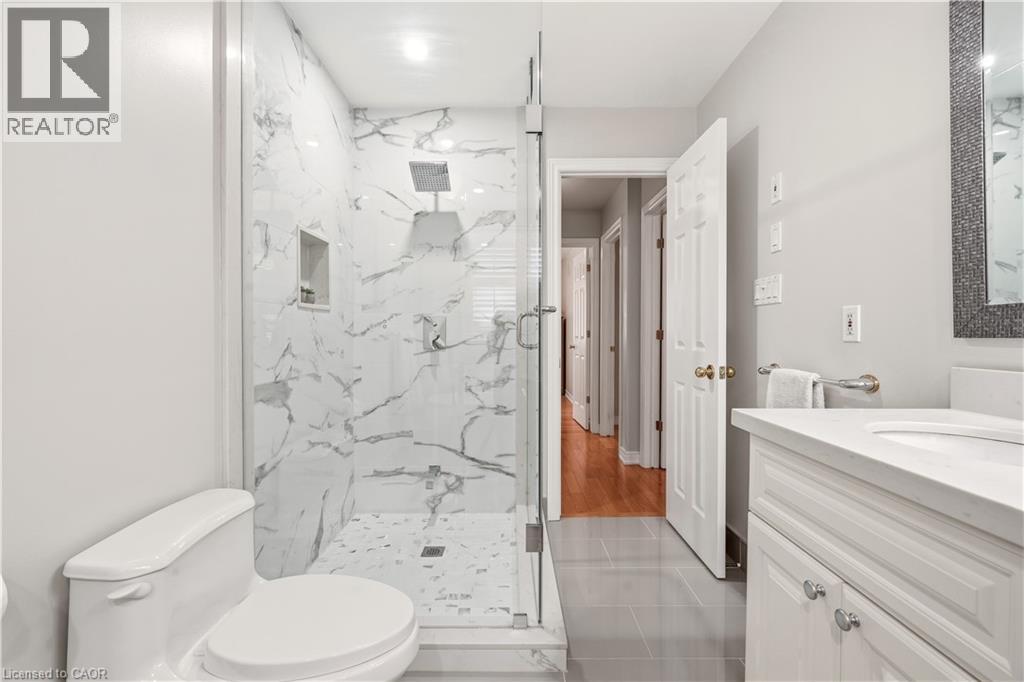 This beautifully maintained detached backsplit in Ancaster, built in 2001, offers the perfect blend of space, comfort, and low-maintenance living. With almost 3,000 square feet of finished living space, this move-in ready home features 4 bedrooms, 2 full bathrooms, and a convenient powder room on the main level. The bright, open-concept main floor seamlessly connects the living room, dining area, and kitchen—ideal for both everyday living and entertaining. The kitchen is thoughtfully designed with an eat-at island, stone countertops, and sleek stainless steel appliances, all complemented by neutral finishes throughout. Upstairs, you’ll find three generously sized bedrooms and a stunning, recently renovated spa-like bathroom complete with a soaker tub, double sink vanity, and a walk-in glass shower. Carpet-free throughout, the home showcases rich hardwood flooring that adds warmth and continuity. The lower level features a spacious family room with a cozy gas fireplace and walkout access to a private backyard retreat—your own secret garden filled with low-maintenance perennials and lush greenery. This level also includes a separate fourth bedroom and full bathroom, making it ideal for guests or extended family. The basement offers additional flexibility with a mostly finished space perfect for a home office, in-law suite, or additional bedroom, along with ample storage throughout. The exterior impresses with exceptional curb appeal, a large double driveway, and a double car garage with parking for 6+ vehicles. Set in a quiet, tranquil neighbourhood surrounded by picturesque farmland, yet just minutes to shopping, everyday amenities, and quick access to the 403 and the Linc, this home truly offers the best of both worlds. (id:64974)