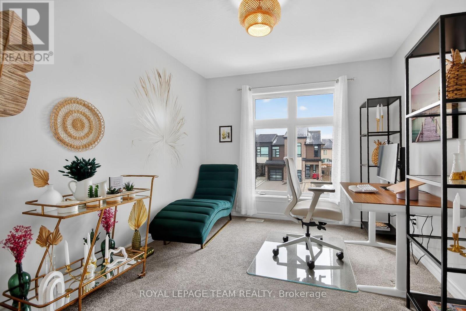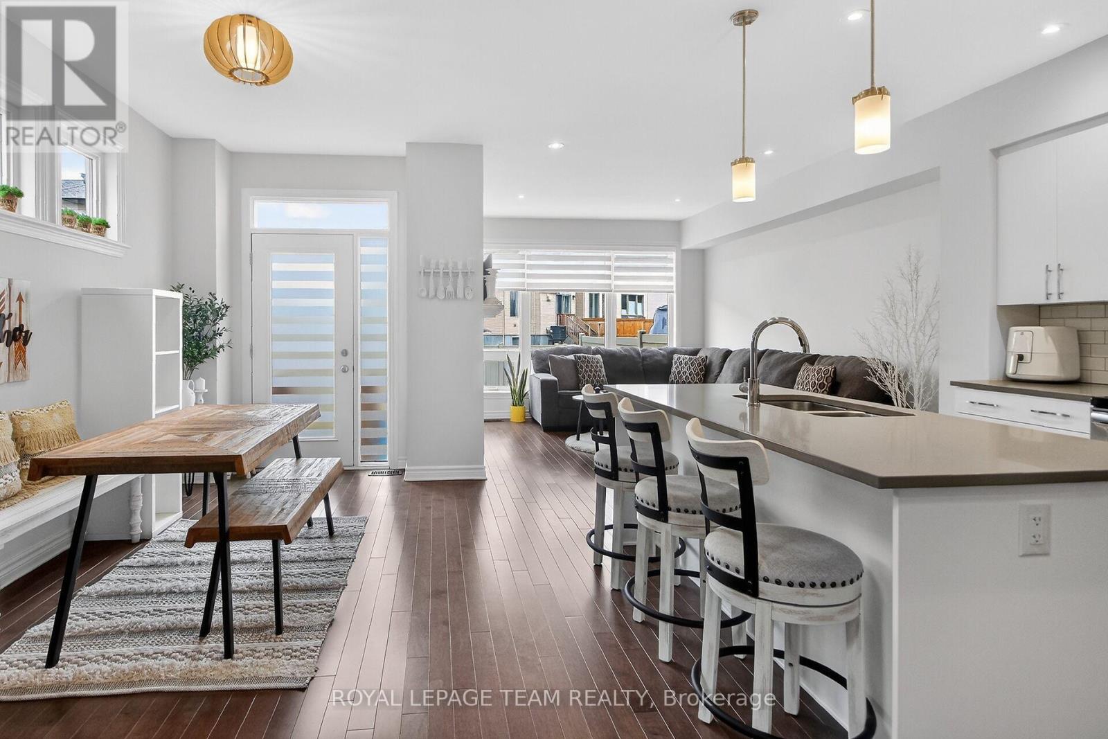 Beautifully maintained 3-bedroom townhome in sought-after Riverside South that shows like a new home, offering over $45,000 in upgrades and a premium lot backing onto a pie-shaped yard, providing added privacy. The main floor features 9 foot ceilings, a stunning kitchen with quartz countertops, a large island, ample counter space, generous cabinetry, and a spacious pantry, flowing into a bright dining area with a door leading to the large fully fenced backyard. The inviting living room is filled with natural light from large windows, features a beautiful gas fireplace, and includes custom blinds. A welcoming foyer with professionally done wood panel accent wall and convenient powder room complete this level. Upstairs, the spacious primary bedroom is filled with natural light and features a luxurious 5-piece ensuite with double sinks, stand alone shower, and a large soaker tub, along with a sizeable walk-in closet. Two additional well-sized bedrooms, a stylish main bathroom, and a conveniently located laundry room complete the upper level. The finished basement offers additional living space, bathroom rough in along with plenty of storage. Located close to parks, schools, shopping, recreation facilities, trails, the LRT, and the scenic Rideau River, as well as the airport. 24 hours irrevocable on all offers. (id:64974)