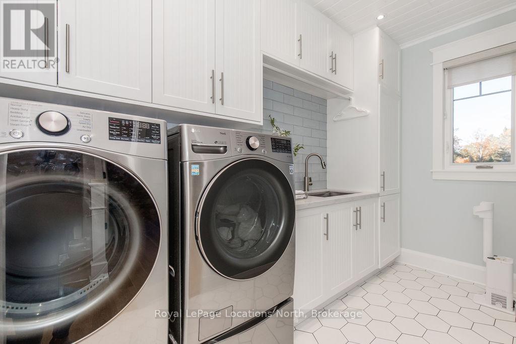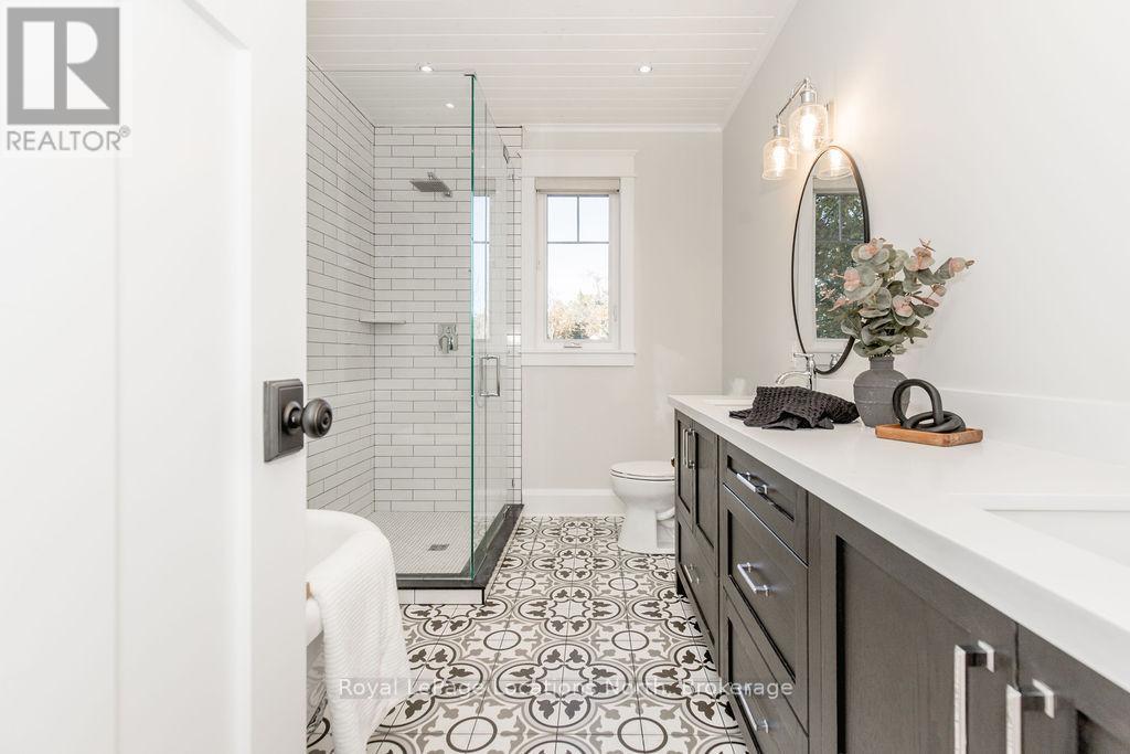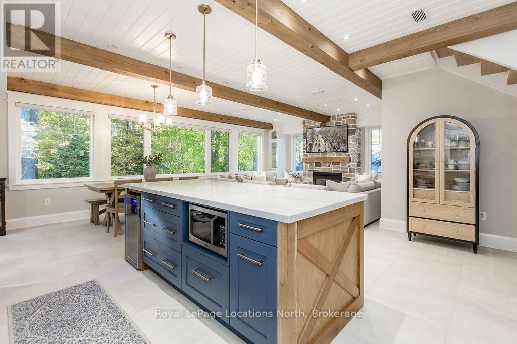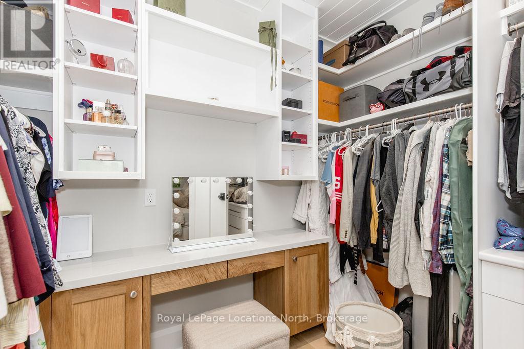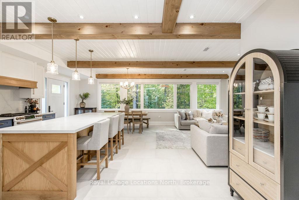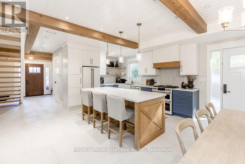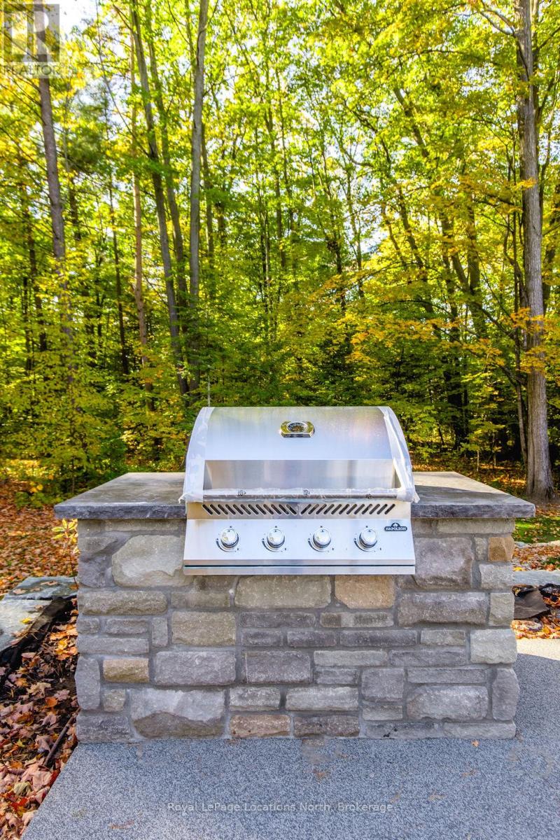 DREAM HOME WITH HEATED DRIVEWAY & WALKWAYS - Welcome to this stunning, custom-built 3 bed, 3 bath home showcasing exceptional craftsmanship, built in 2023, perfectly positioned backing onto protected land & directly across from the river in beautiful Wasaga Beach. Designed w/ a mix of modern luxury & timeless character, this home captures a century-home feel with its large mouldings, custom doors & wood beams w/ a custom-built stone fireplace accenting the main floor. Inside, the bright open-concept layout features wall-to-wall windows overlooking the forest, flooding the space w/ natural light. The custom kitchen is a true showpiece, showcasing a large quartz island, blue & white cabinetry, a mini wine fridge, & a full quartz backsplash. It's finished w/ a high-end signature line of Wi-Fi-enabled appliances, combining elegance & smart convenience for the modern homeowner. The dining area sits beside large windows, while the living room offers aged wood ceiling beams and tongue-and-groove ceilings that bring warmth & texture throughout along w/ the wide-plank white oak hardwood. Upstairs the hardwood stairs, lead to spacious bedrooms, each w/ custom walk-in closets, built-in desks, shiplap ceilings, & designer touches like wallpaper accents & skylights. The primary suite feels like a retreat, featuring a cozy fireplace, luxurious ensuite w/ floating tub, double quartz sinks, black cabinetry, & a walk-in closet w/ custom cabinetry & make up desk perfect for getting ready for the day.Luxury features include- Inside entry to garage with epoxy flooring + custom storage, hydronic in-floor heating, heated driveway & walkways while outdoors, enjoy the built-in BBQ, rubberized surfacing on patios w/ hot tub hook up, sprinkler system, & tranquil forest backdrop w/ cedar trees surround the patio for privacy.Interior features include motorized blinds, smart home system, security cameras, spray-foam insulation, high-efficiency boiler system, & a hard-wired generator. (id:64974)
