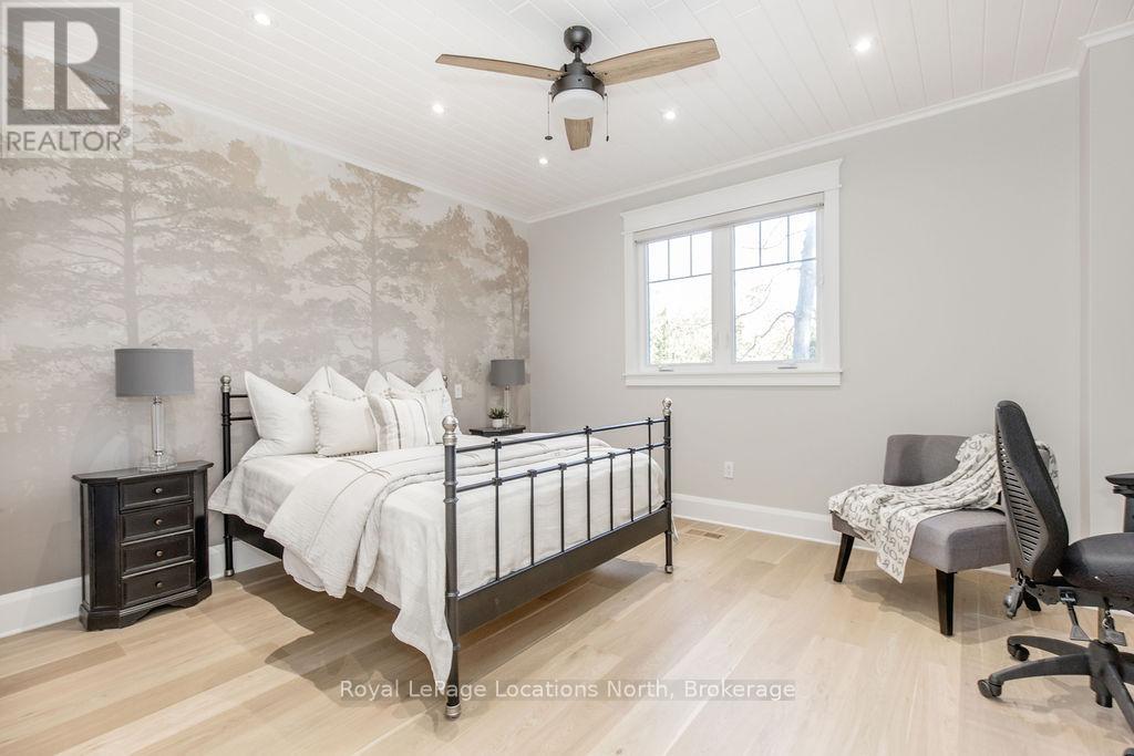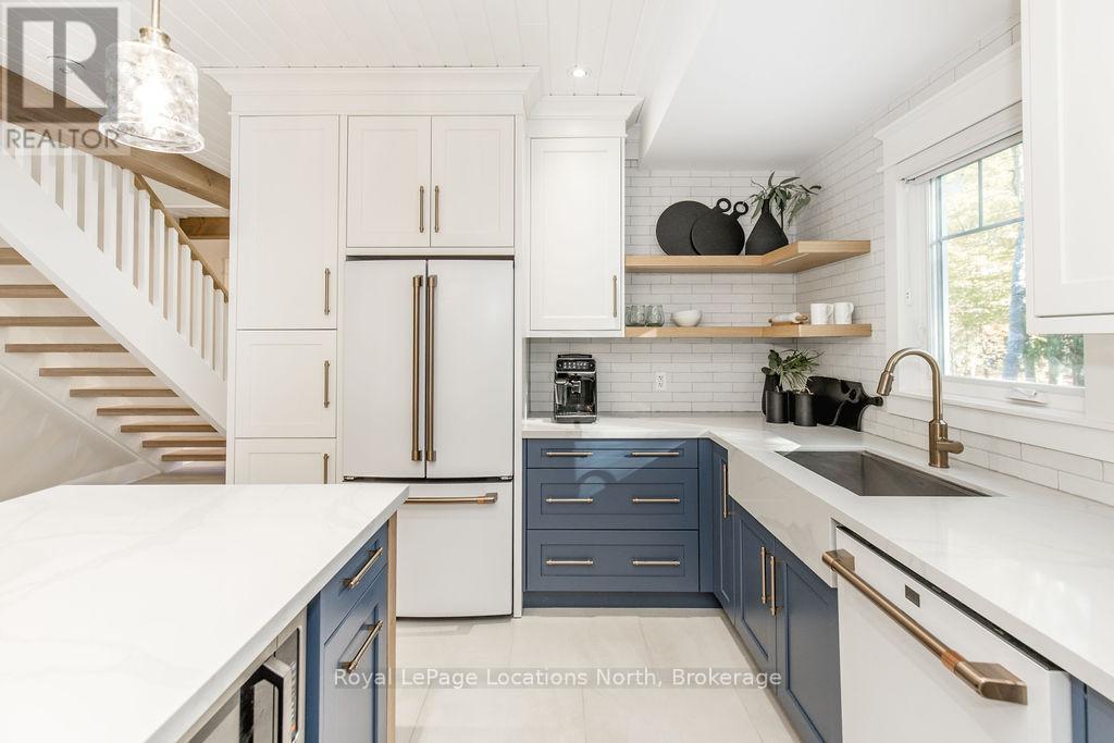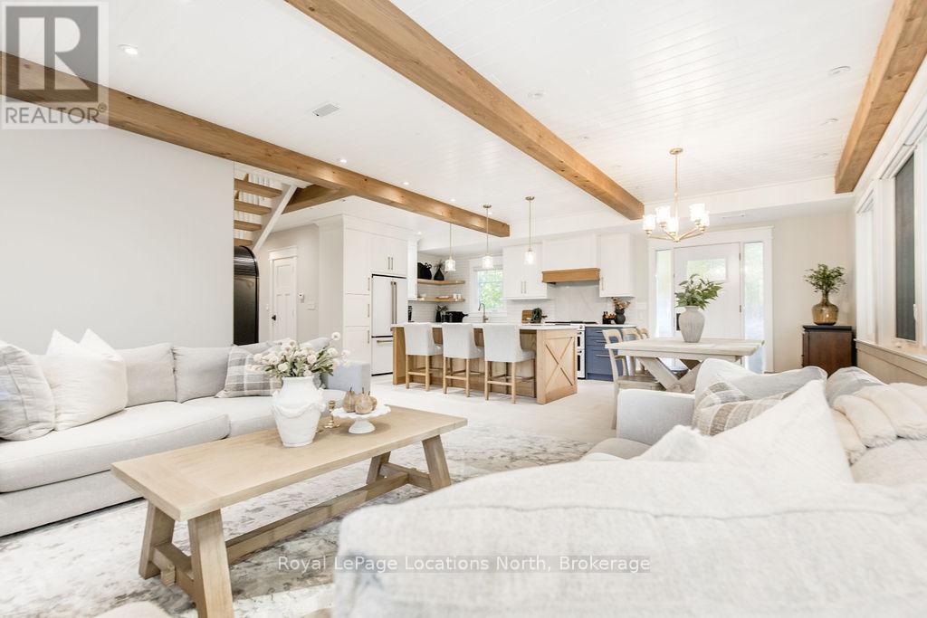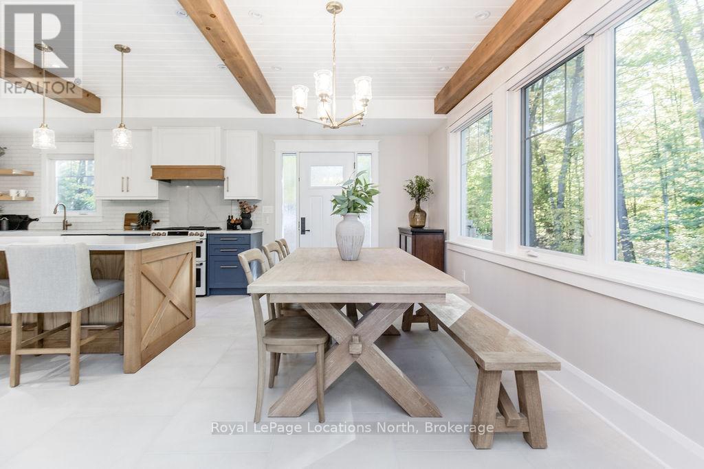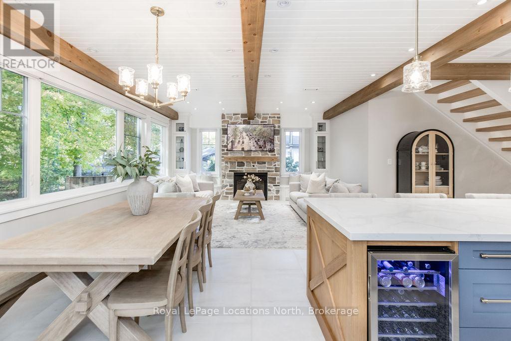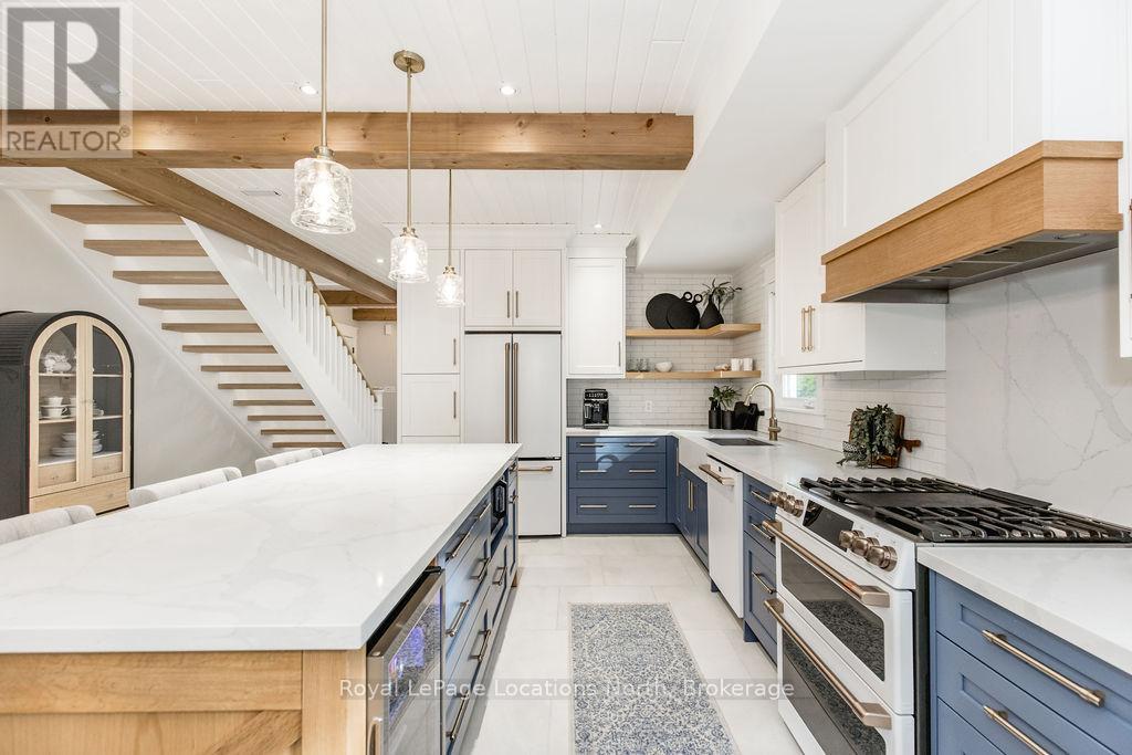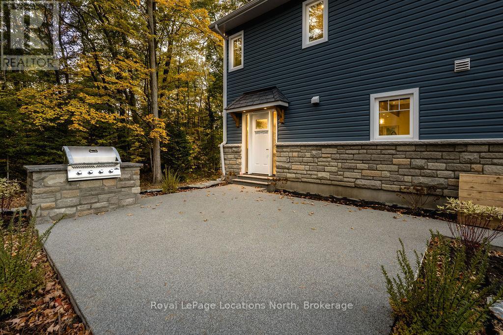 DREAM HOME WITH HEATED DRIVEWAY & WALKWAYS - Welcome to this stunning, custom-built 3 bed, 3 bath home showcasing exceptional craftsmanship, built in 2023, perfectly positioned backing onto protected land & directly across from the river in beautiful Wasaga Beach. Designed w/ a mix of modern luxury & timeless character, this home captures a century-home feel with its large mouldings, custom doors & wood beams w/ a custom-built stone fireplace accenting the main floor. Inside, the bright open-concept layout features wall-to-wall windows overlooking the forest, flooding the space w/ natural light. The custom kitchen is a true showpiece, showcasing a large quartz island, blue & white cabinetry, a mini wine fridge, & a full quartz backsplash. It's finished w/ a high-end signature line of Wi-Fi-enabled appliances, combining elegance & smart convenience for the modern homeowner. The dining area sits beside large windows, while the living room offers aged wood ceiling beams and tongue-and-groove ceilings that bring warmth & texture throughout along w/ the wide-plank white oak hardwood. Upstairs the hardwood stairs, lead to spacious bedrooms, each w/ custom walk-in closets, built-in desks, shiplap ceilings, & designer touches like wallpaper accents & skylights. The primary suite feels like a retreat, featuring a cozy fireplace, luxurious ensuite w/ floating tub, double quartz sinks, black cabinetry, & a walk-in closet w/ custom cabinetry & make up desk perfect for getting ready for the day.Luxury features include- Inside entry to garage with epoxy flooring + custom storage, hydronic in-floor heating, heated driveway & walkways while outdoors, enjoy the built-in BBQ, rubberized surfacing on patios w/ hot tub hook up, sprinkler system, & tranquil forest backdrop w/ cedar trees surround the patio for privacy.Interior features include motorized blinds, smart home system, security cameras, spray-foam insulation, high-efficiency boiler system, & a hard-wired generator. (id:64974)