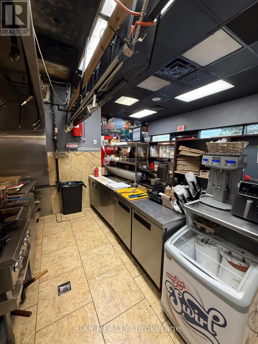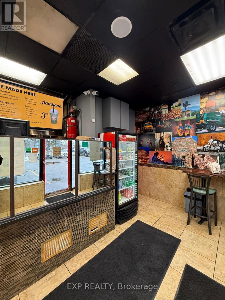 Unbeatable location. Restaurant for sale in a prime Brampton corner unit directly opposite Sheridan College, benefiting from constant student foot traffic, excellent visibility, and ample parking. Features a commercial hood, multiple stand-alone freezers, refrigerators, fryers, and essential kitchen equipment, allowing for efficient day-one operations. Low all-in rent of approx. $2,321/month keeps overhead exceptionally low. Suitable for Mediterranean and other approved cuisine concepts (Indian not permitted). Motivated seller. Rare opportunity to secure a high-traffic corner location at an attractive entry point. (id:64974)