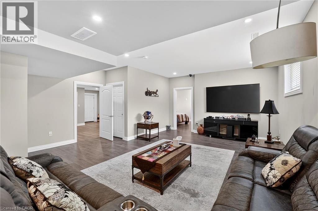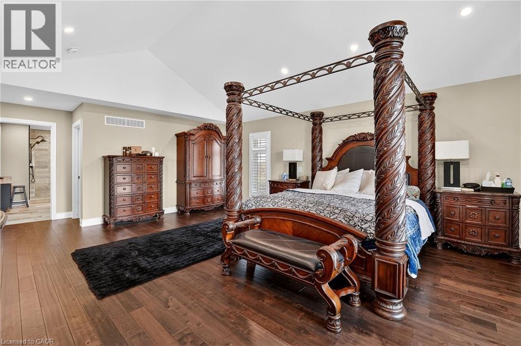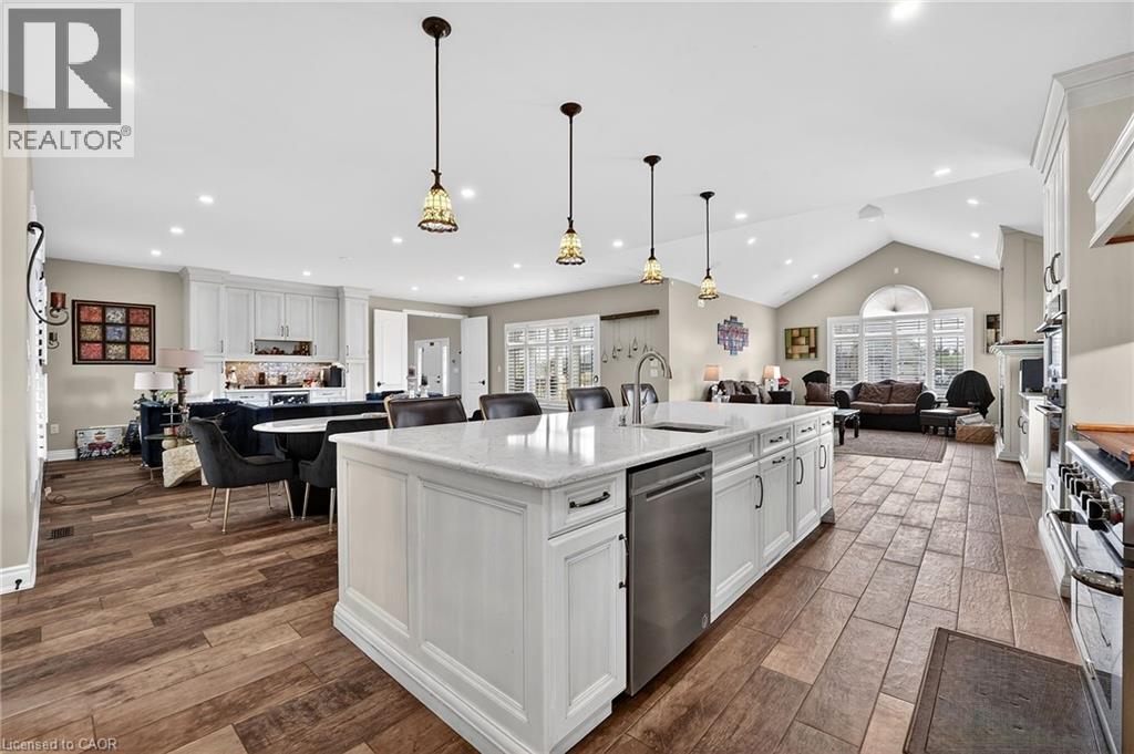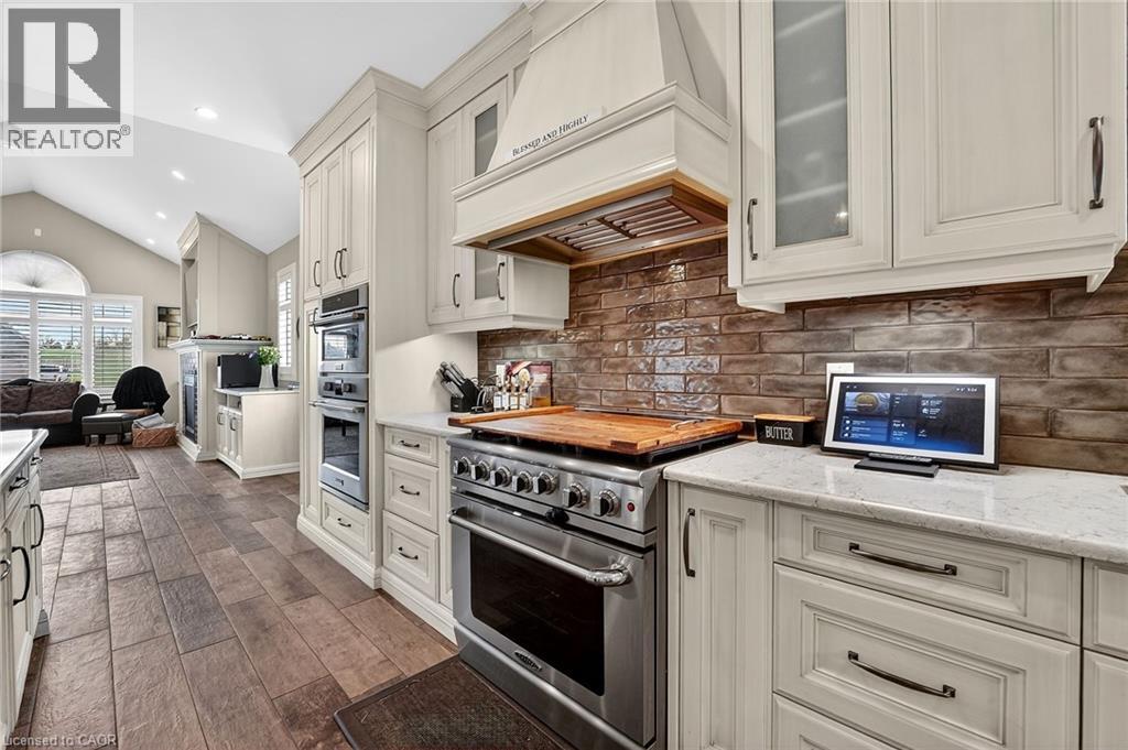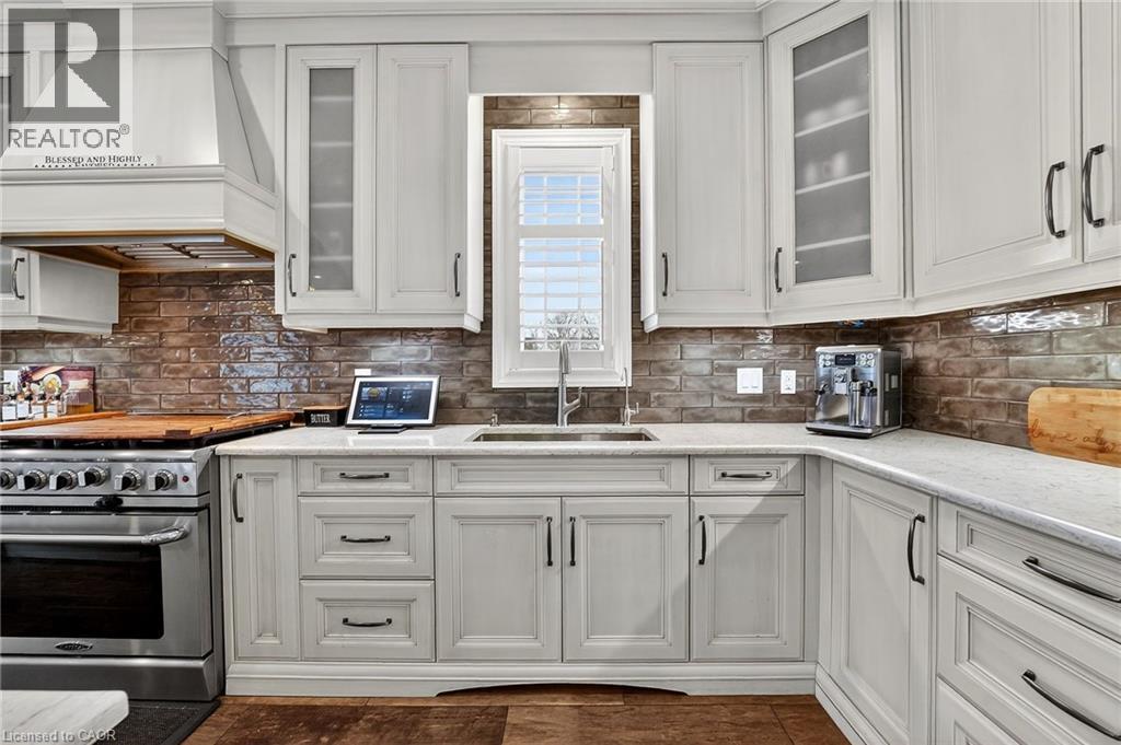 This custom built home commands attention. Set on a spacious 1 acre lot in the community of St. Anns, this stunning 2-storey home delivers over 6,500 sq ft of living space and two in-law suites that are ideal for multi-generational living. This home combines scale, craftsmanship, and a level of interior finish rarely found at any price point in West Lincoln. From the moment you step inside, the level of craftsmanship is evident. A grand two-storey foyer features polished tile and a dark hardwood staircase with iron spindles. The main level flows seamlessly between the great room, kitchen, and dining area. The chef's kitchen is a true showpiece: custom soft-grey cabinetry, a large quartz island, professional-grade gas range, double wall oven, and built-in fridge/freezer — with direct walk-out access to a covered outdoor sitting area. Inside or outside, this space was built to entertain. The family room is anchored by a cathedral ceiling, arched transom window, gas fireplace, and built-in media cabinetry. The main floor also features a dedicated home office, den, 3-piece bathroom, laundry room & mud room. The generous primary suite has engineered hardwood floors and a spa-quality ensuite complete with a freestanding soaker tub, frameless glass shower with dual shower heads, a double vanity with dark cabinetry and granite counters. Additional bedrooms are well-sized with engineered hardwood floors and quality finishes.A 5-piece bathroom serves the upper level with a tub and shower combination and double vanity. The finished walk-out basement is home to two completely self-contained in-law suites — each featuring a private kitchen, open-concept living area, bedroom, and full bathroom. The property also includes an attached garage with parking for 3 cars, a large private driveway, a covered front porch, and a shed. Two furnaces service different portions of the home, while one tankless hot water tank services the whole home. (id:64974)