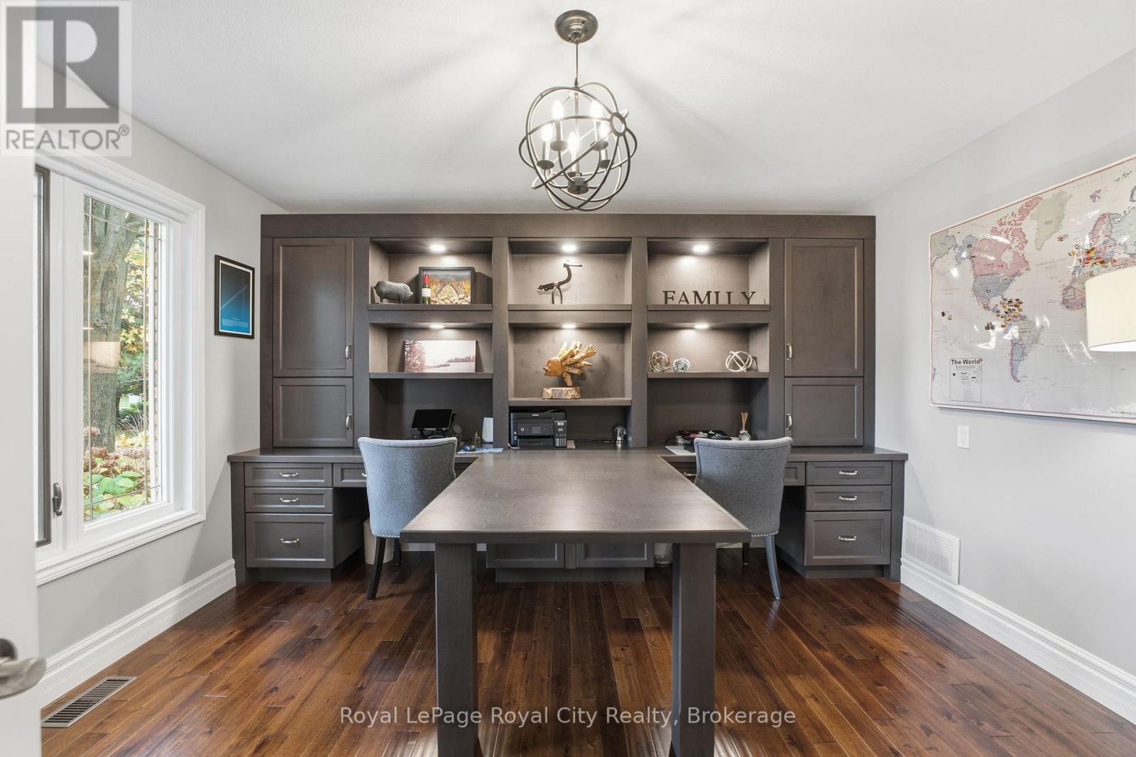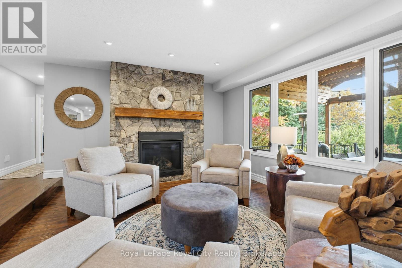 Welcome to a rare offering in one of the area's most coveted neighbourhoods.Set on a mature, tree-lined 1 ACRE lot with towering maples and a circular drive, this exceptional 1.5 storey home blends timeless character with REFINED MODERN LIVING. The reclaimed brick exterior hints at the craftsmanship within, while the private, RESORT STYLE BACKYARD is truly one of the finest in the community.Step outside and prepare to be impressed. A SALTWATER POOL anchors the outdoor oasis, complete with a charming POOL CABANA featuring a GAS FIREPLACE and multiple SEATING AREAS that invite relaxation and entertaining. A TWO LEVEL COMPOSITE DECK & COVERED PAVILION boasts a HOT TUB overlooking a second stone patio with FIREPIT and GAZEBO. Lush PERENNIAL GARDENS surround the entire yard, ensuring colour and beauty year round.Inside, the home is equally impressive. The main floor is designed for both connection and comfort, open concept ,yet thoughtfully defined. LARGE PRINCIPAL ROOMS, framed by GENEROUS WINDOWS, fill the space with natural light. The living room features a STONE FIREPLACE handcrafted by a local mason, paired with a RICH TIMBER MANTLE that becomes the heart of the home.The grand MAIN FLOOR PRIMARY suite is a sanctuary of its own, offering an oversized bedroom, a dedicated DRESSING ROOM, and serene views of the grounds. The versatile kitchen is ideal for both everyday living and entertaining, complete with GAS COOKTOP, DOUBLE OVENS, GRANITE island, WALK IN PANTRY, and a BEVERAGE STATION. Upstairs, two additional bedrooms share a full bath.The fully finished WALK UP BASEMENT adds exceptional functionality with a BILLIARDS AREA, BAR for entertaining, TV/MEDIA SPACE, GAMES ROOM and three additional bedrooms, perfect for extended family or guests.A rare opportunity to own a home that combines CRAFTSMANSHIP, LUXURY AND PRIVATE outdoor living all MINUTES TO AMENITIES and conveniences of the South End of Guelph and quick access for commuters. IMPRESSIVE. (id:64974)