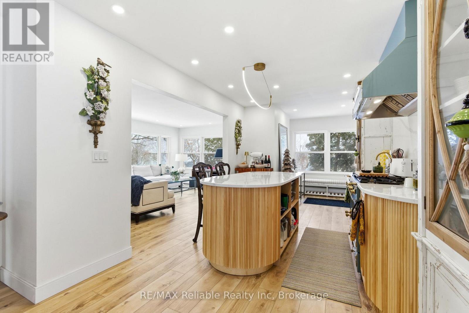 Welcome to this beautifully renovated brick bungalow, perfectly positioned overlooking a charming parkette & the Goderich Harbour. Thoughtfully updated throughout, this home offers exceptional main-floor living with breathtaking views of Lake Huron sunsets framed by large, light-filled windows. The stunning newer chefs kitchen is the heart of the home, featuring high-end appliances, quartz island and backsplash, and elegant cabinetry-ideal for both everyday living and entertaining. Efficient boiler heating system and heat pump provides economical, even warmth throughout the home, ensuring year-round comfort. Step outside to a newly landscaped yard complete with black fence enclosing the rear yard, making it perfect for pets. A private patio offers a wonderful space to enjoy warm-weather evenings & outdoor relaxation. Extensive updates include new flooring throughout, updated bathrooms, new electrical panel with additional wiring upgrades, heat pump, new driveway & walkways w/ turf stone pavers. Lovingly maintained & move-in ready, this home is an ideal choice for those looking to downsize without compromise-offering comfort, style, and a beautiful place to call home. Located in the historic Town of Goderich- which sits along the stunning shores of Lake Huron. Enjoy strolls along the boardwalk, the iconic octagonal town square, beautifully maintained gardens, a full-service hospital, wonderful restaurants, charming independent shops, and convenient big-box amenities. The harbour, marina, & Maitland River are just steps away, making this an ideal location for boating, fishing & water sports enthusiasts. Additionally, only a short walk west on Caledonia Street at the corner of Caledonia & Waterloo, you'll find access to a scenic trail connecting to North Harbour Road, Menesetung Bridge, and the G2G Trail-perfect for hiking and cycling lovers alike. Come check it to see everything that this home and Goderich & area has to offer! See the video too! (id:64974)