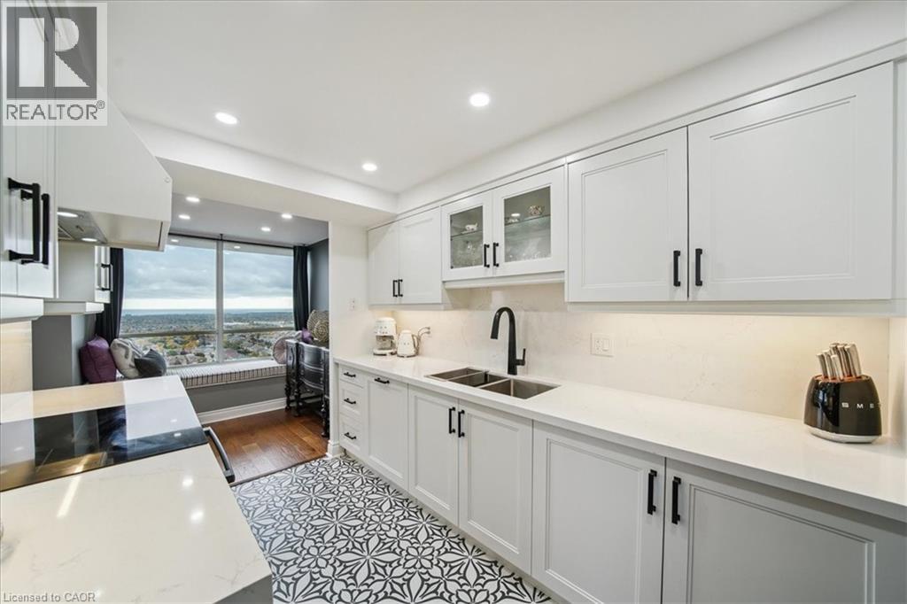 Set majestically high on the 26th floor of the Phoenix Condos, this rarely offered corner suite offers 1,280 sq. ft. of elegant living space with panoramic, unobstructed city and lake views. Featuring southeast facing exposure with a private balcony, this fully renovated residence combines style and functionality in a prime location just minutes from Square One, GO Transit, major highways, shopping, schools, and parks. Beautifully appointed interior upgrades include walnut-stained engineered hardwood floors, extra-deep baseboards, smooth ceilings and pot lights (2024). The modern kitchen is equipped with high-end Fisher & Paykel, Bosch, Sharp and Asko appliances, custom cabinetry, quartz counters, and a hidden stackable washer/dryer. The inviting open-concept layout separates two spacious bedrooms for maximum privacy, each offering walk-in or built-in California Closets. Two fully renovated bathrooms (2021) feature premium fixtures and spa-inspired finishes. Additional highlights include a full mirrored entry wall (2021), custom window coverings (2024), gallery-style hallway, two furnaces (with new fan coil insulation 2024), and two owned parking spaces. Residents enjoy resort-style amenities including a 24-hour concierge, indoor whirlpool, sauna, fitness centre, tennis court, squash court, party room, library, and landscaped outdoor spaces. (id:64974)