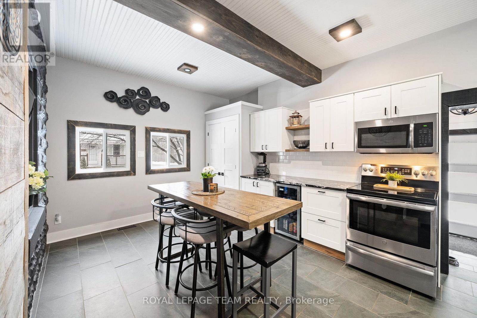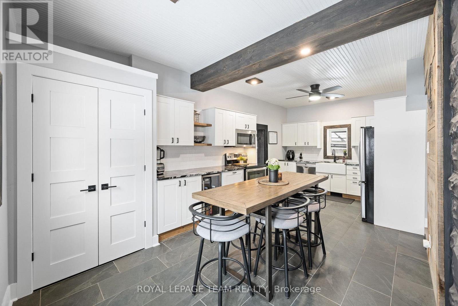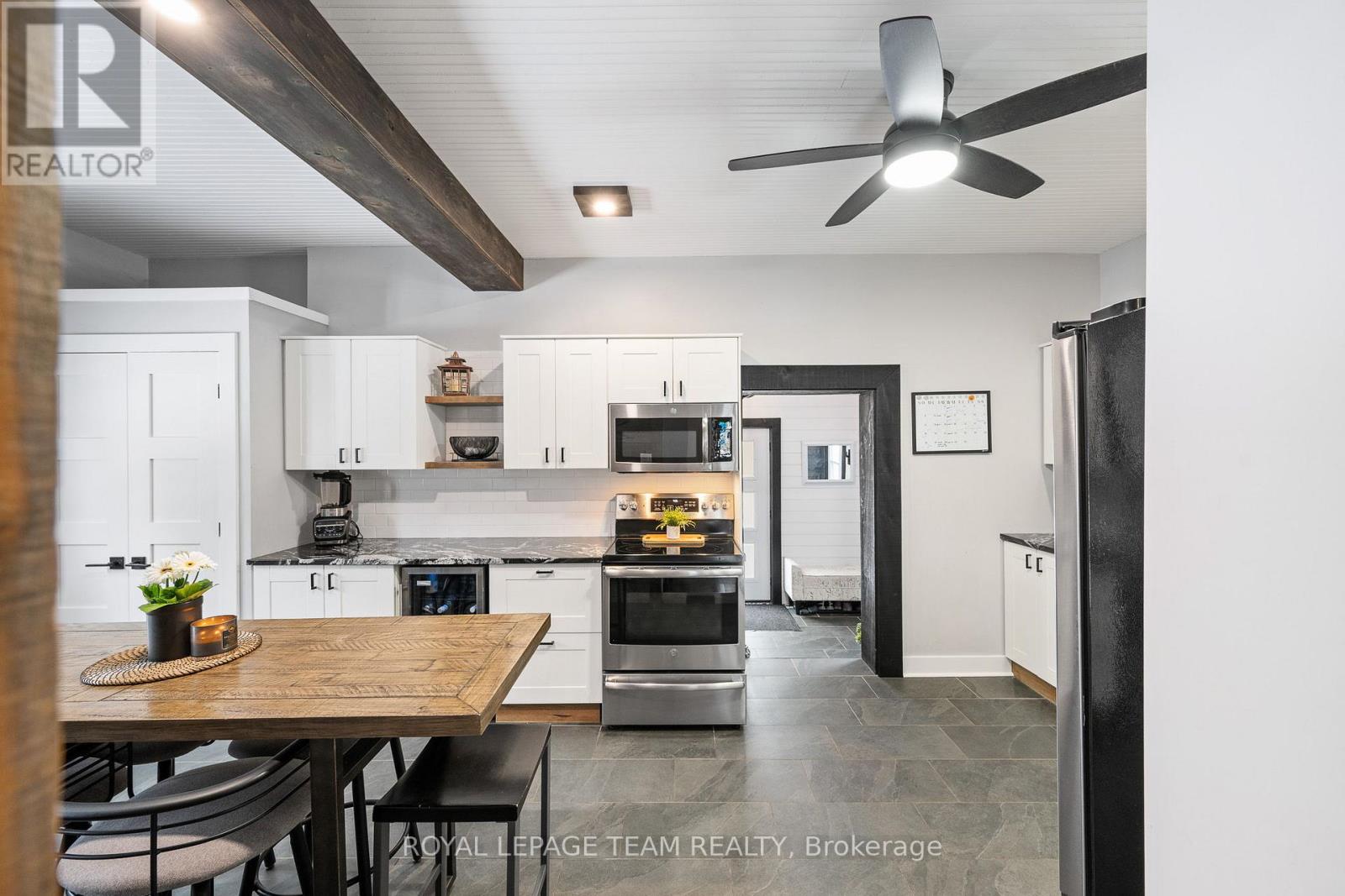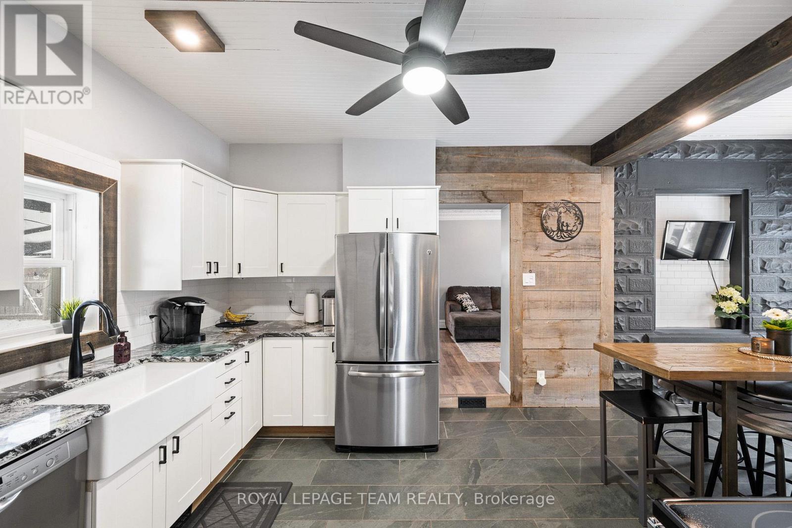 Beautifully renovated home blending modern upgrades with timeless character, ideally situated on a desirable corner lot. Extensive improvements since 2020 include all new flooring throughout, fresh neutral paint, updated lighting, and widened interior doorways with modern 4-panel doors and hardware. The main floor features a fully redesigned kitchen with GE stainless steel appliances, granite countertops, white shaker cabinetry, subway tile backsplash, LED pot lighting, and a 32" farmhouse sink. Original 1920 tin ceilings and crown moulding have been refinished in crisp white, adding charm and character. A convenient mudroom addition off the kitchen offers additional storage and access to the backyard, along with a stylish black steel entry door. Upstairs, the second floor includes a renovated full bathroom with new plumbing, a large porcelain tub with full-height tile surround, new vanity and toilet, plus a custom barn board accent wall. The primary bedroom features a newly created walk-in closet. The third floor offers additional living space with updated laminate flooring. Step outside to enjoy a fully fenced yard with double gate access from the street, perfect for trailers, equipment, or added convenience. A standout feature is the authentic original barn with loft, ideal for a workshop, hobby space, or at-home business setup. Additional updates include armour stone front steps, refinished staircases on all three levels, interior barn doors, updated half bath with full-size stackable laundry and new mechanicals including furnace (2024), hot water tank (2020, gas), air conditioning (2020) and sand point well (2025). Windows were previously updated (approx. 2013). Located within walking distance to the public school, post office, and general store, and just a 2-minute drive to the grocery store, this home offers the perfect blend of small-town convenience and modern living.All measurements as per Iguide Floorplan. Buyer to confirm all room sizes. (id:64974)