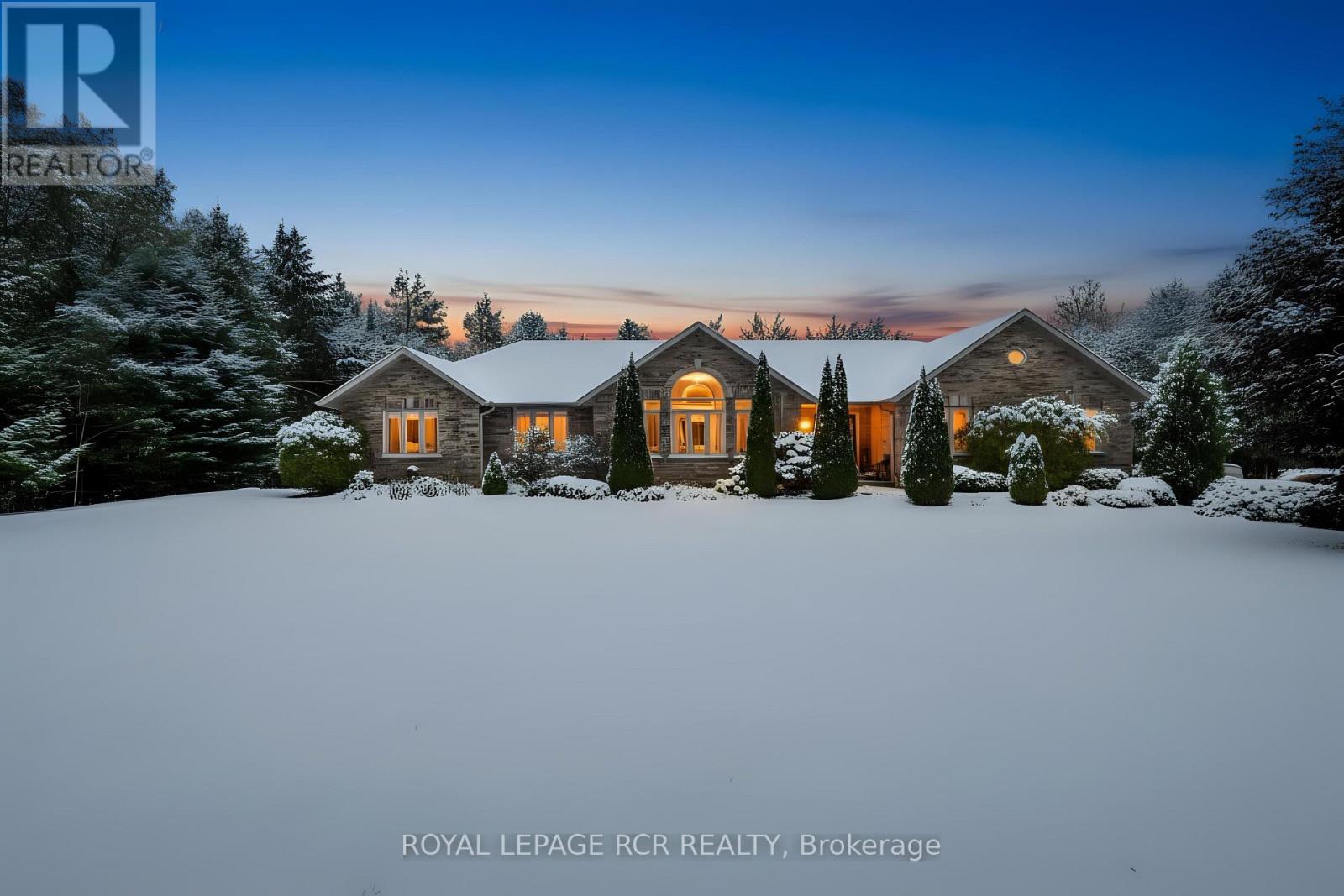 Beneath a blanket of snow, 3.9 private acres quietly prepare for the arrival of spring! WELCOME HOME to this custom-built, all-brick executive bungalow offering over 4,500 sq ft of finished living space, thoughtfully designed for refined multi-generational living. Expansive windows frame serene views of the surrounding landscape, while cathedral ceilings and a dramatic floor-to-ceiling stone fireplace create architectural presence and warmth at the heart of the home. From the private patio to the forested walking trails, seasonal creek, and perennial gardens, this property offers year-round natural beauty - all on a paved road just 15 minutes north of Orangeville and approximately 40 minutes to Brampton and the GTA. THIS HOME IS PERFECT FOR YOU IF YOU...LOVE bright, sophisticated living spaces finished with hardwood, stone, and ceramic flooring throughout the main level. WANT a spacious and functional layout featuring 6 bedrooms and 4 bathrooms, including three generous main-floor bedrooms and a primary retreat with walk-in closet and 4-piece ensuite. APPRECIATE a chef-inspired kitchen with maple cabinetry, quartz countertops, stainless steel appliances, and a substantial island designed for gathering. NEED true flexibility. The fully self-contained walk-out lower level offers three additional bedrooms, two bathrooms, a full kitchen, separate living and family rooms, in-floor radiant heating, soundproofing, large windows, and private patio access. DREAM of peaceful country living with space, privacy, and year-round natural beauty. An oversized three-bay garage completes this exceptional offering. A rare opportunity to secure executive country living with versatility and lasting value. (id:64974)