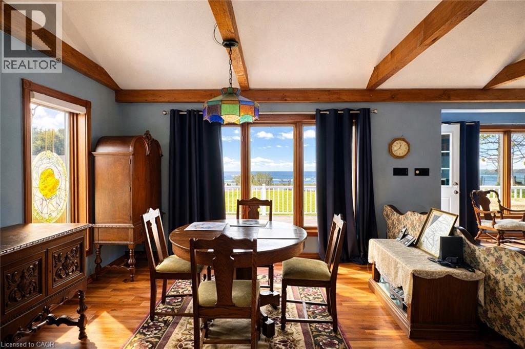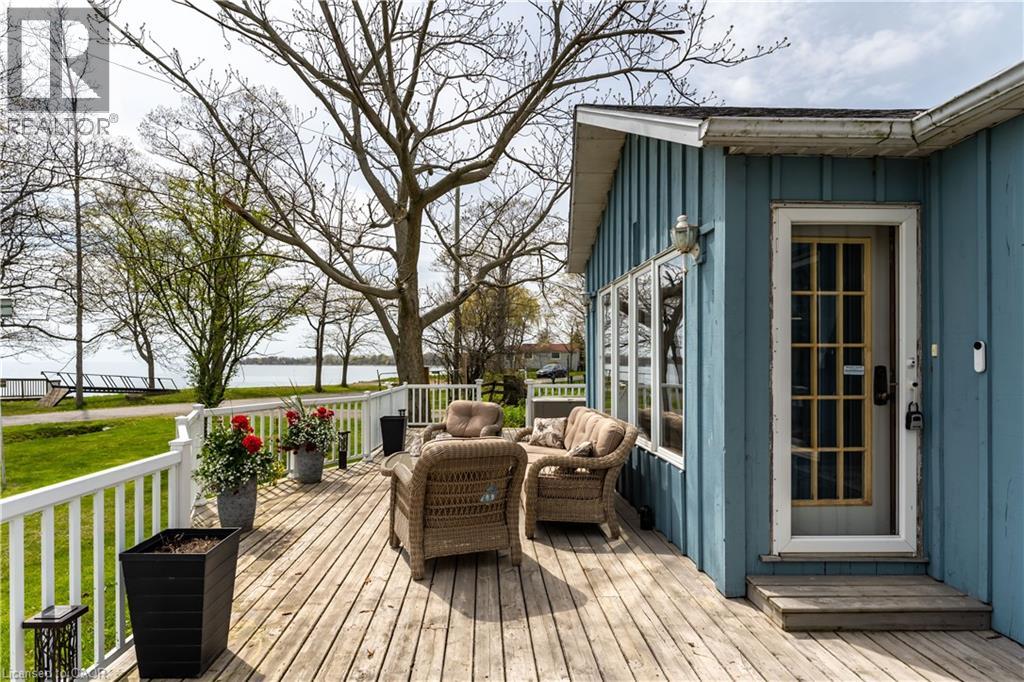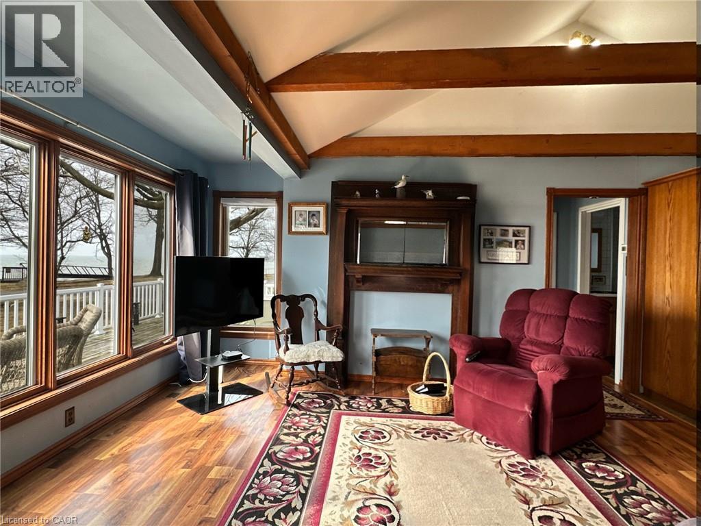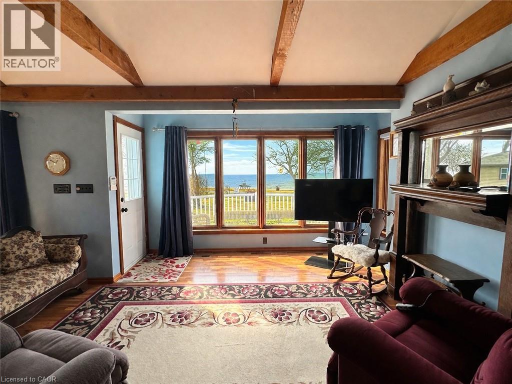 Waterfront retreat on a quiet road owning the north and south (waterside) of the road. This year-round 2-bedroom home offers the perfect blend of relaxation and recreation, featuring just over 70 feet of Lake Erie water frontage and 2022 Wilkinson built break wall, plus a natural sand and pebble beach for endless summer enjoyment. Step inside to a bright, open-concept living/dining/kitchen space highlighted by vaulted, beamed ceilings and a wall of windows showcasing lake views and awesome sunsets. The inviting layout is ideal for both everyday living and entertaining. The home includes a basement (1992) providing ample storage space and development potential, while the expansive deck is perfect for morning coffee or hosting family and friends against a beautiful waterfront backdrop. Plenty of driveway parking accommodates all your vehicles and recreational toys. Additional updates include roof shingles and the added peace of mind of a backup generator. A rare opportunity to own a lakeside escape—perfect as a year-round residence or weekend getaway! (id:64974)