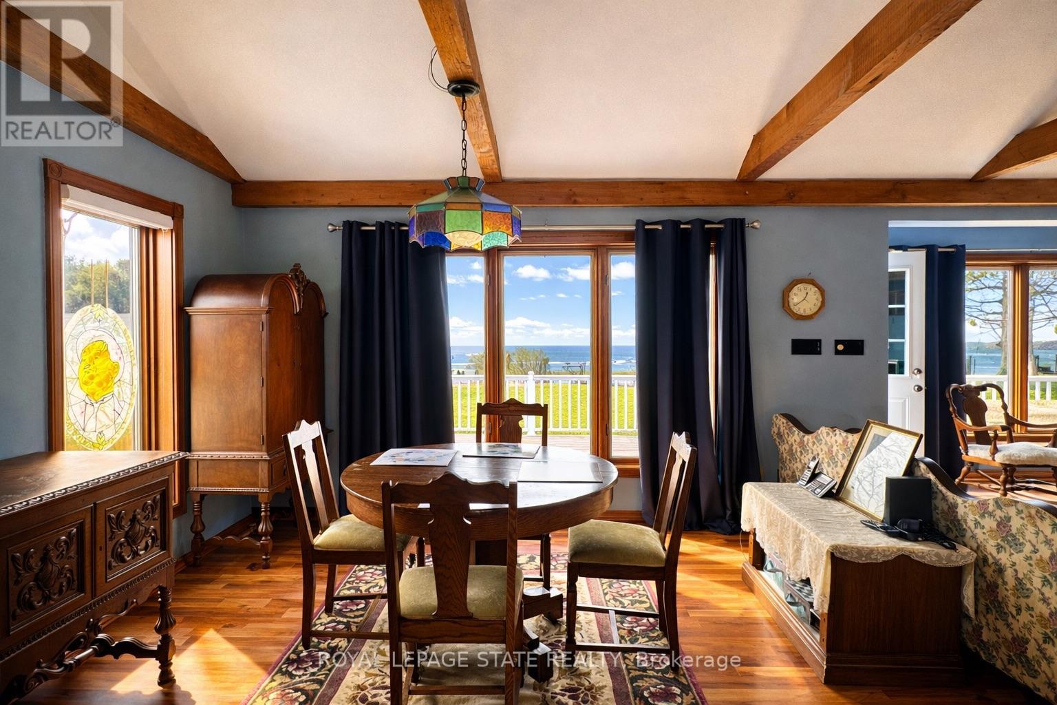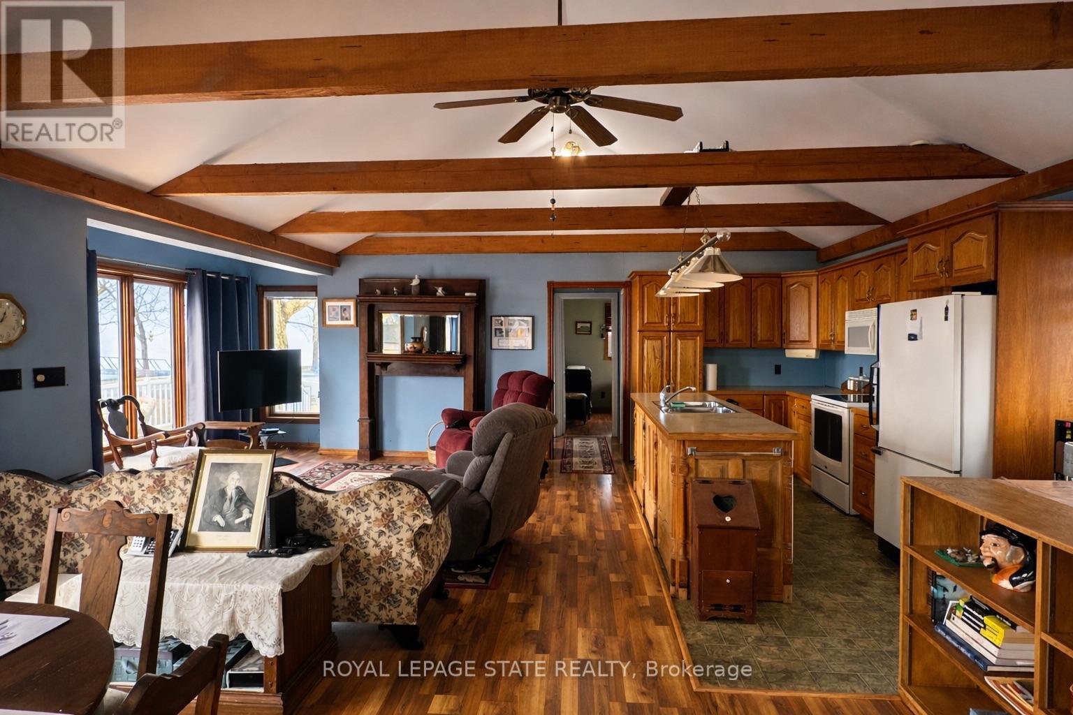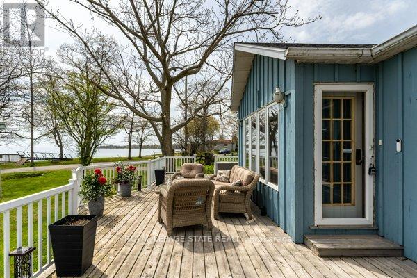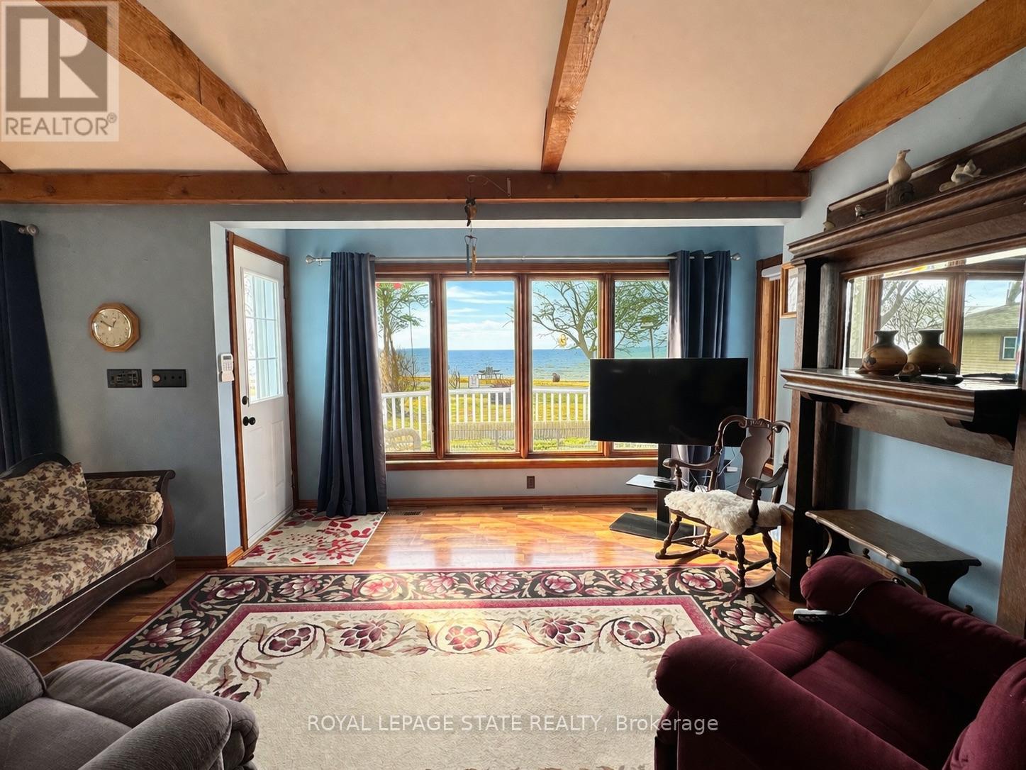 Waterfront retreat on a quiet road owning the north and south (waterside) of the road. This year-round 2-bedroom home offers the perfect blend of relaxation and recreation, featuring just over 70 feet of Lake Erie water frontage and 2022 Wilkinson built break wall, plus a natural sand and pebble beach for endless summer enjoyment. Step inside to a bright, open-concept living/dining/kitchen space highlighted by vaulted, beamed ceilings and a wall of windows showcasing lake views and awesome sunsets. The inviting layout is ideal for both everyday living and entertaining. The home includes a basement (1992) providing ample storage space and development potential, while the expansive deck is perfect for morning coffee or hosting family and friends against a beautiful waterfront backdrop. Plenty of driveway parking accommodates all your vehicles and recreational toys. Additional updates include roof shingles and the added peace of mind of a backup generator. A rare opportunity to own a lakeside escape-perfect as a year-round residence or weekend getaway! (id:64974)