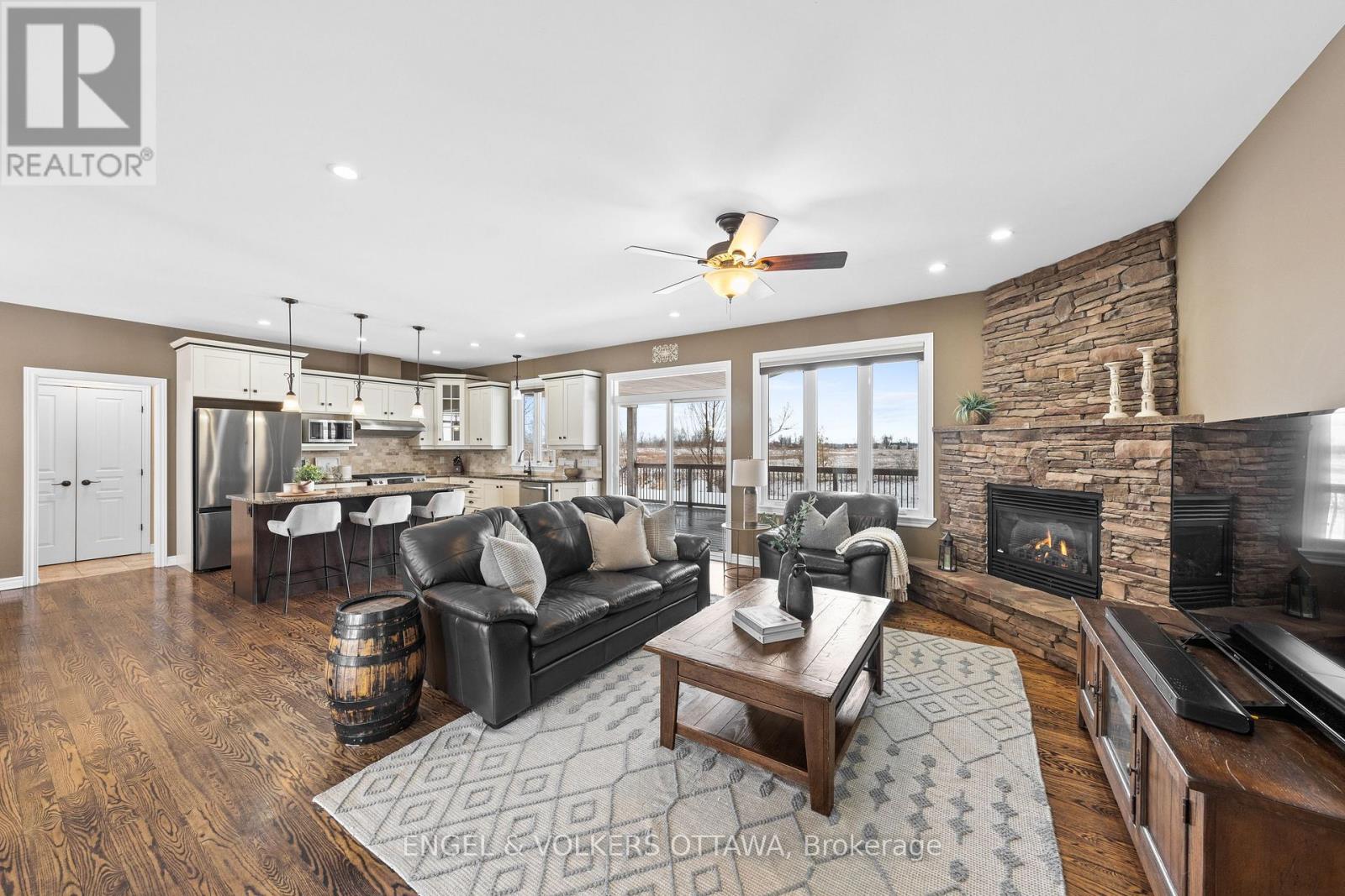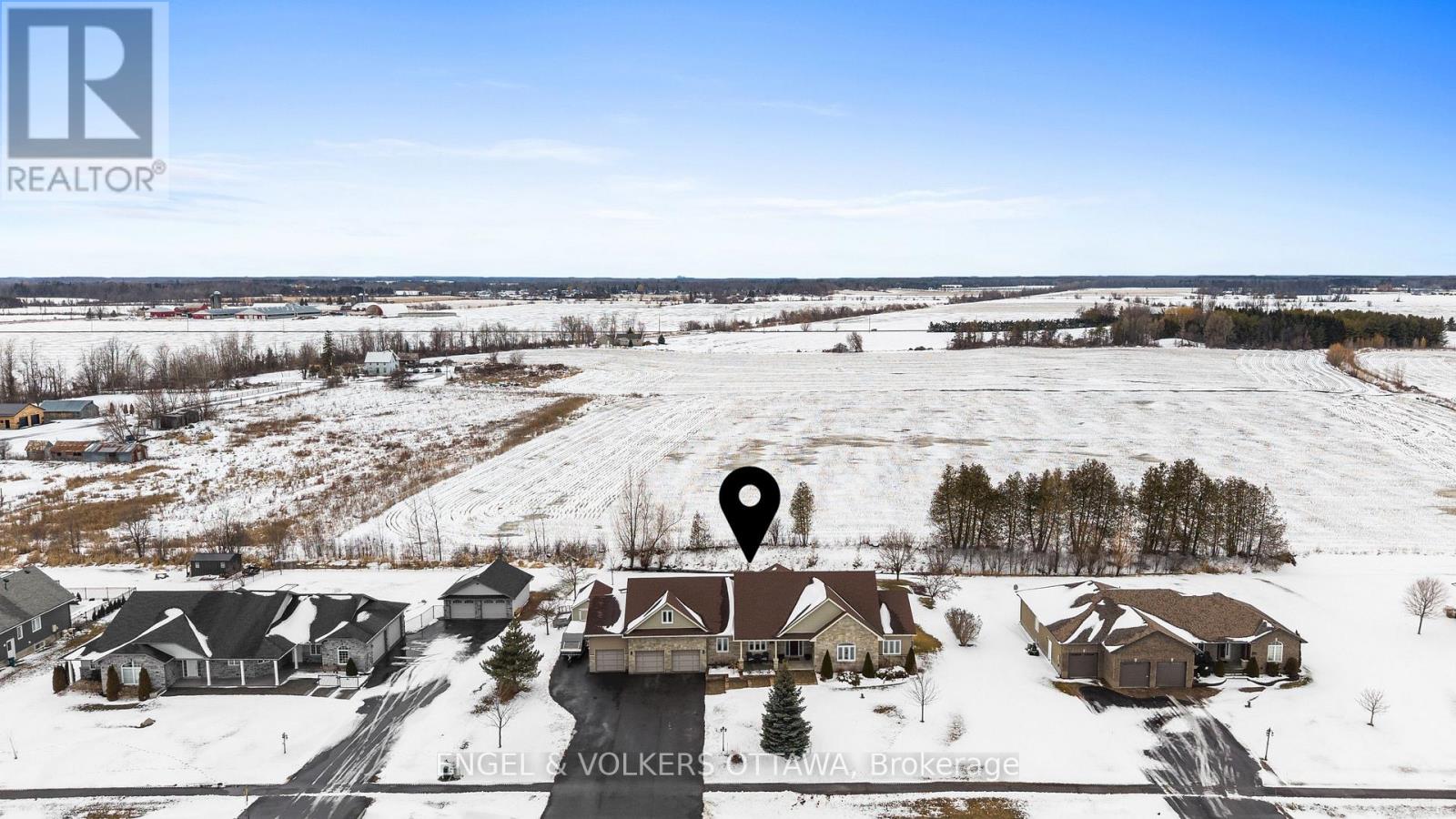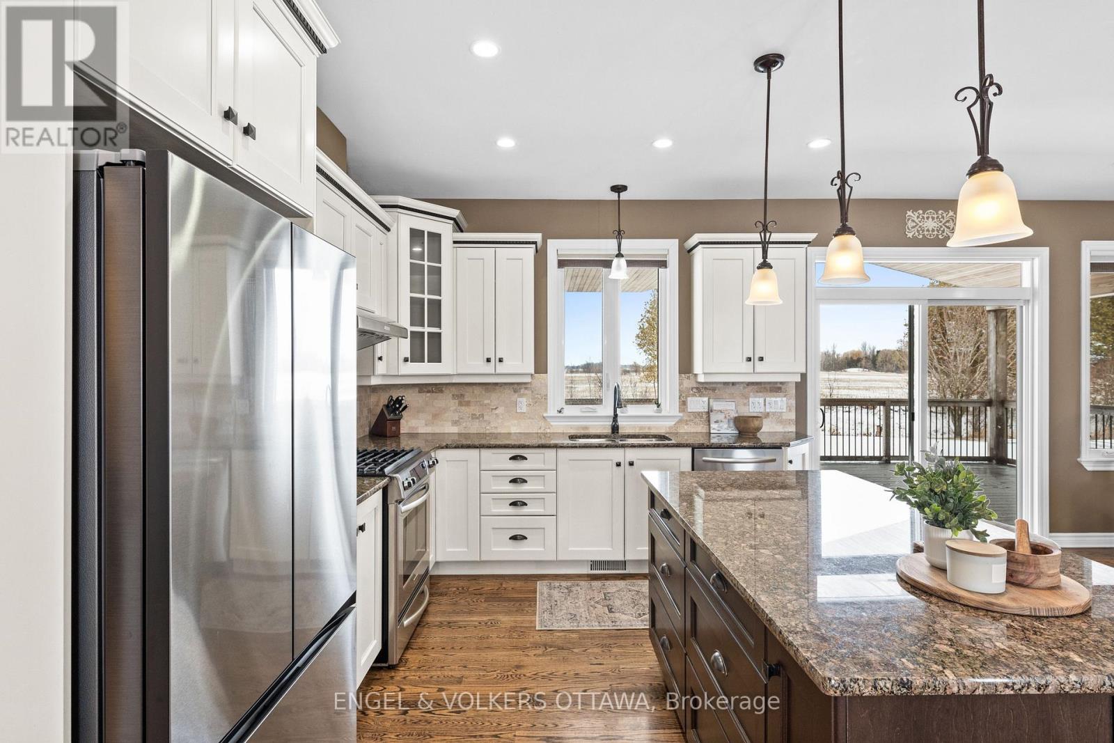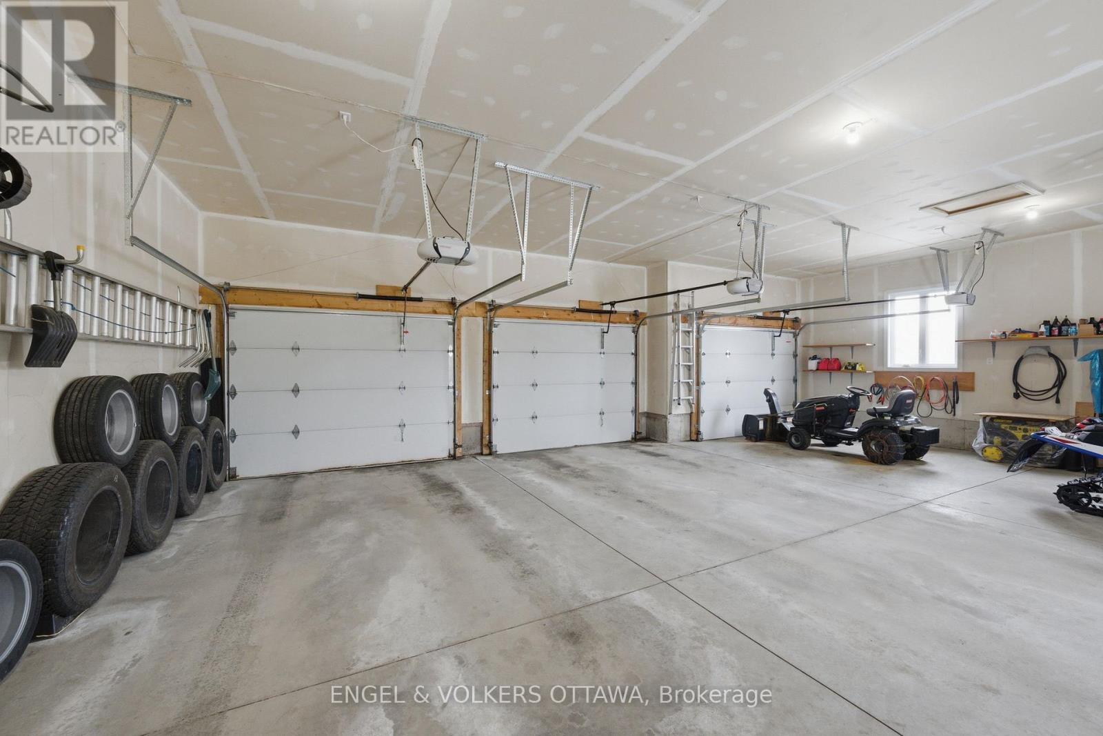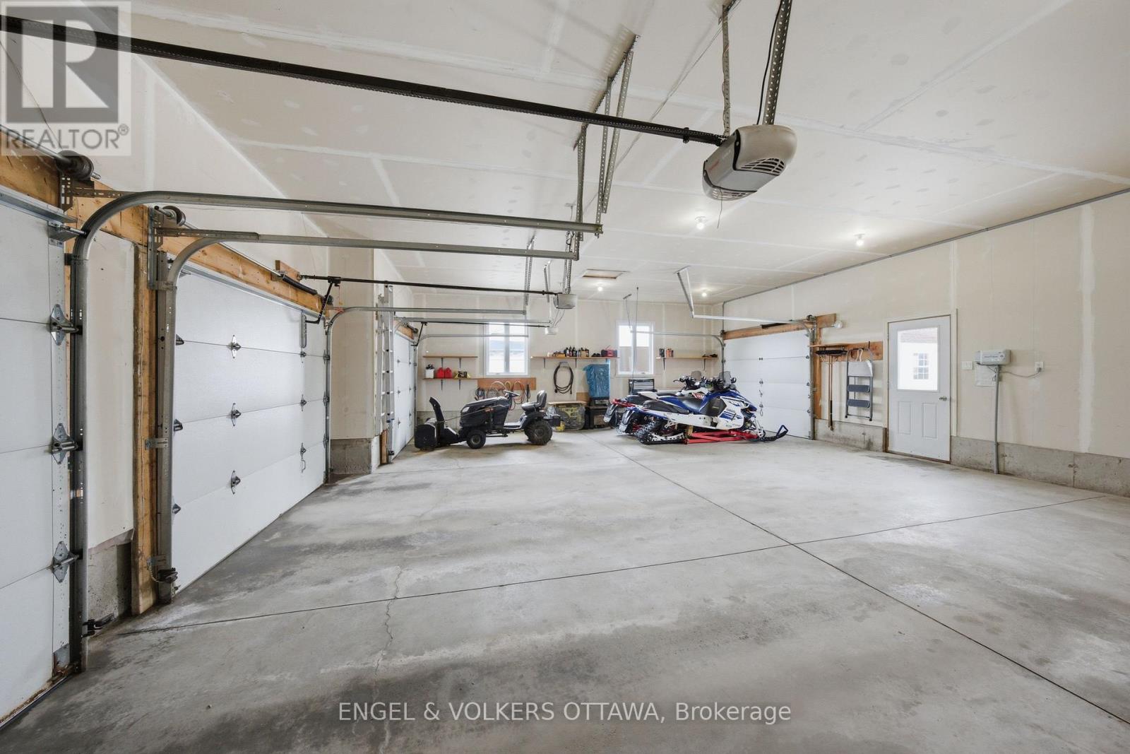 Welcome to this exceptional custom Ian Drew home, perfectly positioned on an exclusive cul-de-sac with no rear neighbours, offering privacy and refined living. Impeccably maintained, the property features elegant front landscaping with a stone walkway, raised garden beds, and an oversized paved driveway with additional side parking. Designed for elevated outdoor living, the impressive 30' x 16' covered rear deck showcases a vaulted cedar ceiling and low-maintenance composite decking, an ideal space for entertaining or relaxing in total privacy. The backyard also includes a premium storage/work shed and a RainBird 9-zone irrigation system. Inside, 9-foot ceilings enhance the open-concept living, dining, and kitchen areas, complemented by hardwood floors, granite countertops, and a cozy gas fireplace anchoring the space. The primary suite offers a spacious walk-in closet and a luxurious ensuite with a walk-in shower and soaker tub. Two additional bedrooms, one featuring a vaulted ceiling, are serviced by a full bath, while the main level is completed by a laundry/mudroom and powder room. A versatile loft provides the perfect space for a media room, home office, or additional lounge area. The lower level provides a wide-open canvas, whether for recreation, fitness, or future finishing. The oversized 3-car garage is insulated and drywalled, featuring a full rear garage door for backyard access and hot/cold water taps. Extensive mechanical upgrades include a Kinetico water system, updated hot water tank and pressure tank, and a fully serviced system with recent water testing available. A GenerLink 240V connection offers whole-home generator capability. A rare offering combining quality craftsmanship, thoughtful design, and upscale features, tailored for the most discerning buyer. Walking distance to Foodland, No Go Coffee, Red Dot Cafe and the Osgoode Link Pathway, a trail over 20 km long, connecting Osgoode to Leitrim Road and the new LRT station. (id:64974)