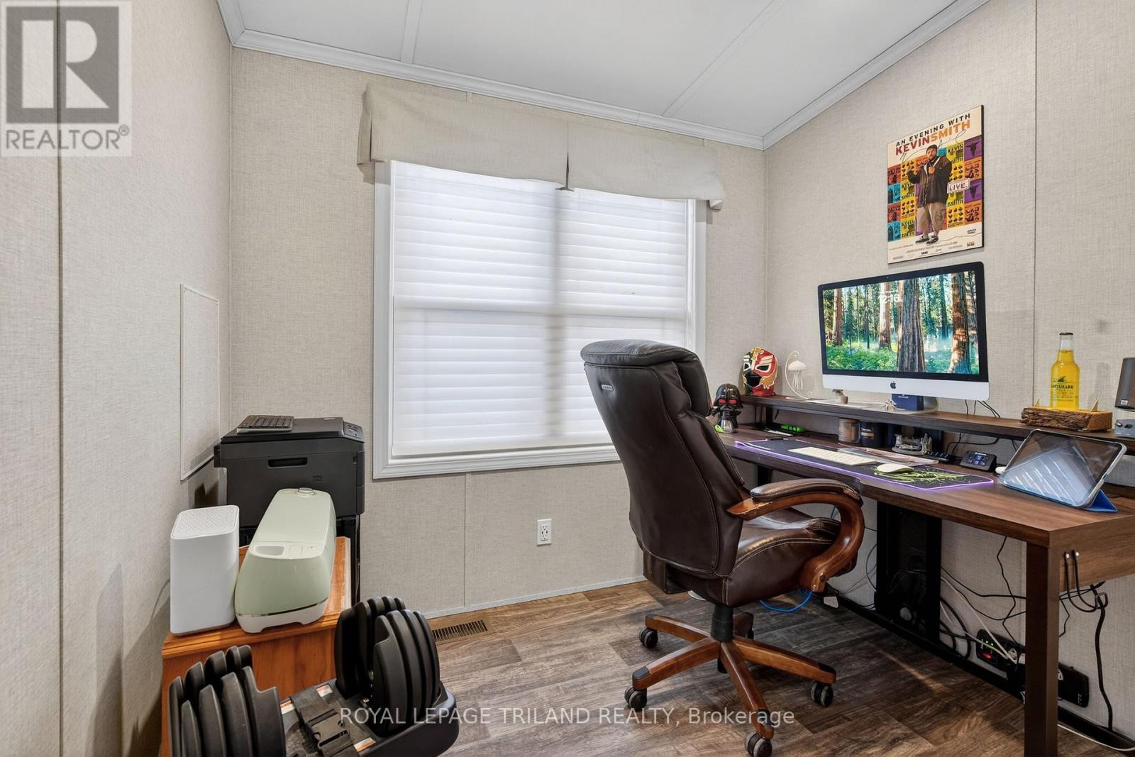 Welcome to Komoka - where simplified living meets elevated design in a welcoming 55+ community. This beautifully maintained 2-bedroom, 2-bath home offers the perfect blend of comfort, functionality, and contemporary style - without the upkeep of a larger property. The heart of the home is a show piece, white shaker kitchen featuring a massive island designed for gathering, hosting family, or enjoying quiet mornings with coffee. Custom built-in cabinetry throughout the kitchen, bedrooms, and bathrooms provides exceptional storage - giving you space for what matters, without the clutter. Step through the patio doors off the living room onto a spectacular wrap-around 400 sq ft covered deck complete with pot lights and hot tub - the perfect extension of your living space. Whether you're entertaining, relaxing with a book, or enjoying warm summer evenings, this outdoor retreat delivers comfort without maintenance. Here, you're not just downsizing - you're upgrading your lifestyle. Enjoy access to a licensed community centre, swimming pool, dog park, and dedicated event spaces that make it easy to stay active and connected. Low maintenance. Strong sense of community. Thoughtfully designed living. (id:64974)