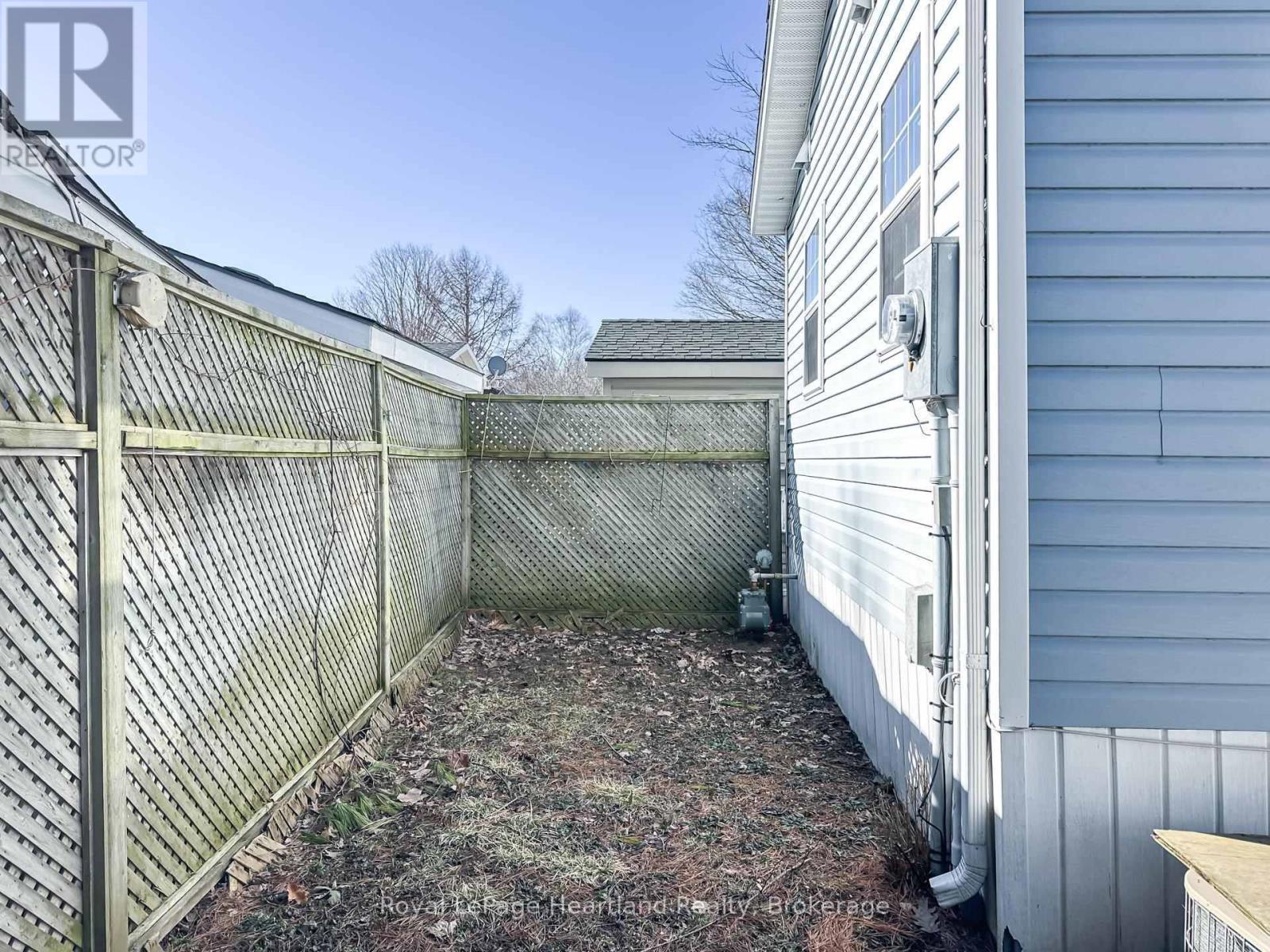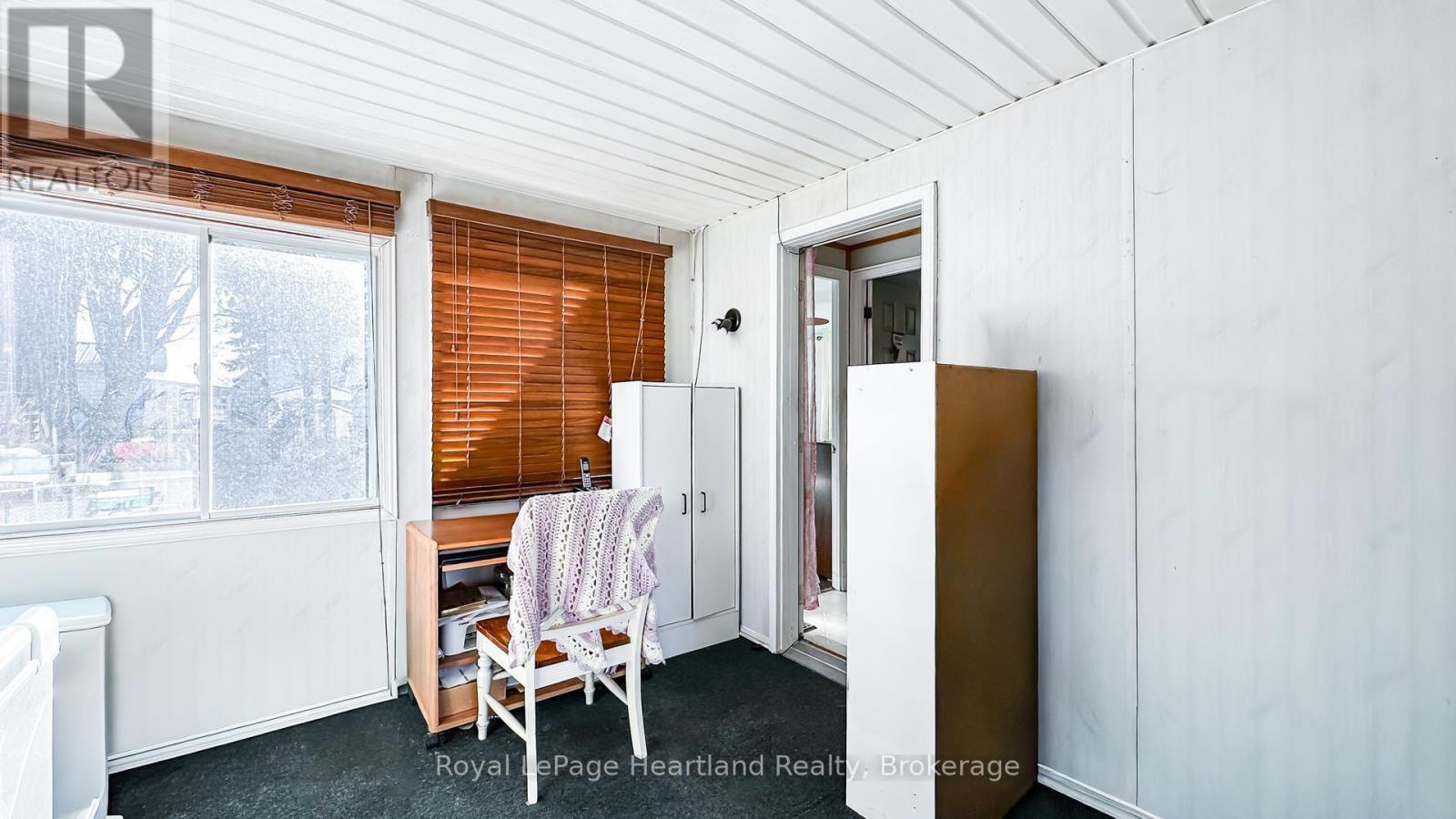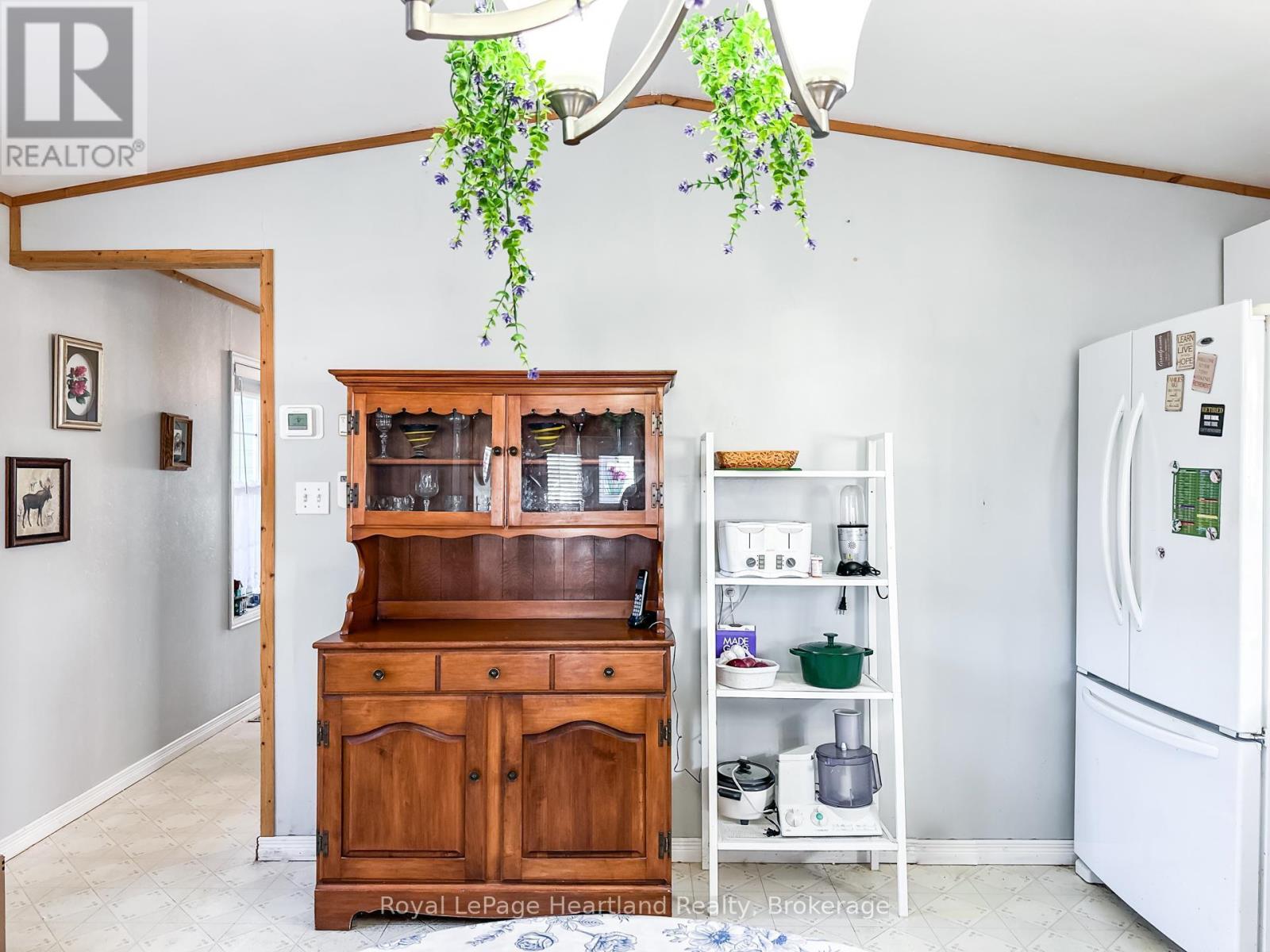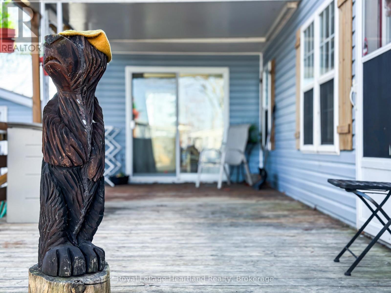 Is retirement and the sandy beach calling you? Spring is in full swing and this affordable and inviting 2-bedroom, 1-bath home offers comfort and charm in Meneset on the Lake. The open-concept kitchen with a dining area offers an abundance of cupboard space and countertop surface for food preparation. This space flows seamlessly into a spacious and cozy living room adorned with California shutters and stylish shiplap accent walls. Snuggle in and read a book in front of the gas fireplace. The layout includes a guest bedroom and a private primary bedroom. Enjoy morning coffee in the year-round bright sunroom or step outside onto the partially covered deck which provides the perfect spot to relax or entertain. This home is ideal for buyers looking to add their own personal touches, nestled in the land lease, 55+ community that offers access to a private sandy beach and an active clubhouse and community gardens. Store seasonal items in the shed, putter away in the gardens, relax on the deck or stroll to the beach for the day; the options are endless! Conveniently located near scenic trails, a golf course, and all the amenities in the Town of Goderich, this property presents a fantastic opportunity to enjoy both lifestyle and value. (id:64974)