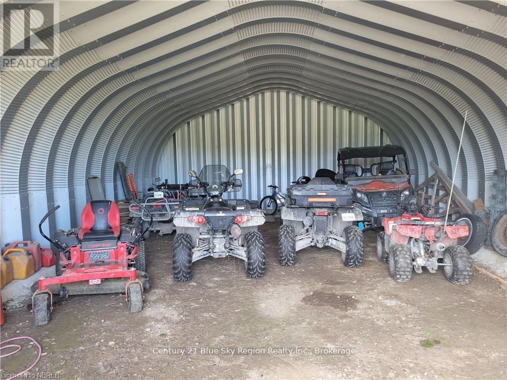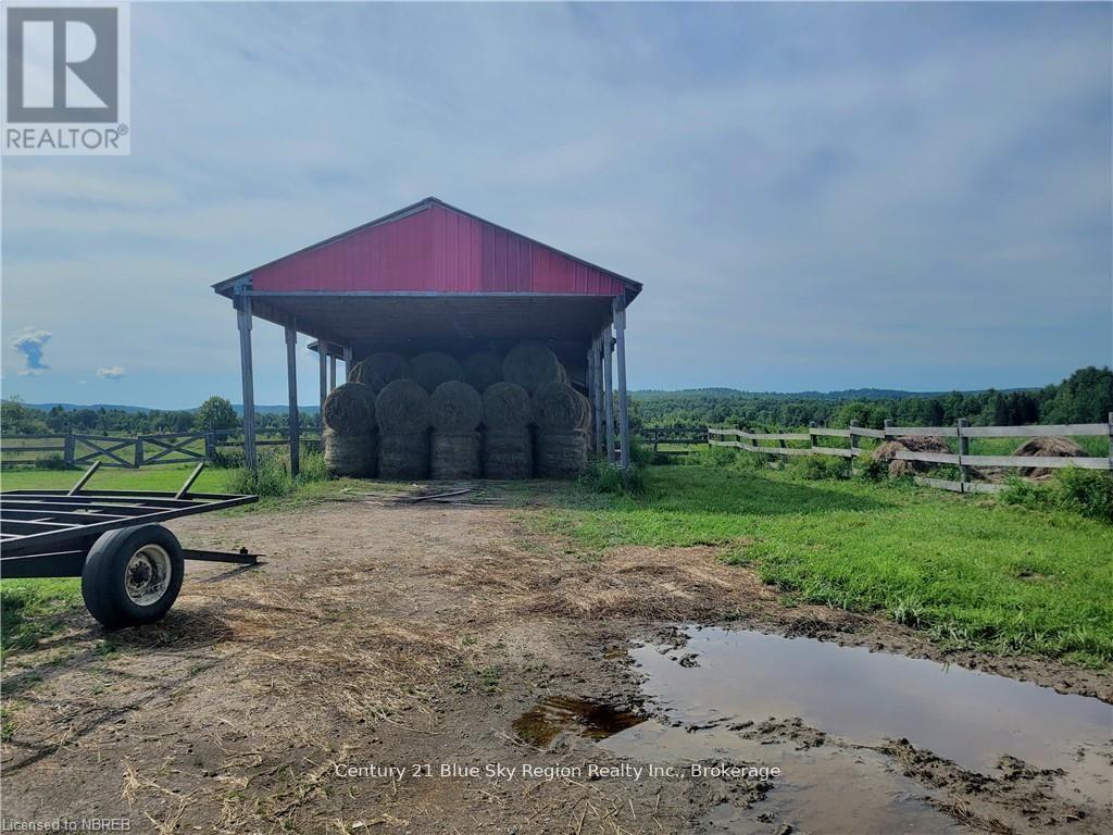 Working 60+ acre hay farm with approximately 30 acres cleared and in production. Fenced paddocks and pastures currently support five horses, with room to expand. A 23' x 60' barn provides excellent hay storage and includes a horse run with direct paddock access. The custom-built two-bedroom home features a maintenance-free exterior, drive-through side carport, and covered front carport. Inside, the open-concept kitchen and living area are highlighted by 10' vaulted pine ceilings, creating a bright, welcoming space filled with natural light. Patio doors open to a 10' x 34' wrap-around covered deck connected to a 32' x 6' porch, overlooking scenic pastures and woods-ideal for relaxing or entertaining. The fully finished basement offers a large rec room with an electric fireplace and a rough-in for a wood stove or fireplace, an additional bedroom, a utility room, and generous storage. Comfort features include forced-air propane heating, central air, and a new heat pump. A practical 6' recessed boot and shoe area is located at the main entrance. Dug well (4-5 tiles deep) with sediment filtration system. 200-amp electrical service. Direct access to ATV and snowmobile trails connecting to the Ontario trail system-no trailering required. A 28' x 32' Quonset garage with its own fuel tank and pump provides ample storage for equipment and recreational vehicles. Additional garden and tool sheds included. Sale includes a 60 HP tractor with cab, A/C, bucket, hay pick, snow blower, backhoe, brush hog, plus hay equipment, including a 9' blade, rake, baler, and approximately 80 bales of hay. Productive land, solid infrastructure, and strong potential for expanded or diversified farming make this an excellent rural lifestyle and income opportunity. This could be your retirement hobby farm, ideal for other livestock, chickens, cattle, pigs, vegetation or just your own space for your ATV touring on your property. Worth a look only 25 minutes from North Bay or 15 minutes from Mattawa. (id:64974)