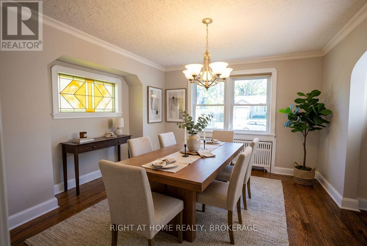 Welcome to this beautifully maintained two-storey home in one of Welland's most sought-after neighbourhoods, just steps from Chippawa Park. Blending timeless character with modern updates, this home offers warmth, charm, and everyday comfort. A bright, sun-filled foyer welcomes you with refinished herringbone hardwood floors, elegant Art Deco trim, and a classic centre-hall staircase. The spacious living room features windows on three sides, filling the space with natural light, while the formal dining room-complete with stained glass accents-is perfect for hosting family and friends. At the rear of the home, the fully renovated kitchen (2024) showcases stylish light grey cabinetry, white subway tile, and a generous pantry-designed with both function and style in mind. Upstairs, you'll find three well-appointed bedrooms, including two oversized rooms that comfortably fit king-sized beds. The vintage-inspired four-piece bathroom highlights original yellow and black tilework, adding a unique touch of character. The finished lower level offers a cozy rec room, convenient two-piece bath, and a utility/laundry area-ideal for additional living space, hobbies, or a home office. Enjoy outdoor living with a welcoming covered front porch, detached garage, and a newer wooden shed (2022) for added storage. Located just steps from Chippawa Park, you'll have access to beautiful green space, gardens, playgrounds, sports courts, and a splash pad-perfect for an active, family-friendly lifestyle. Recent updates include: renovated kitchen (2024), upper-level flooring (2023), updated electrical (2018), natural gas boiler (2017), fresh interior and exterior paint, and new shed (2022).Move-in ready and full of character, this is a rare opportunity to own a charming home in a prime location. (id:64974)