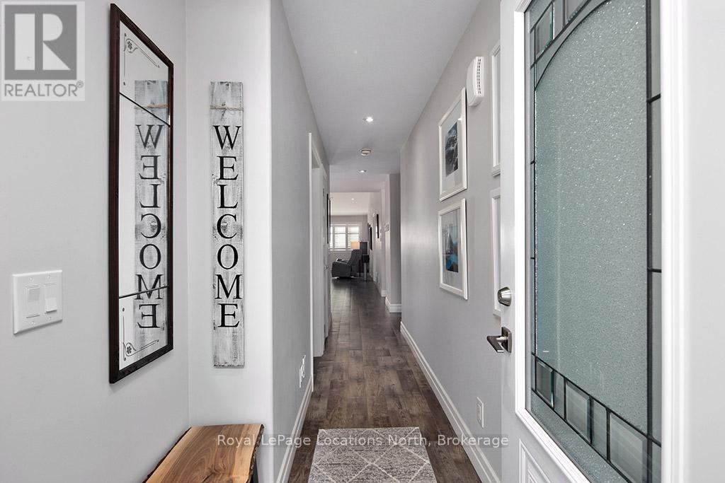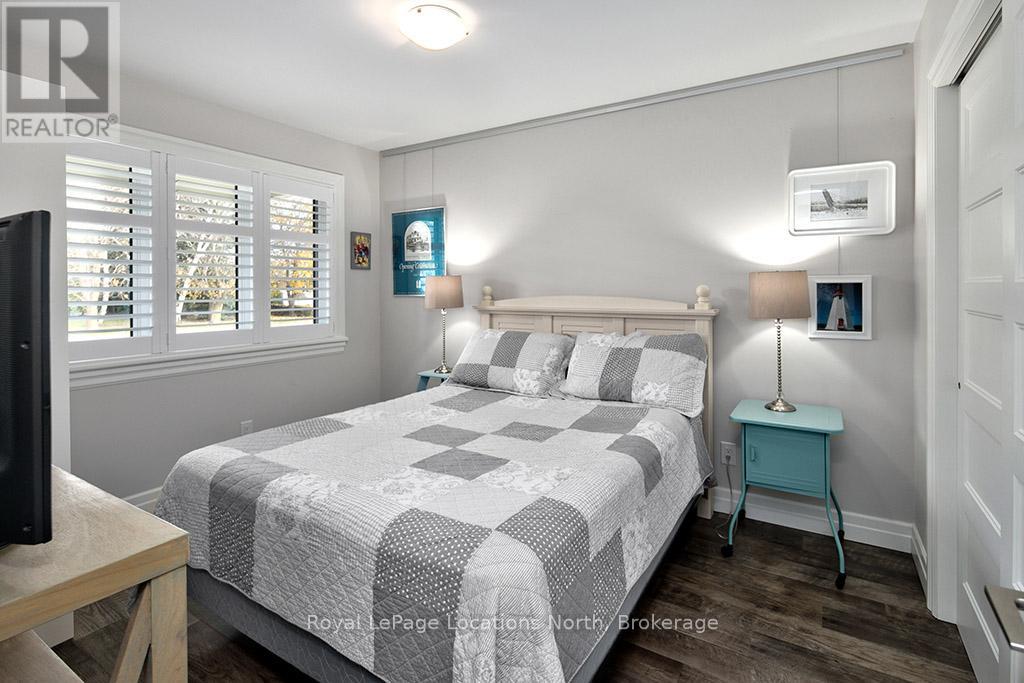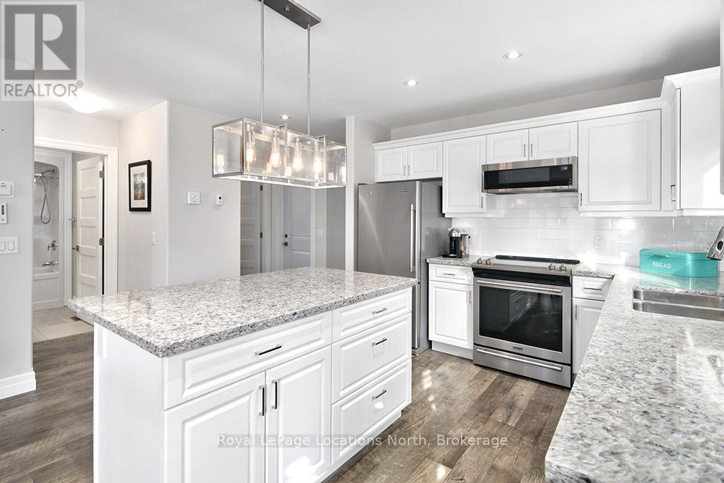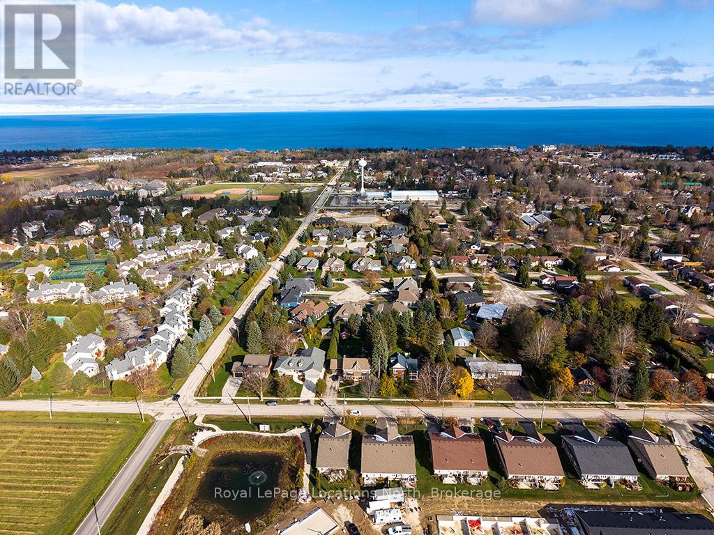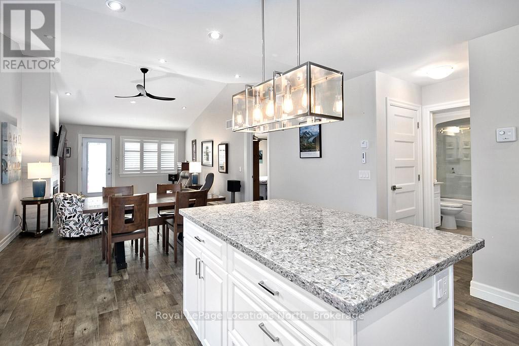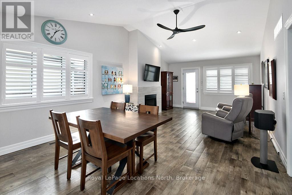 Welcome to Thornbury Meadows, a vibrant 55+ land-lease community where comfort, convenience, and friendly neighbourhood living come together. This beautifully maintained semi-detached 2-bedroom, 2-bathroom bungalow offers 1,233 sq. ft. of well-designed, main-floor living with an airy, open-concept layout and numerous thoughtful features. Inside, vaulted ceilings enhance the bright living and dining areas, anchored by a cozy natural gas fireplace and a walk-out to a patio-ideal for relaxing outdoors or hosting casual gatherings. The spacious kitchen provides excellent counter space and an easy flow for both everyday living and entertaining. The generous primary suite includes a walk-in closet and a 3-piece ensuite. A second bedroom and full 4-piece bath offer versatility for guests or a home office. Main-floor laundry, ample storage, and an attached single garage with inside entry add practicality and convenience. A charming covered front porch and landscaped exterior complete the welcoming curb appeal. Thornbury Meadows is known for its walkability and community feel, with close proximity to downtown Thornbury's shops, marina, parks, library, Georgian Trail, golf, and skiing. Monthly fees include water/sewer, property taxes, maintenance, administration fee, and the land-lease payment. One occupant must be at least 55. Move-in ready and available for flexible possession, this lovely bungalow is an ideal opportunity to simplify your lifestyle and enjoy everything Thornbury has to offer. (id:64974)