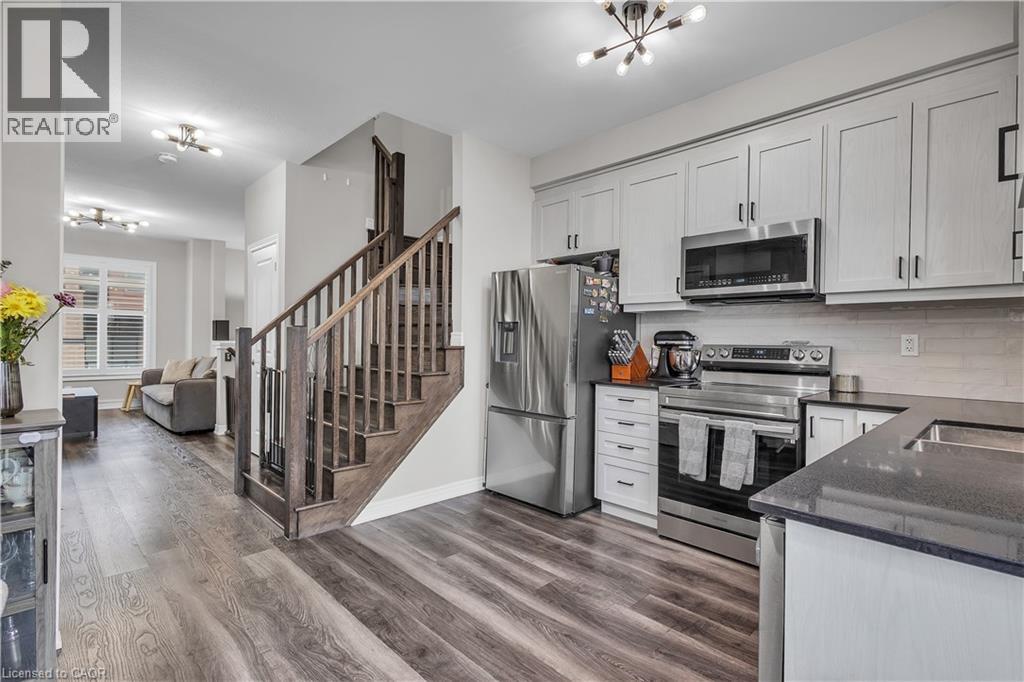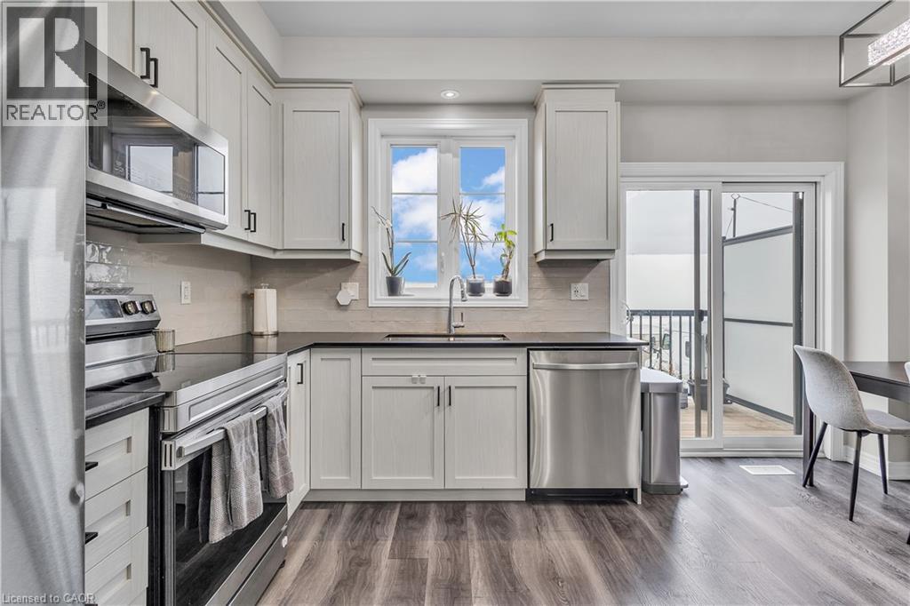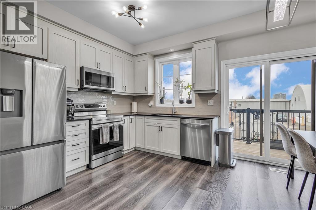 Welcome to this stunning 3-bedroom condo townhouse built by Losani Homes, an award-winning builder known for quality craftsmanship and thoughtful design. Located in a highly desirable Hamilton neighborhood, this home offers the perfect blend of modern finishes and everyday functionality. Step inside to a bright, open-concept layout featuring laminate flooring throughout, complemented by elegant maple hardwood stairs. The upgraded kitchen is designed for both style and convenience, showcasing quartz countertops, a sleek backsplash, and a waterline to the fridge—perfect for modern living. Upstairs, you’ll find three bedrooms, including a well-appointed primary retreat complete with a walk-in closet and a private 3-piece ensuite featuring a glass stand-up shower. A 4-piece bathroom in the hallway provides added comfort for family and guests. This home has been thoughtfully upgraded with California shutters throughout, freshly painted interiors (2025), and an automatic garage door opener for added convenience. Step out to your backyard deck, already equipped with a gas line—ideal for summer BBQs and entertaining. Additional highlights include an EV charger, making this home future-ready for electric vehicle owners. Perfect for families, first-time buyers, or investors, this move-in ready home offers exceptional value in a prime location close to parks, schools, shopping, and transit. Don't miss out on this perfect opportunity of home ownership! (id:64974)