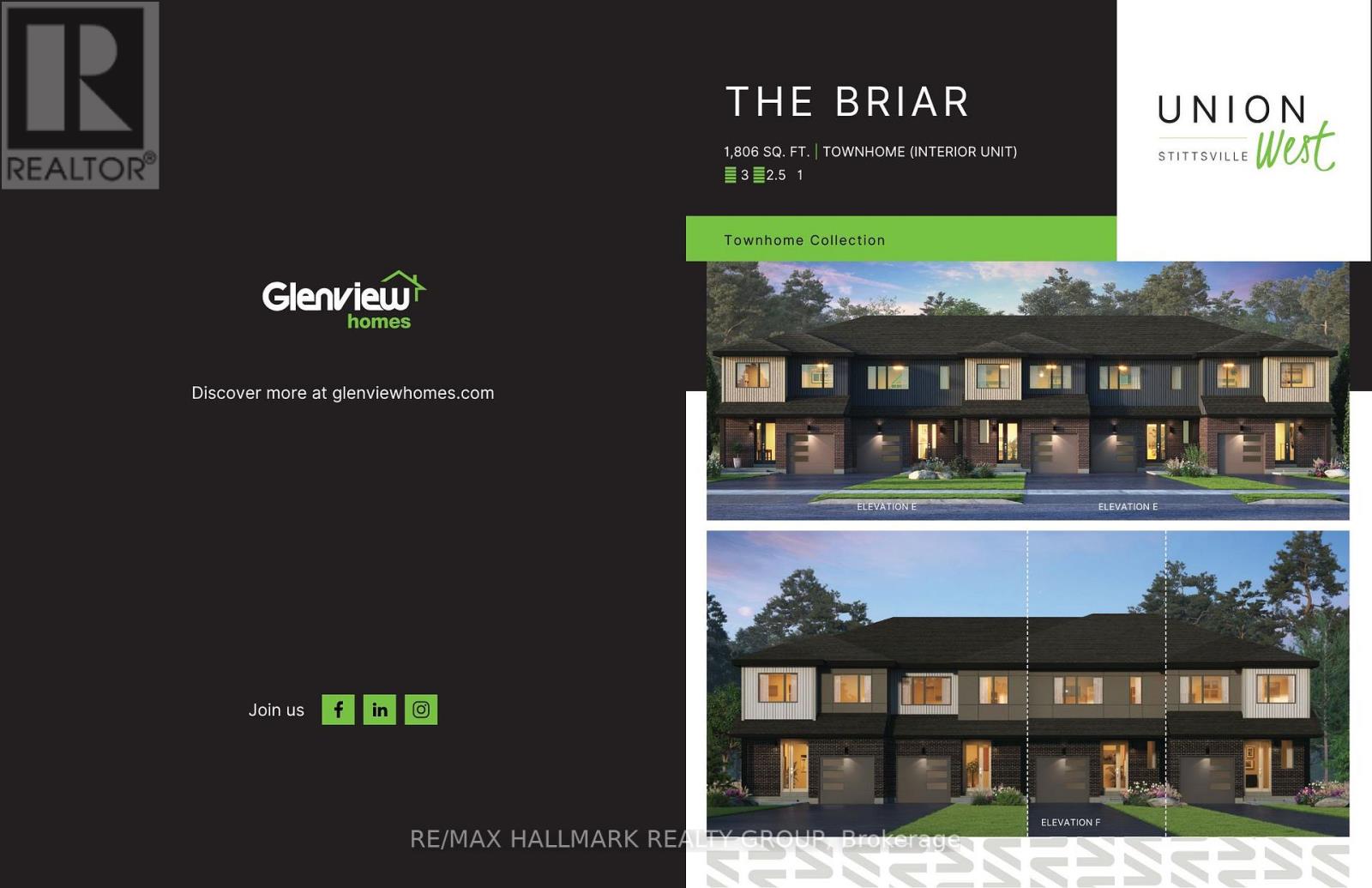 Welcome to Union West - A Move in the Right Direction! Discover the Briar (E) model by Glenview Homes, offering 1,806 sq ft of thoughtfully designed living space, including a 232 sq ft finished basement. This stunning townhome perfectly blends modern style with everyday functionality. Step into the open-concept main floor, elevated by 9-foot smooth ceilings and 7-1/2" wood composite core flooring, flowing seamlessly into the upgraded kitchen. The kitchen boasts quartz countertops in both the kitchen and bathrooms, an enhanced kitchen design featuring pots and pan drawers, 39-inch uppers, and soft-close cabinets. Additional conveniences include a microwave/hood fan combo option, a water line for the refrigerator, and a pot light package illuminating the kitchen and great room. Upstairs, retreat to the luxurious primary bedroom with dual walk-in closets and a bright ensuite complete with a deluxe glass walk-in shower. Two large secondary bedrooms, a spacious full bathroom, and the convenience of second-floor laundry complete the second level. The finished basement offers a versatile rec room featuring an oversized window that brings in abundant natural light, creating a perfect space for family fun, entertaining, or a quiet retreat. Here's the extra something you'll love: this home includes central A/C for comfort year-round. At Union West, you'll thrive in a vibrant, family-friendly community where local shops, restaurants, schools, and recreation centres are seamlessly intertwined with parks, trails, and green spaces. With easy access to transit and just minutes from Ottawa's world-class entertainment venues, this is more than just a home - it's the perfect place to plant your roots.**Home is currently under construction with an anticipated completion/occupancy date of October 15, 2026.** (id:64974)