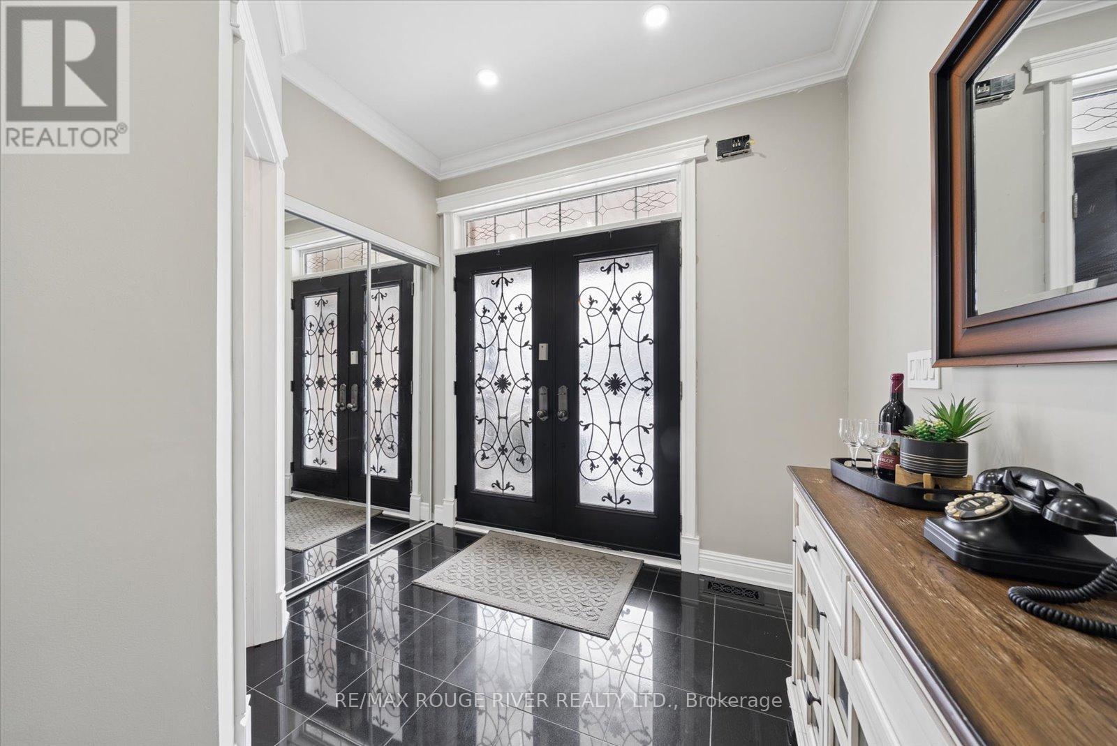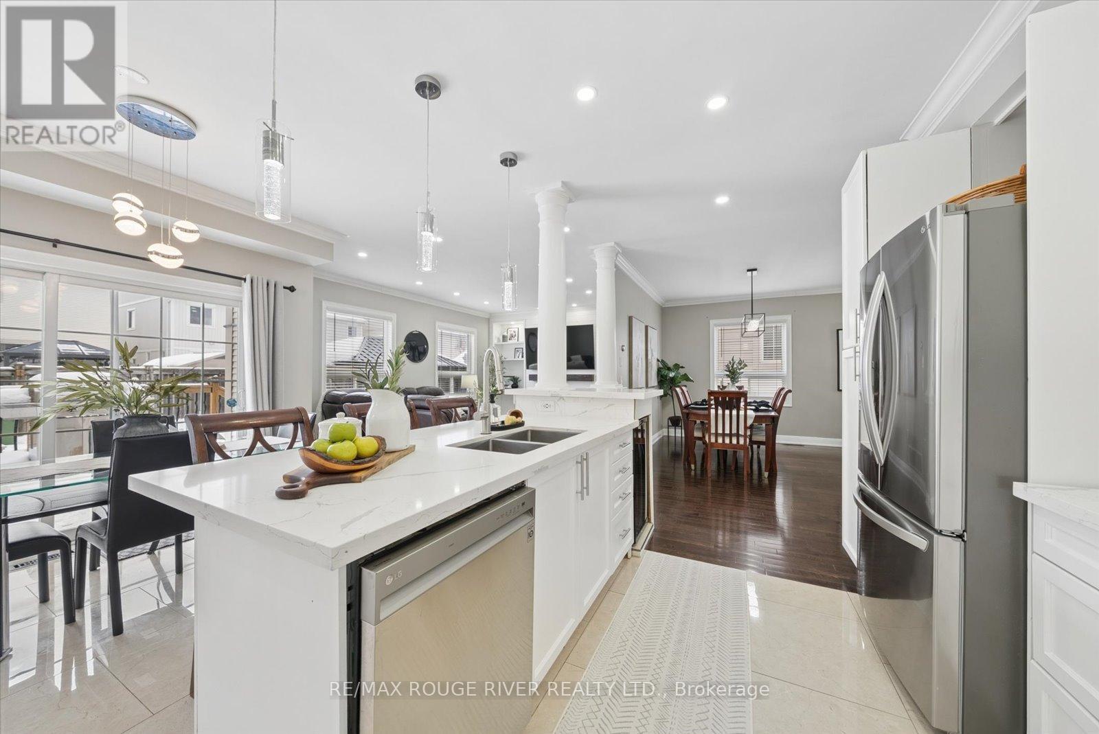 Welcome to Liberty Crossings, one of North Bowmanville's desired family neighbourhoods. This impressive 5-bedroom, 3-bathroom residence offers 2,721 sq. ft. of meticulously maintained living space designed for comfort, functionality, and style. The main floor features a bright, spacious front foyer, 9-ft ceilings, pot lights, and rich hardwood flooring throughout. A main floor laundry room with direct garage access adds everyday convenience. The upgraded eat-in kitchen is the heart of the home, complete with quartz countertops, upgraded stainless-steel appliances, tons of cabinetry, flowing seamlessly into the inviting family room. Here, a gas fireplace with custom built-in cabinetry creates the perfect atmosphere for both relaxation and entertaining. The upper level showcases five generously sized bedrooms, ideal for growing families or those needing extra office or guest space. The primary retreat offers a quiet escape, featuring a large walk-in closet and a spacious 5-piece ensuite. The beautifully renovated second bathroom includes double sinks and a modern glass shower, providing both luxury and practicality for busy mornings. An additional bedroom with its own private balcony adds a rare and charming architectural touch. The double car garage offers excellent storage capabilities, making this home as functional as it is elegant. Perfectly situated within walking distance to schools, parks, shopping, dining, and essential amenities, with everything conveniently located within 1 km. This is a prime opportunity to secure a spacious family home in a highly sought-after community. (id:64974)