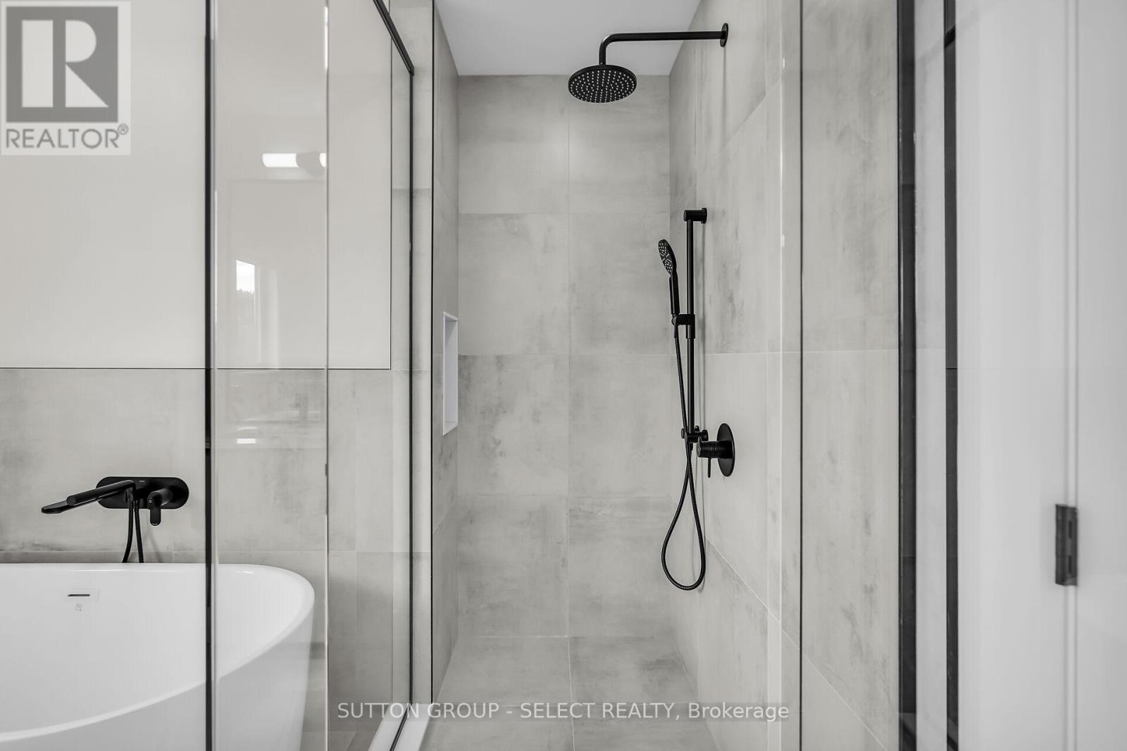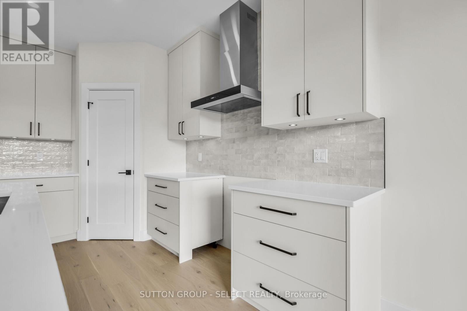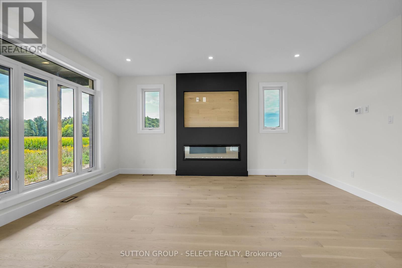 Welcome to 58 Briscoe Crescent, located in the highly desirable Creekside subdivision in Strathroy north end! This executive 2-storey home impresses from the moment you arrive with its stone and Hardie board exterior and corner-lot setting backing onto open farmland. Step inside to a soaring 2-storey foyer with a grand staircase . The main floor offers hardwood flooring throughout with aria built in floor vents for a seamless look. Open-concept layout with oversized windows flooding the living and dining areas with natural light. The living room features a fireplace, while the dining area opens to a covered porch perfect for entertaining. The chefs kitchen is finished with crisp white cabinetry, quartz countertops, tile backsplash and stainless steel hood range. A stylish powder room with gold wall-mounted faucet and designer Lighting, along with main-floor laundry, complete this level. Upstairs, the spacious primary suite is a true retreat with a large walk-in closet and a spa-like ensuite featuring a freestanding soaker tub, custom walk-in tiled shower, and black plumbing fixtures for a modern touch. Two additional generously sized bedrooms, including one with vaulted ceilings, share a full bath with oversized vanity, transom windows in the shower for added natural light, and sleek black fixtures. The fully finished lower level provides excellent additional space with a large rec room, full bathroom, and an extra bedroom, ideal for guests or extended family. Throughout the home, designer lighting fixtures elevate each space, enhancing the style and sophistication. Enjoy the private backyard backing onto farmland, plus the advantages of a corner lot with additional side yard space and easy access for a future pool. All this in a neighbourhood close to excellent schools, parks, shopping, restaurants, and quick access to Hwy 402. A rare opportunity to own a move-in ready home that combines timeless design with modern luxury. (id:64974)