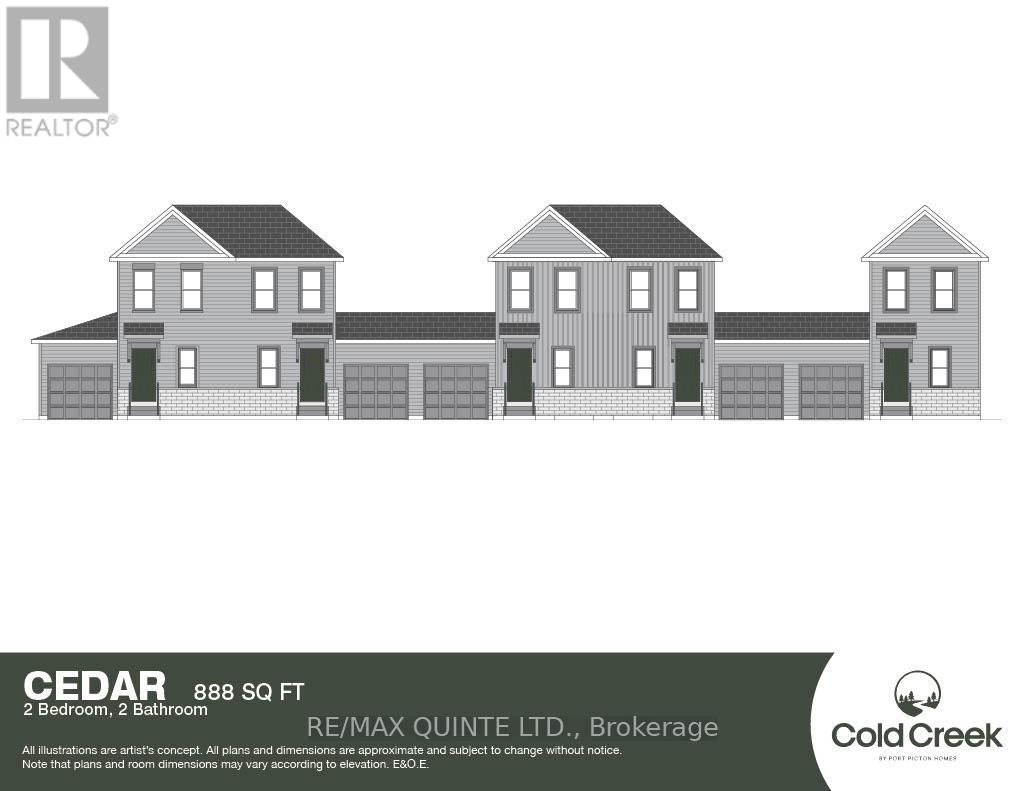 The Cedar is a cleverly designed 2-bedroom, 2-bathroom home offering 888 sq ft of bright, efficient living space in the new COLD CREEK community by Port Picton Homes. The "tiny townhome" main floor features a welcoming open-concept layout, combining the kitchen, dining, and living areas to create a warm and connected space perfect for daily living or entertaining. Thoughtful details such as an attached garage and convenient powder room make this home both functional and stylish. Upstairs, a comfortable primary bedroom and a full bathroom provide a cozy retreat, complete with a walk-in closet and a practical linen closet. Downstairs, the finished lower level expands your living space with a second bedroom, full bathroom, and laundry area, making it perfect for guests, family, or flexible living arrangements. Located within walking distance of Pictons vibrant Main Street, Cold Creek offers the best of small-town living with modern amenities close at hand. The Cedar pairs smart design and quality craftsmanship in a compact yet comfortable layout ideal for first-time buyers, downsizers, or those seeking a relaxed Prince Edward County lifestyle. (id:64974)