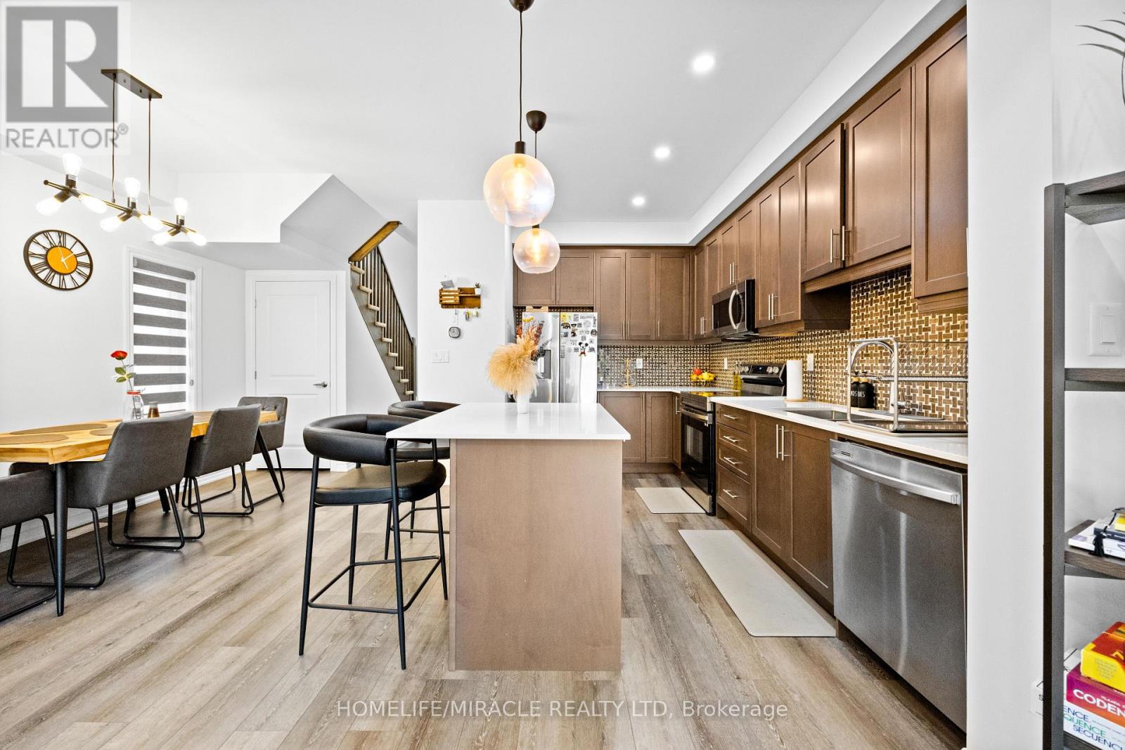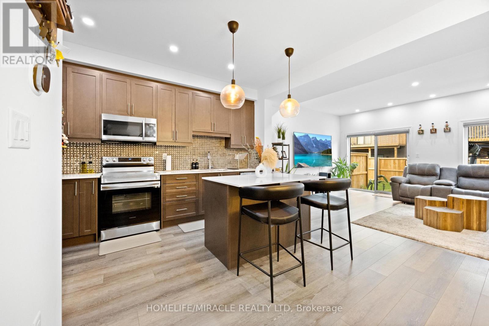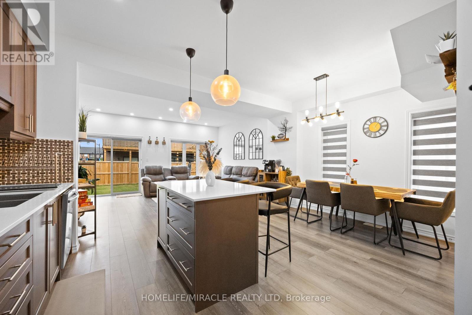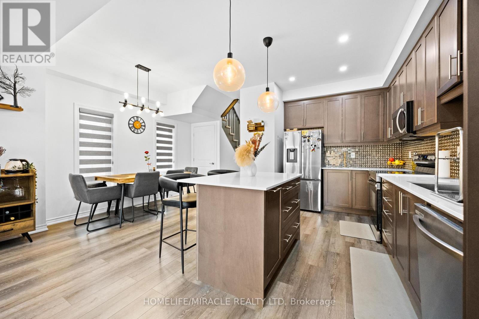 -Main Awesome End-unit Freehold Townhouse (feels like semi detached), Move In Ready! Corner Enhanced End Unit 1709 Sq Feet 2 Storey Freehold Townhouse Just Like Semi, In Sought Area Of brant West! 3 Bedrooms, 2.5Baths.Bright/Spacious Have Larger Windows For Natural Light Floor 9Ft Ceiling, Gorgeous Kitchen With Bigger Living & Dining Area, Quartz Counter, Deep Sinks. Must-See, 3 Years Old, Located in West Brantford community features a modern open-concept design with 9-foot smooth ceilings and laminate flooring throughout the main floor. The upgraded kitchen boasts quartz countertops, a stylish undermount sink, extended-height upper cabinets, a kitchen island, and a microwave space saver provision, along with brand-new stainless steel appliances, including a fridge, stove, and dishwasher. Beautiful entry leads to a large foyer, opening into a bright living room with a walkout to the backyard, filled with natural light from oversized windows, making it perfect for family gatherings or entertaining friends. The main floor also includes pot lights to enhance the space with warm, modern lighting. Upstairs, the primary bedroom offers a walk-in closet and a luxurious ensuite full washroom, while the second bedroom also includes a walk-in closet. A convenient second-floor laundry room comes equipped with a brand-new white front-loading washer and dryer. Located in a family-friendly neighborhood, this home is just minutes from top-rated schools, a community center, shopping, scenic trails, and major highways, with visitor parking and a kids' park conveniently situated in front of the house. Don't miss this incredible opportunity schedule a showing today! Furnace, A/C and Tankless hot water owned. (id:64974)