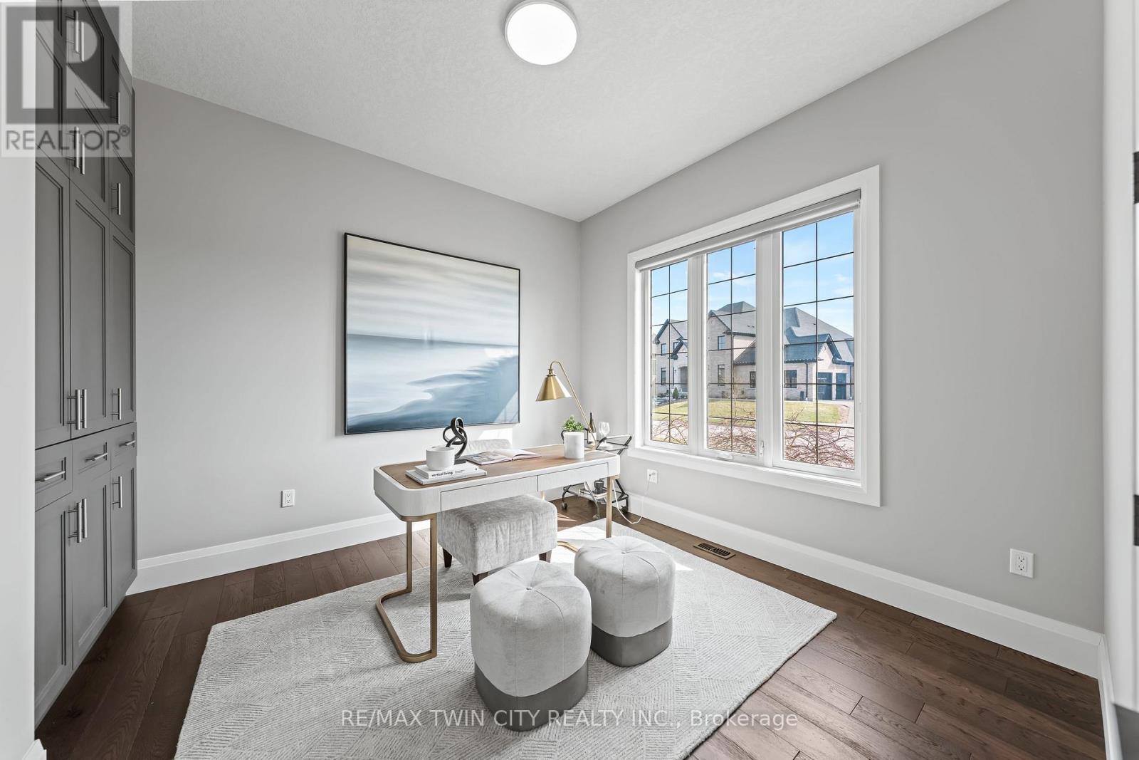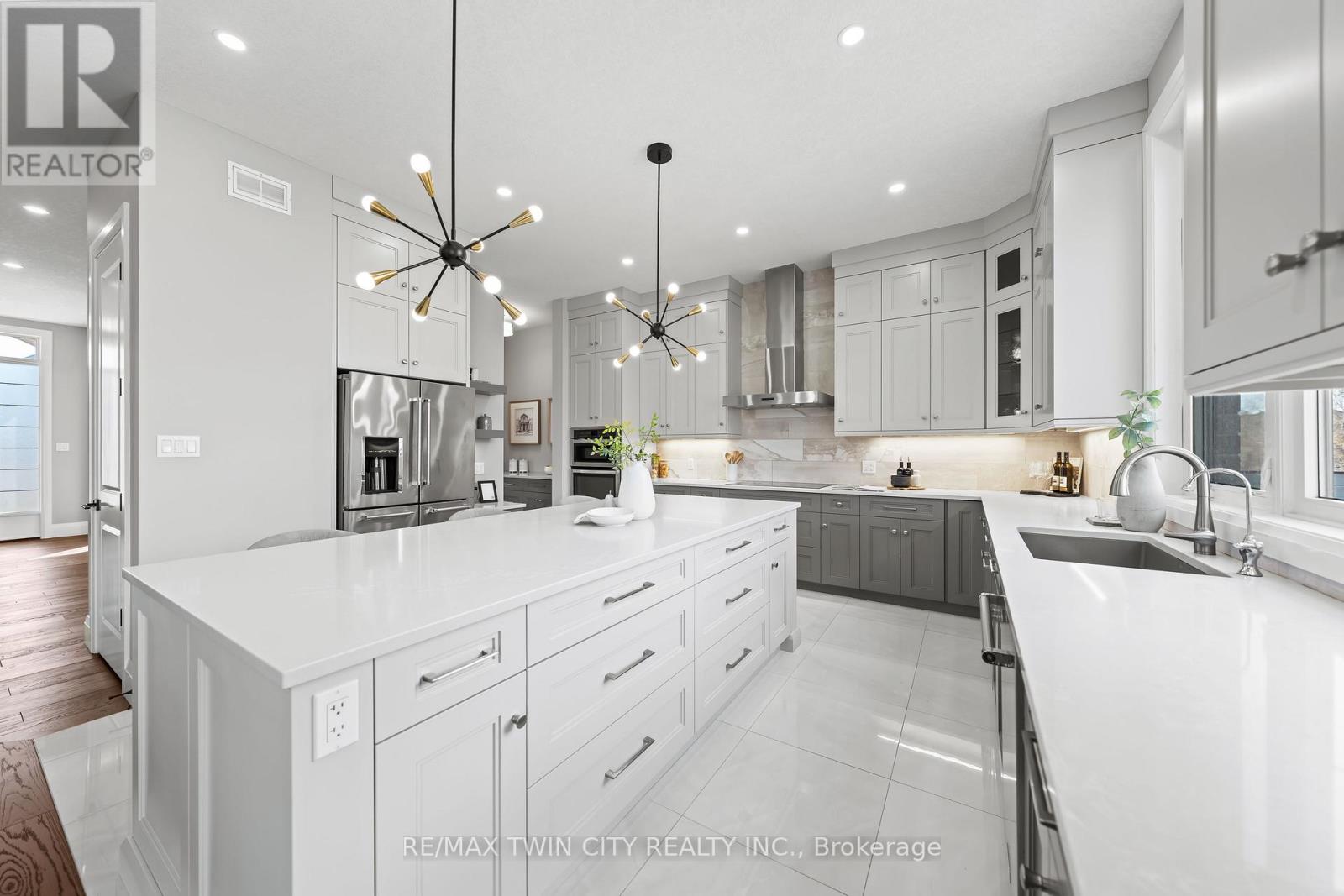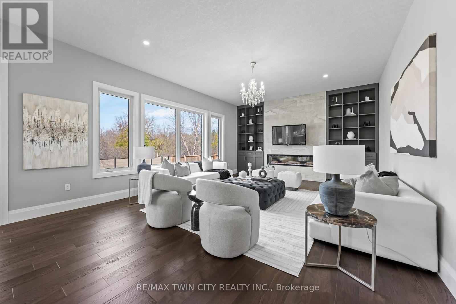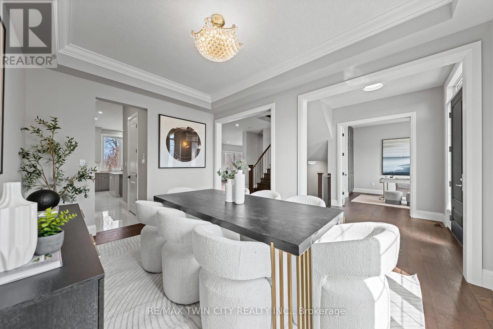 This is truly a rare offering in Carriage Crossing, Waterloo-custom-built luxury with a triple car garage, 72' wide lot & backing protected forest. Blending elegance, comfort & exceptional craftsmanship, this executive home offers approx. 3,600 SF of beautifully finished above grade living space with 4 bdrms & 4 baths, thoughtfully designed for refined living. Set on an oversized lot, the home showcases timeless architecture, upscale finishes & a flr plan that impresses throughout. A welcoming entry opens to 10' ceilings, hardwood & porcelain tile flring & designer lighting. A front office/living rm with custom built-ins & a formal dining rm with tray ceiling frame the entry. The dining rm connects to a servery & walk-in pantry, leading into the custom Chervin kitchen with quartz counters, backsplash, lrg island, under-cabinet lighting & premium appliances. The kitchen flows into the breakfast area with access to the covered back porch & opens to the great rm spanning the rear of the home-offering stunning views of the private, forested backyard. The great rm features an electric FP with custom built-ins. Completing the main is a lrg mud rm. Upstairs, the primary suite offers a walk-in closet & spa-like 5-pc ensuite with dual sinks, soaker tub & shower. 3 additional bdrms each feature walk-in closets & ensuite access-1 with a private 3-pc & 2 sharing a 5-pc Jack & Jill, plus upper level laundry. The unfinished lower level offers excellent potential with lrg windows & a bath rough-in-ready to be customized. The exterior is equally impressive with professionally landscaped grounds, interlock driveway, fenced yard & covered porch & patio, all surrounded by mature trees for exceptional privacy. Located in one of Waterloo's most sought-after communities, steps to trails, parks, top-rated schools, RIM Park & Grey Silo Golf Club, & mins to St. Jacobs Market, universities, shopping & HWY access-this is a rare opportunity to own a truly exceptional home in Carriage Crossing. (id:64974)