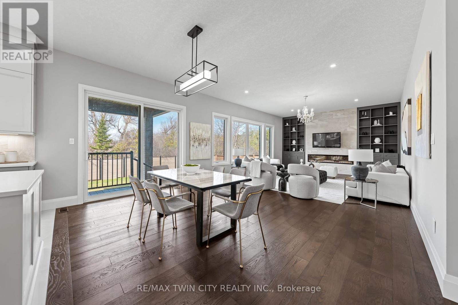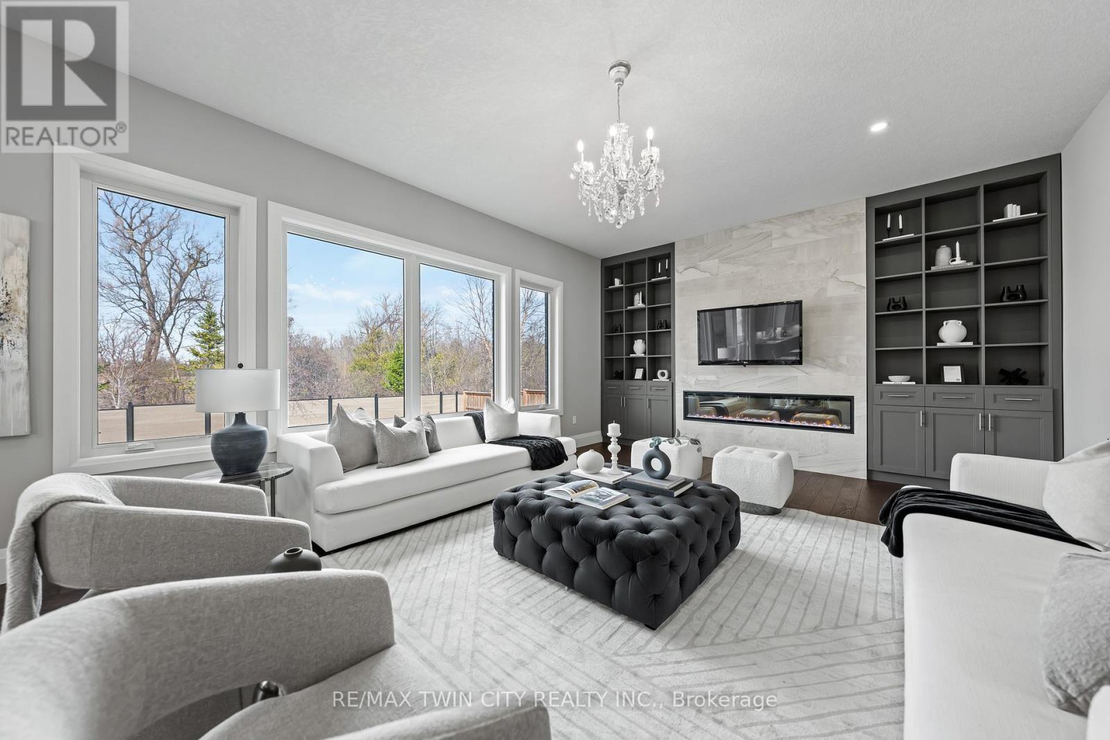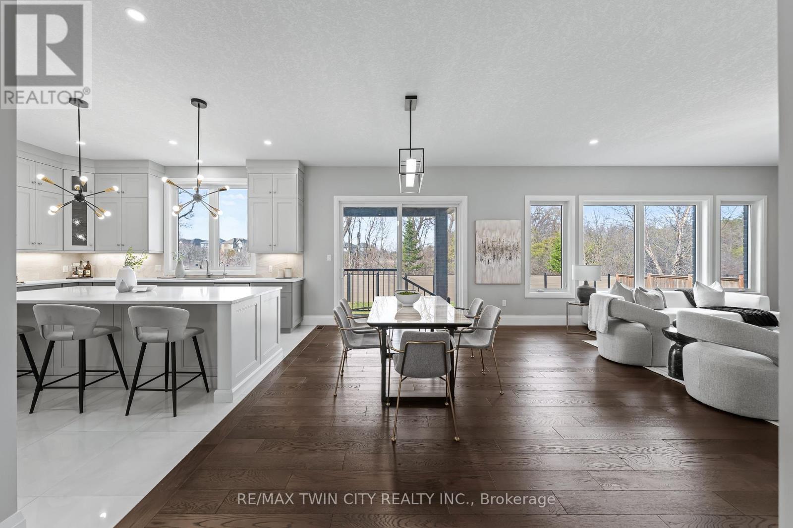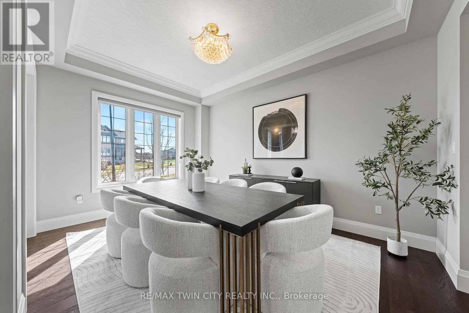 This is truly a rare offering in Carriage Crossing, Waterloo-custom-built luxury with a triple car garage, 72' wide lot & backing protected forest. Blending elegance, comfort & exceptional craftsmanship, this executive home offers approx. 3,600 SF of beautifully finished above grade living space with 4 bdrms & 4 baths, thoughtfully designed for refined living. Set on an oversized lot, the home showcases timeless architecture, upscale finishes & a flr plan that impresses throughout. A welcoming entry opens to 10' ceilings, hardwood & porcelain tile flring & designer lighting. A front office/living rm with custom built-ins & a formal dining rm with tray ceiling frame the entry. The dining rm connects to a servery & walk-in pantry, leading into the custom Chervin kitchen with quartz counters, backsplash, lrg island, under-cabinet lighting & premium appliances. The kitchen flows into the breakfast area with access to the covered back porch & opens to the great rm spanning the rear of the home-offering stunning views of the private, forested backyard. The great rm features an electric FP with custom built-ins. Completing the main is a lrg mud rm. Upstairs, the primary suite offers a walk-in closet & spa-like 5-pc ensuite with dual sinks, soaker tub & shower. 3 additional bdrms each feature walk-in closets & ensuite access-1 with a private 3-pc & 2 sharing a 5-pc Jack & Jill, plus upper level laundry. The unfinished lower level offers excellent potential with lrg windows & a bath rough-in-ready to be customized. The exterior is equally impressive with professionally landscaped grounds, interlock driveway, fenced yard & covered porch & patio, all surrounded by mature trees for exceptional privacy. Located in one of Waterloo's most sought-after communities, steps to trails, parks, top-rated schools, RIM Park & Grey Silo Golf Club, & mins to St. Jacobs Market, universities, shopping & HWY access-this is a rare opportunity to own a truly exceptional home in Carriage Crossing. (id:64974)