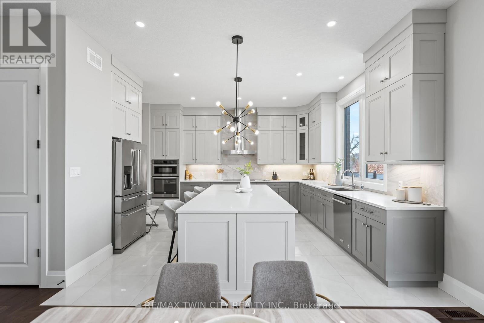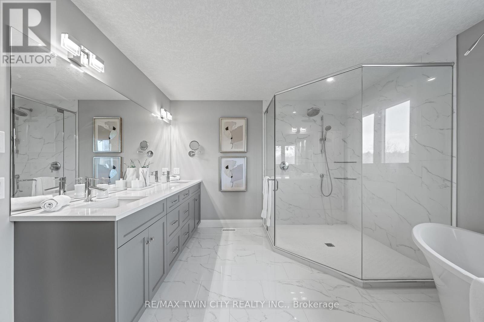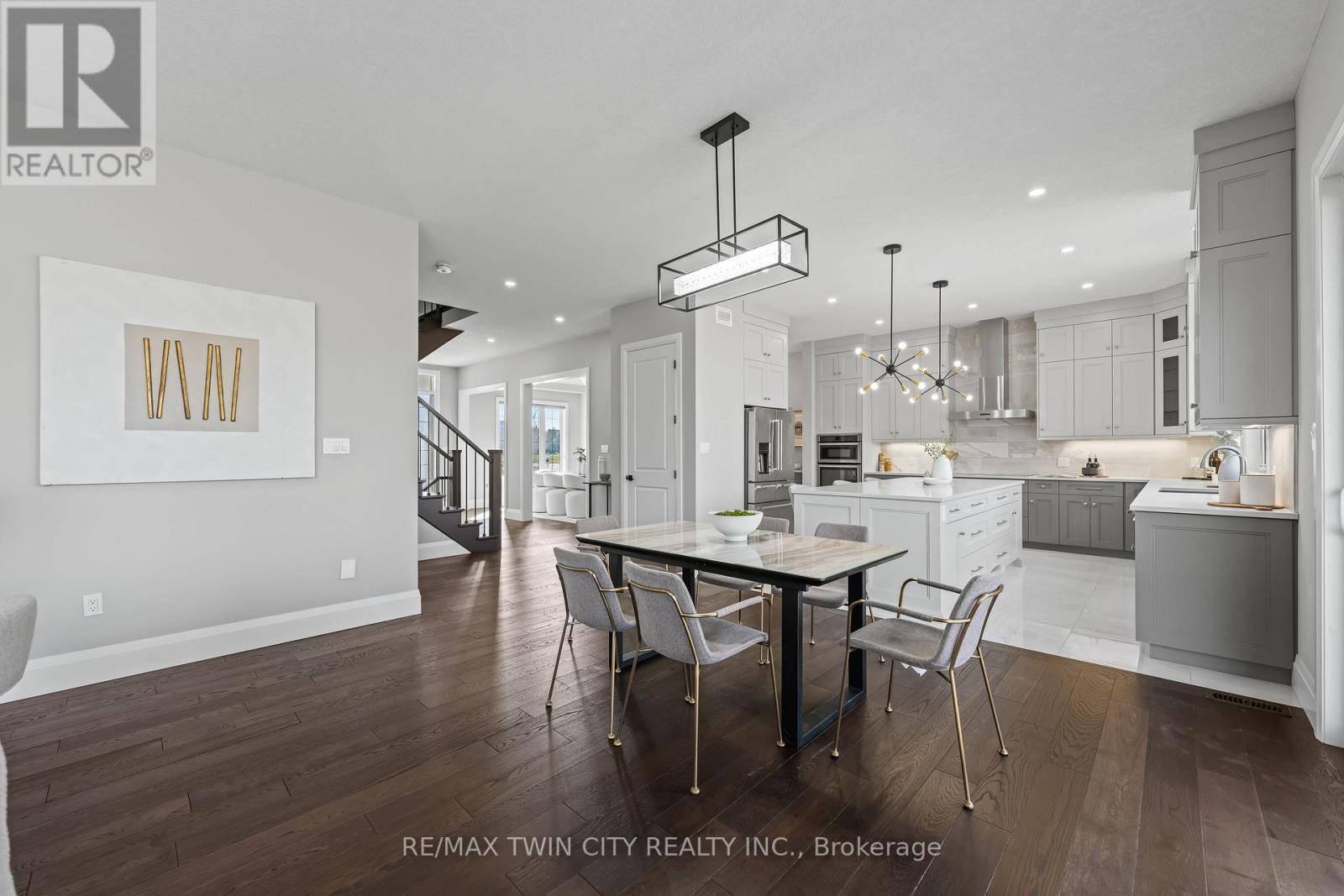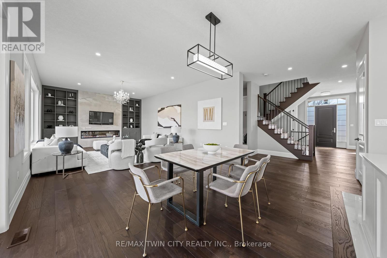 This is truly a rare offering in Carriage Crossing, Waterloo-custom-built luxury with a triple car garage, 72' wide lot & backing protected forest. Blending elegance, comfort & exceptional craftsmanship, this executive home offers approx. 3,600 SF of beautifully finished above grade living space with 4 bdrms & 4 baths, thoughtfully designed for refined living. Set on an oversized lot, the home showcases timeless architecture, upscale finishes & a flr plan that impresses throughout. A welcoming entry opens to 10' ceilings, hardwood & porcelain tile flring & designer lighting. A front office/living rm with custom built-ins & a formal dining rm with tray ceiling frame the entry. The dining rm connects to a servery & walk-in pantry, leading into the custom Chervin kitchen with quartz counters, backsplash, lrg island, under-cabinet lighting & premium appliances. The kitchen flows into the breakfast area with access to the covered back porch & opens to the great rm spanning the rear of the home-offering stunning views of the private, forested backyard. The great rm features an electric FP with custom built-ins. Completing the main is a lrg mud rm. Upstairs, the primary suite offers a walk-in closet & spa-like 5-pc ensuite with dual sinks, soaker tub & shower. 3 additional bdrms each feature walk-in closets & ensuite access-1 with a private 3-pc & 2 sharing a 5-pc Jack & Jill, plus upper level laundry. The unfinished lower level offers excellent potential with lrg windows & a bath rough-in-ready to be customized. The exterior is equally impressive with professionally landscaped grounds, interlock driveway, fenced yard & covered porch & patio, all surrounded by mature trees for exceptional privacy. Located in one of Waterloo's most sought-after communities, steps to trails, parks, top-rated schools, RIM Park & Grey Silo Golf Club, & mins to St. Jacobs Market, universities, shopping & HWY access-this is a rare opportunity to own a truly exceptional home in Carriage Crossing. (id:64974)