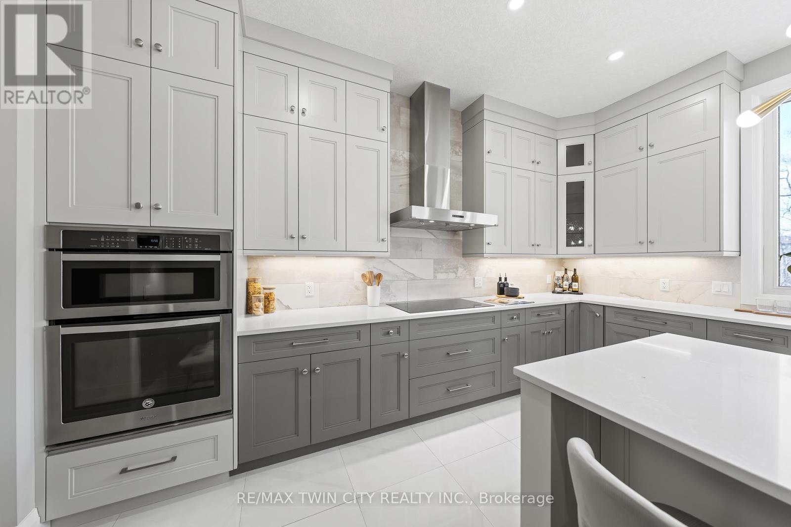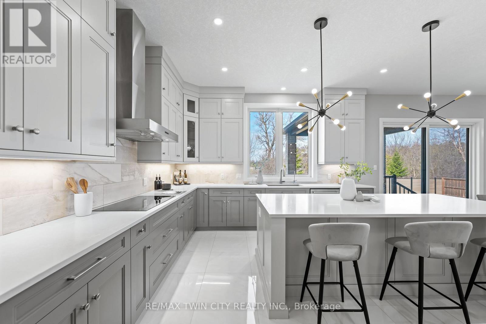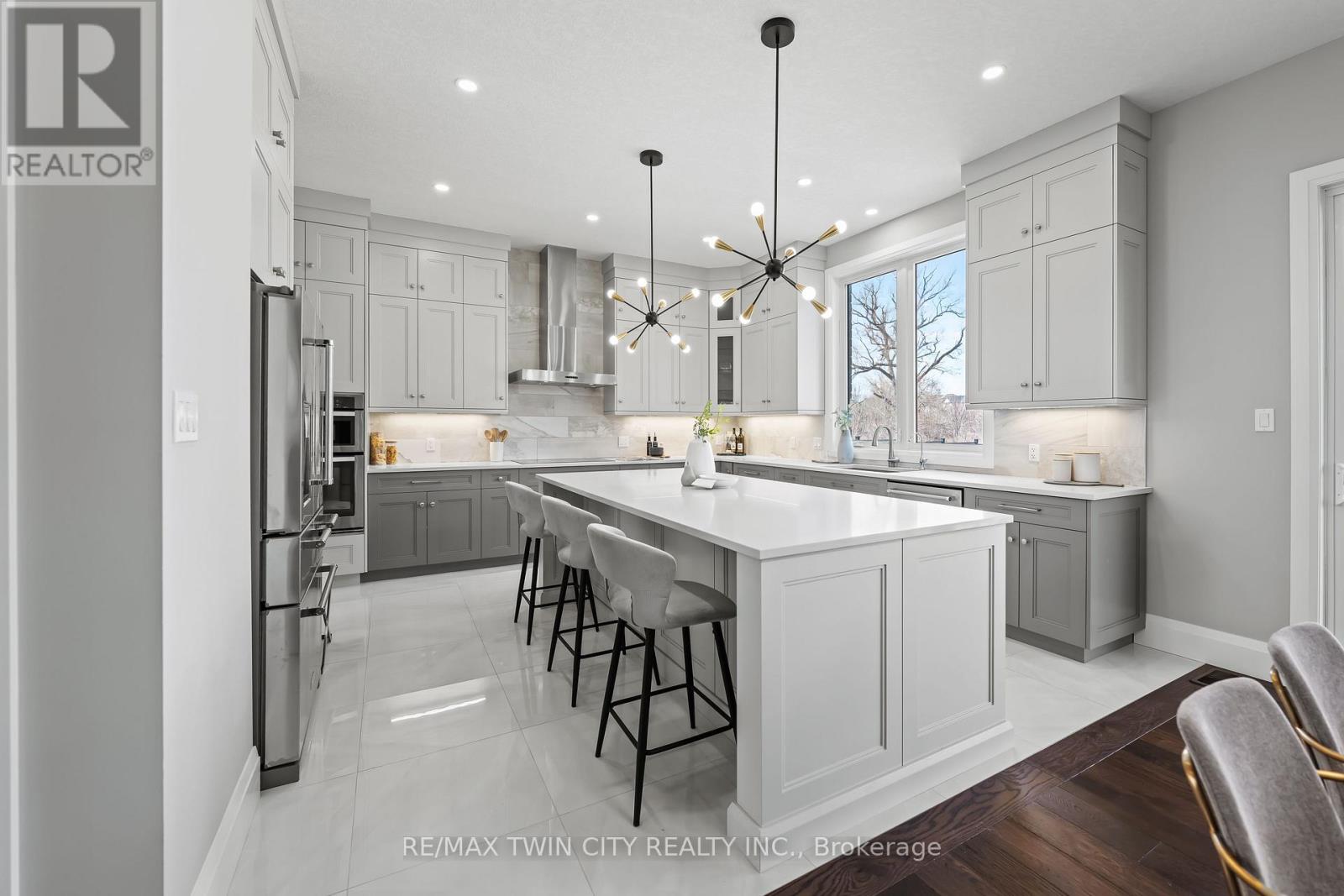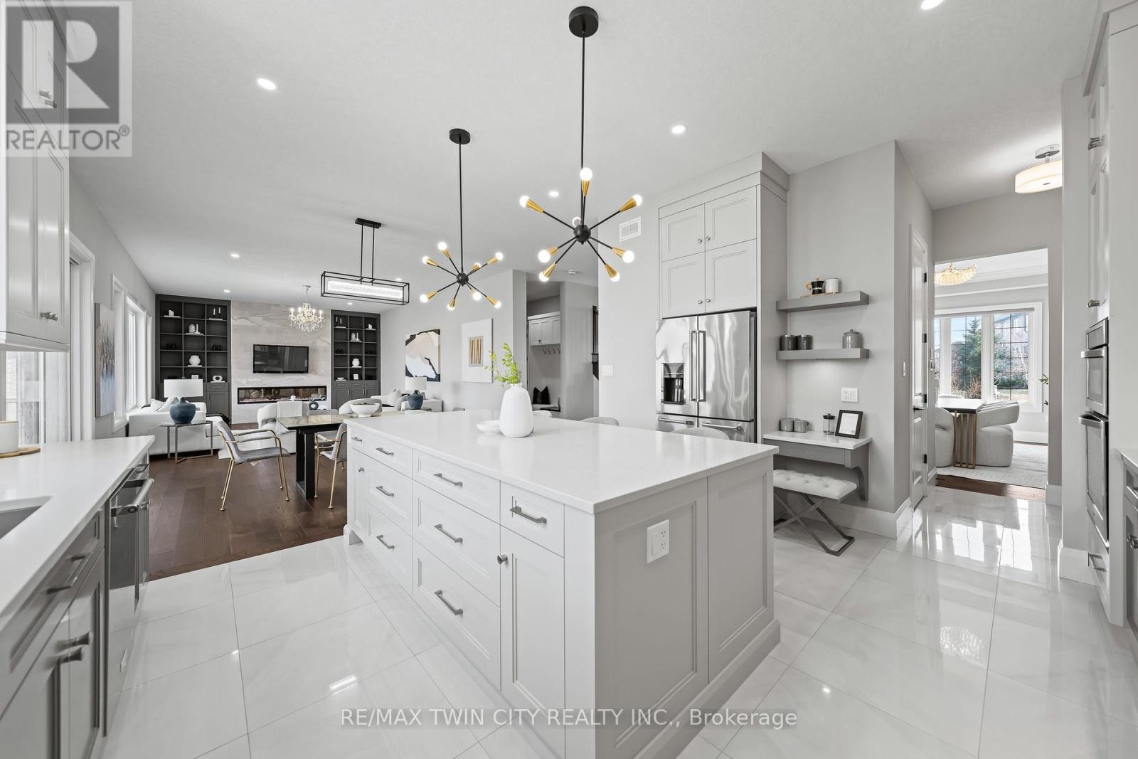 This is truly a rare offering in Carriage Crossing, Waterloo-custom-built luxury with a triple car garage, 72' wide lot & backing protected forest. Blending elegance, comfort & exceptional craftsmanship, this executive home offers approx. 3,600 SF of beautifully finished above grade living space with 4 bdrms & 4 baths, thoughtfully designed for refined living. Set on an oversized lot, the home showcases timeless architecture, upscale finishes & a flr plan that impresses throughout. A welcoming entry opens to 10' ceilings, hardwood & porcelain tile flring & designer lighting. A front office/living rm with custom built-ins & a formal dining rm with tray ceiling frame the entry. The dining rm connects to a servery & walk-in pantry, leading into the custom Chervin kitchen with quartz counters, backsplash, lrg island, under-cabinet lighting & premium appliances. The kitchen flows into the breakfast area with access to the covered back porch & opens to the great rm spanning the rear of the home-offering stunning views of the private, forested backyard. The great rm features an electric FP with custom built-ins. Completing the main is a lrg mud rm. Upstairs, the primary suite offers a walk-in closet & spa-like 5-pc ensuite with dual sinks, soaker tub & shower. 3 additional bdrms each feature walk-in closets & ensuite access-1 with a private 3-pc & 2 sharing a 5-pc Jack & Jill, plus upper level laundry. The unfinished lower level offers excellent potential with lrg windows & a bath rough-in-ready to be customized. The exterior is equally impressive with professionally landscaped grounds, interlock driveway, fenced yard & covered porch & patio, all surrounded by mature trees for exceptional privacy. Located in one of Waterloo's most sought-after communities, steps to trails, parks, top-rated schools, RIM Park & Grey Silo Golf Club, & mins to St. Jacobs Market, universities, shopping & HWY access-this is a rare opportunity to own a truly exceptional home in Carriage Crossing. (id:64974)