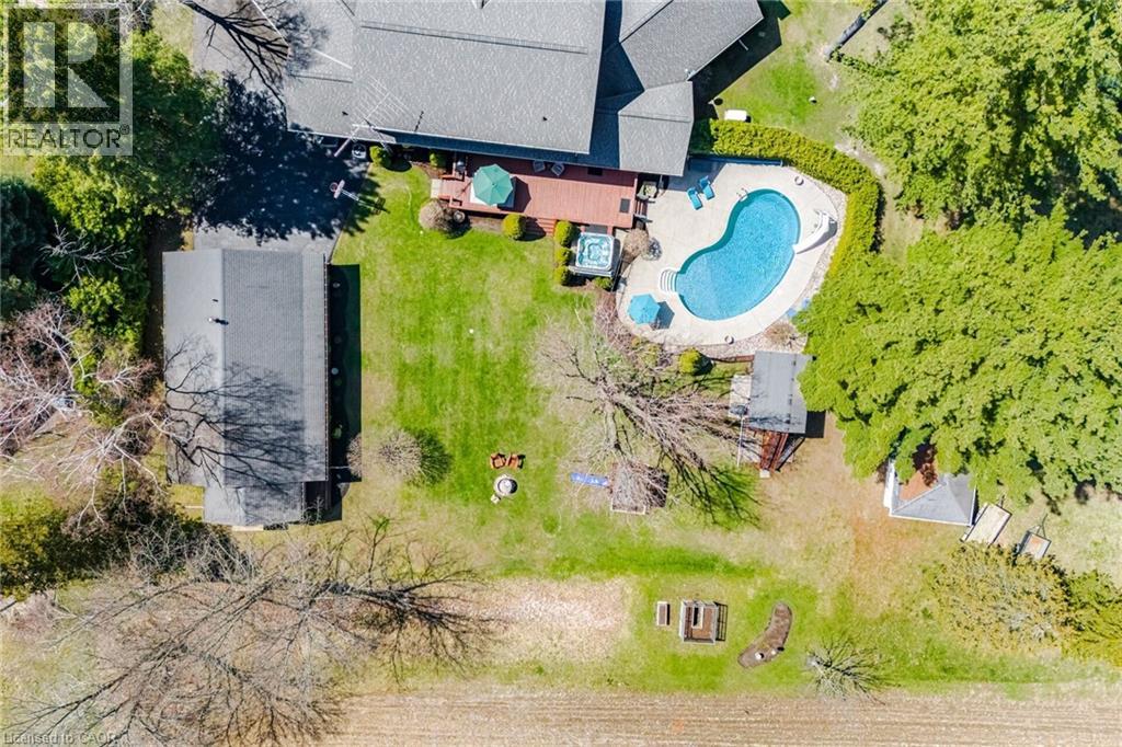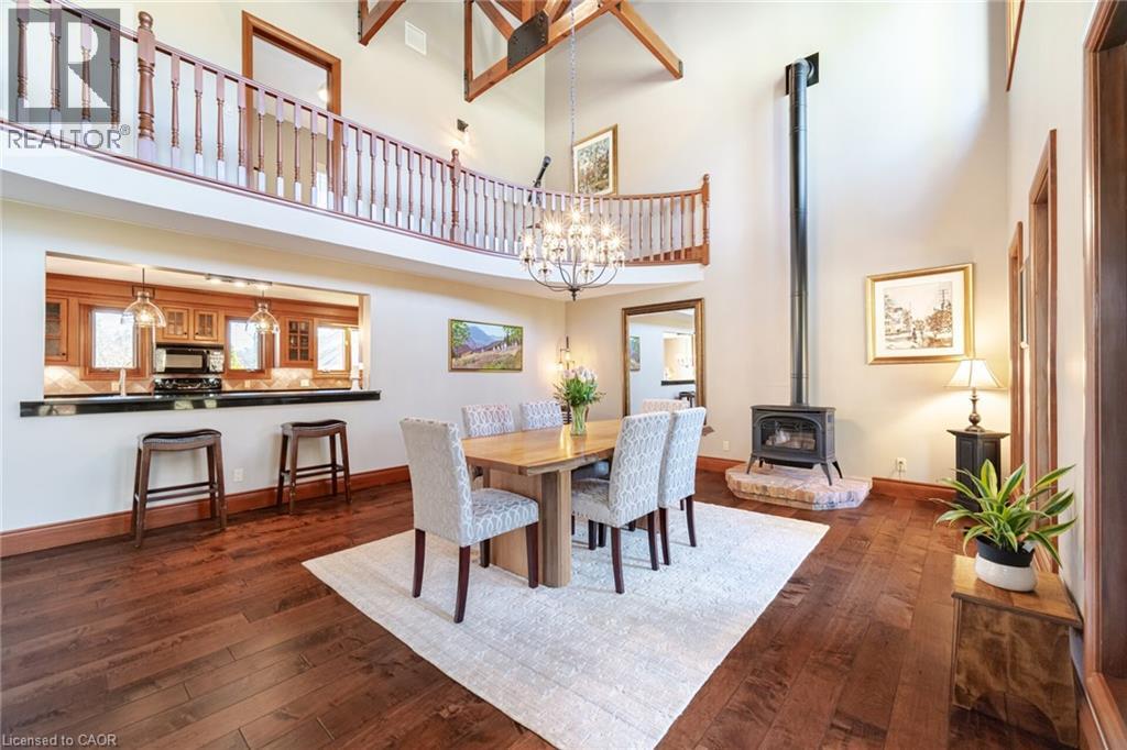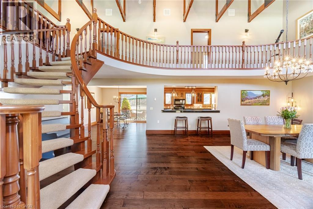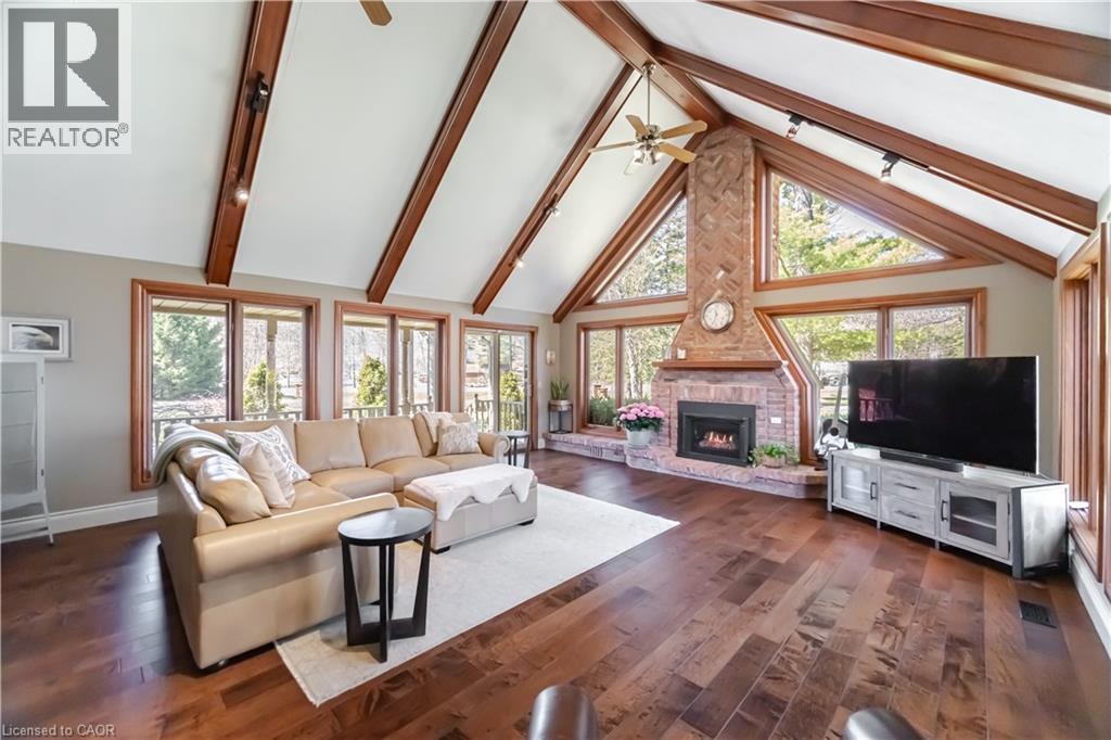 Stunning Country Estate !!! This One-of-a-Kind Masterpiece with Main Floor Principle Bedroom Suite captivates from the very first glance with unmatched curb appeal and it's distinctive design. A true architectural gem, the home showcases custom exposed timber and iron construction, offering a dramatic welcome with soaring 26-ft ceilings in the foyer & great room. Anchoring the space is a striking gas stove and dramatic staircase just two of of the many bespoke touches throughout. The chefs kitchen is a showstopper in its own right, thoughtfully positioned between the great room & the expansive rear deck. Designed for seamless indoor-outdoor living, its perfect for entertaining on any scale, from intimate gatherings to grand events incorporating the sparkling heated saltwater pool, hot tub, deck, & beyond. Prepare to be awestruck yet again in the window-walled family room, where vaulted ceilings rise above a stunning floor-to-ceiling brick fireplace. Here, panoramic views of the beautifully manicured grounds, create a tranquil yet breathtaking backdrop for family gatherings. The main floor offers 2 bedrooms, including an expansive primary suite that feels like a private retreat. It features a luxurious 5-piece spa-style bath w/glass shower enclosure, a generous walk-in closet & direct access to the deck through a private walkout. Additional features include renovated 3 piece bath & laundry rm. The sweeping, open-riser circular staircase leads to the equally impressive upper level. Here you'll find two spacious bedrooms, a sleek and modern 3-piece bathroom, and a versatile loft-style den or studio area. The open-to-below wrap around balcony offers a front-row seat to the craftsmanship of the handcrafted artistry that defines this remarkable home. For the hobbyist or DIY, an incredible bonus awaits: heated 1,200 sq ft- accessory building, equipped with a 3-piece bathroom. This versatile space is ideal for a workshop, studio- home gym, the possibilities are endless! (id:64974)
