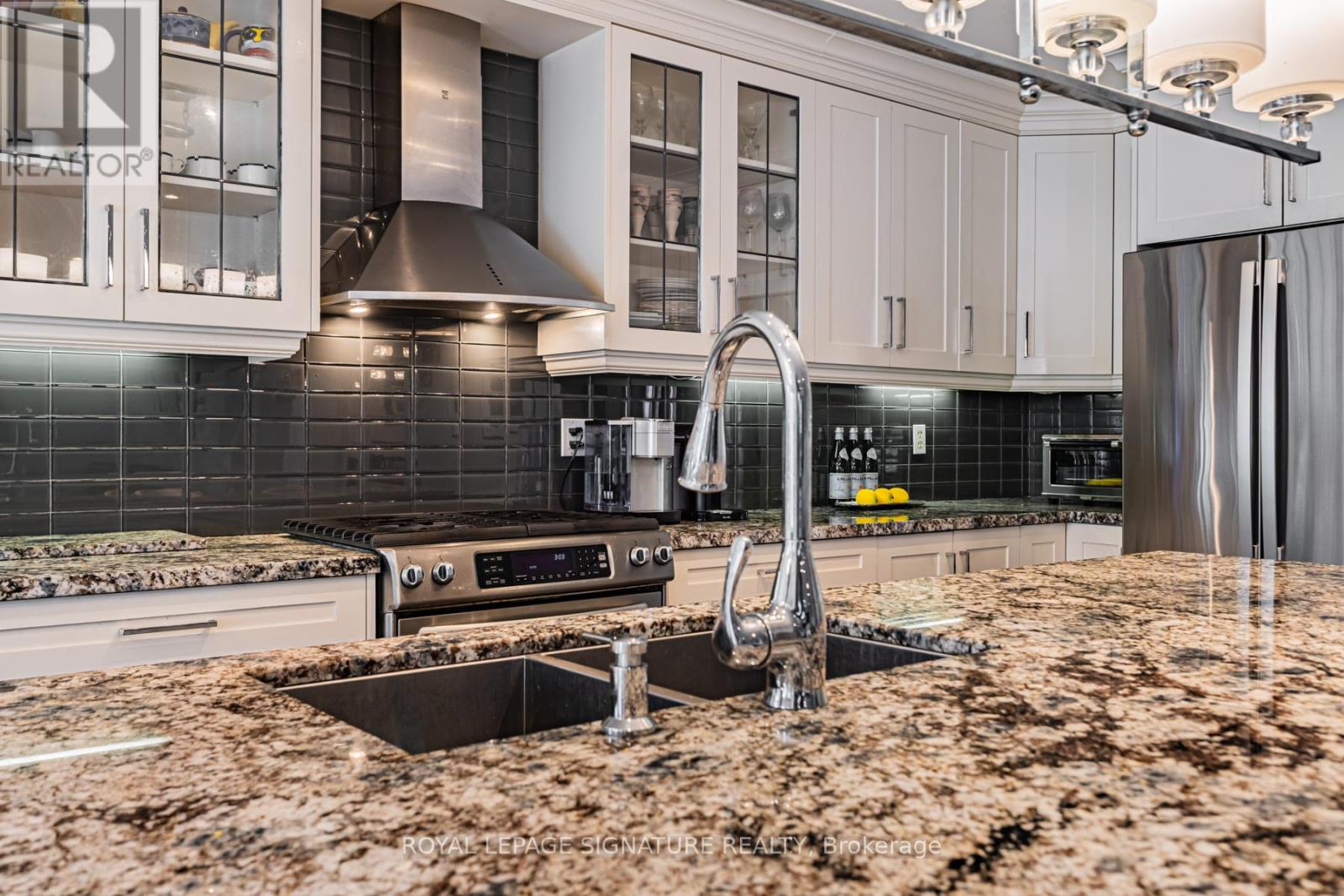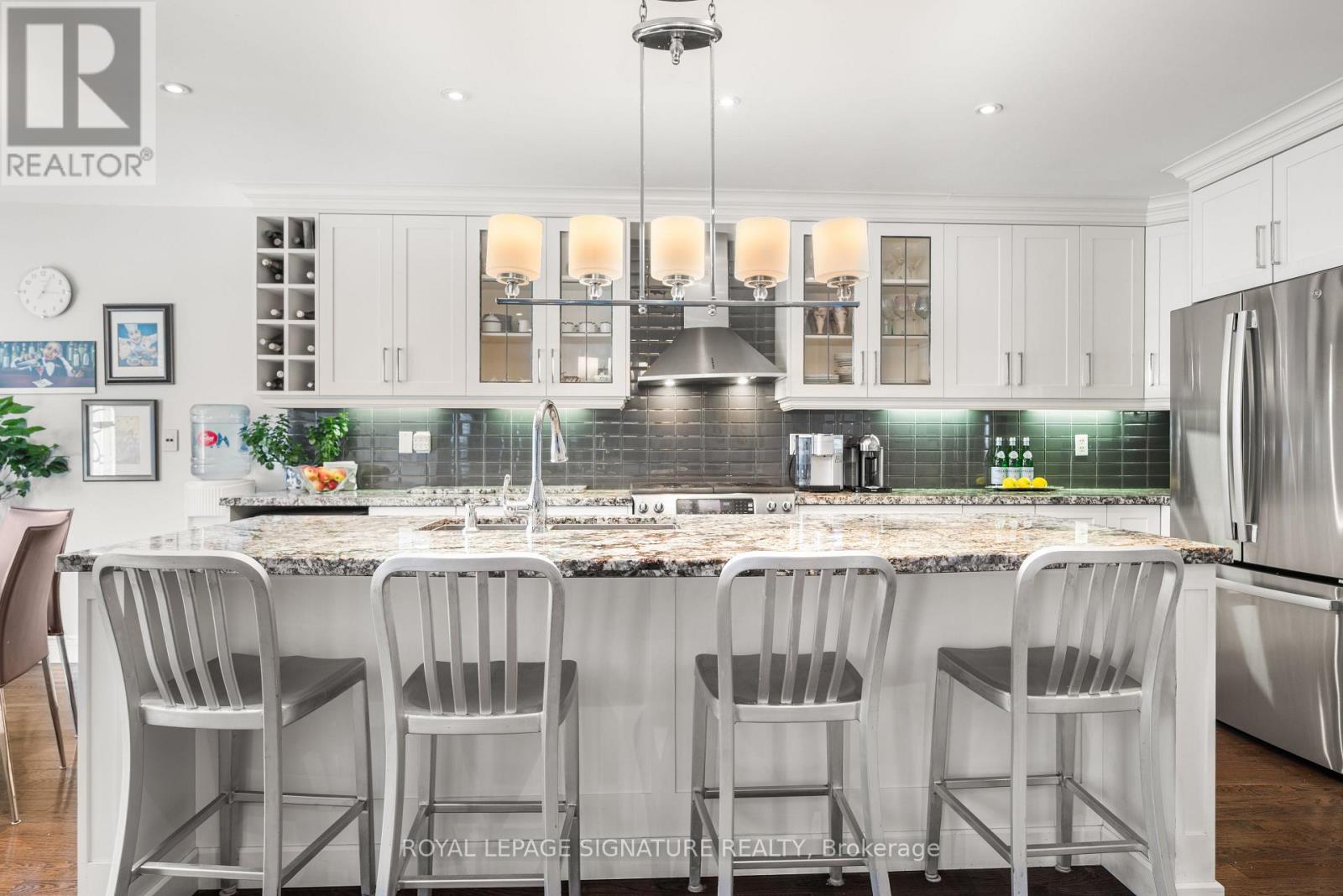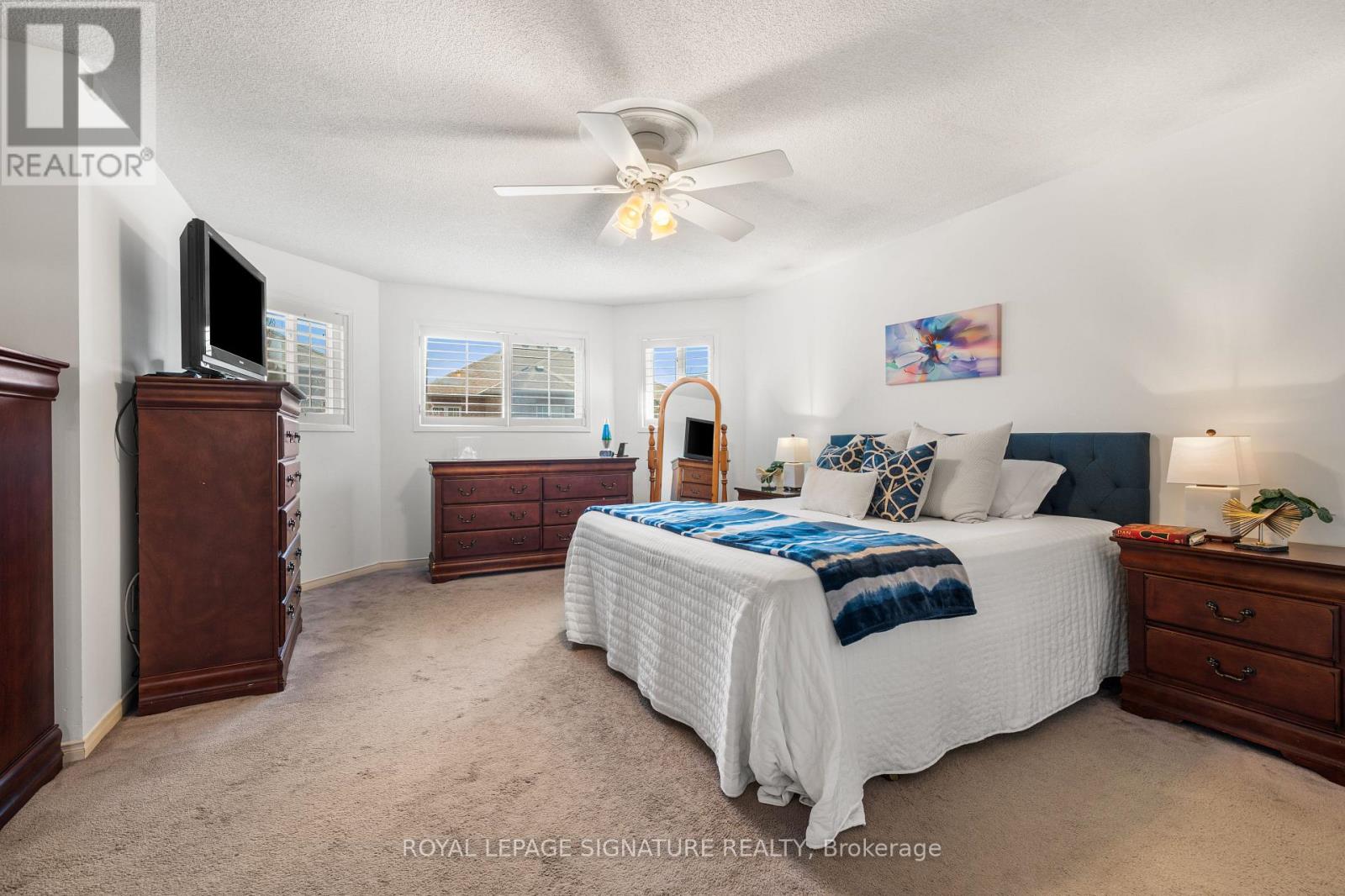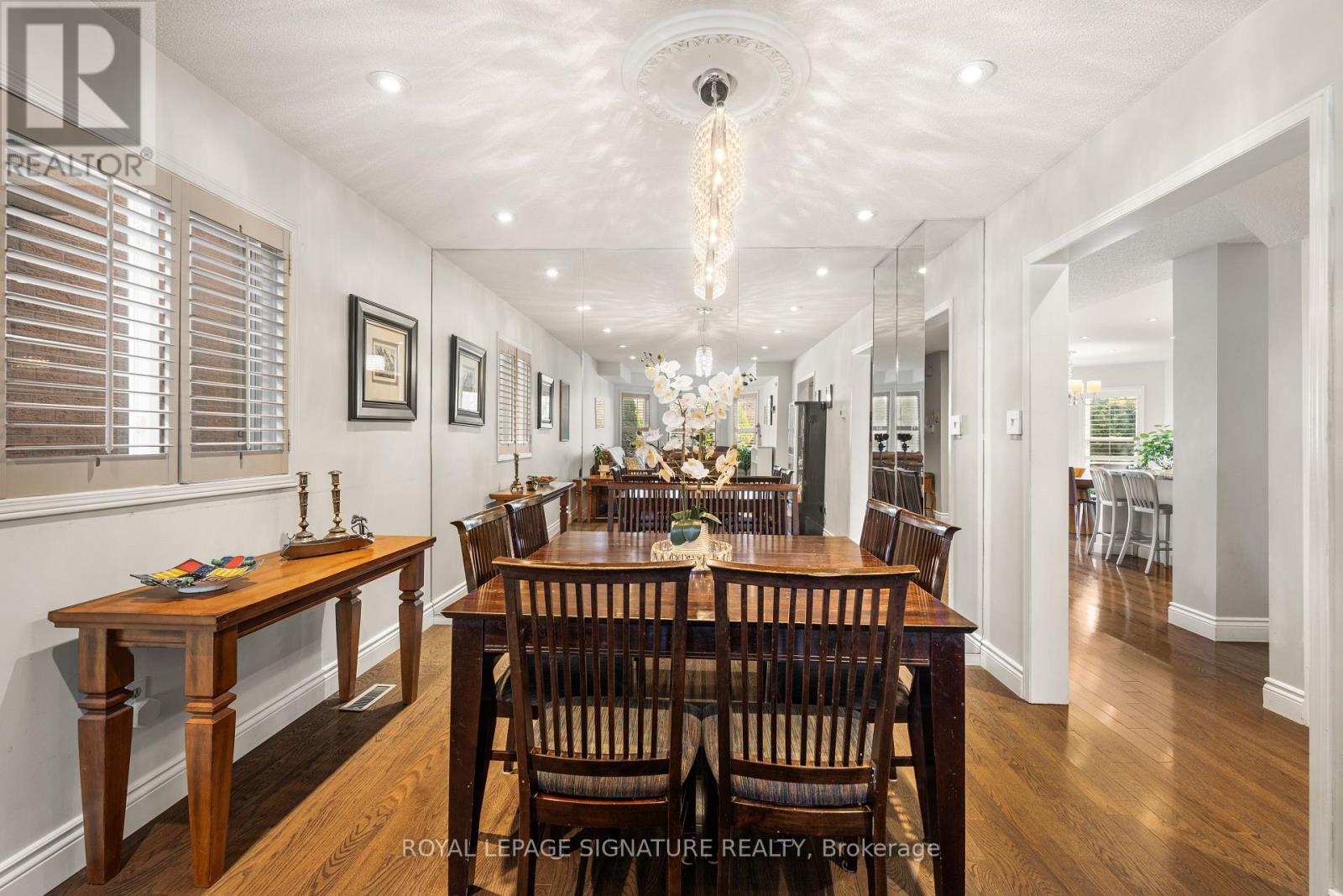 Nestled on a sought-after, family-friendly street, this beautifully maintained home offers a functional layout, quality finishes, and timeless design throughout. The main level features rich hardwood flooring, pot lights, and a grand curved wood staircase that creates an elegant first impression. A spacious living room with bay windows overlooks the front yard, while the formal dining room showcases a mirrored accent wall-ideal for entertaining. The kitchen is thoughtfully designed with a granite centre island, double sink, stainless steel appliances,built-in cabinetry and drawers, and a bright breakfast area with south-facing windows and a walk-out to the backyard. The inviting family room features a cozy wood-burning fireplace and overlooks the private rear yard. A convenient powder room and laundry room with sink, window,and built-in cabinetry complete the main floor. The second level offers four generously sized bedrooms, including a primary retreat with a bow window, double closets, and a spa-like 5-piece ensuite. A well-appointed 5-piece main bath serves the additional bedrooms. The finished lower level provides excellent versatility with two additional rooms-ideal as bedrooms, office, or gym-alongside a spacious recreation area with pot lights, ample storage including double and linen closets, and a 3-piece bathroom. A perfect blend of comfort, functionality, and location-this is a fantastic opportunity to own in a highly desirable neighbourhood. (id:64974)