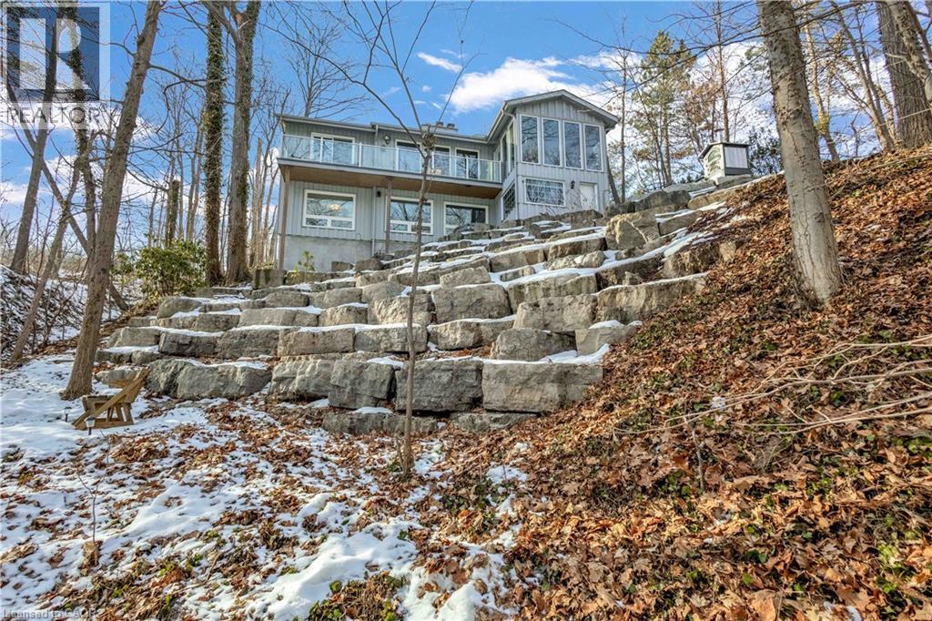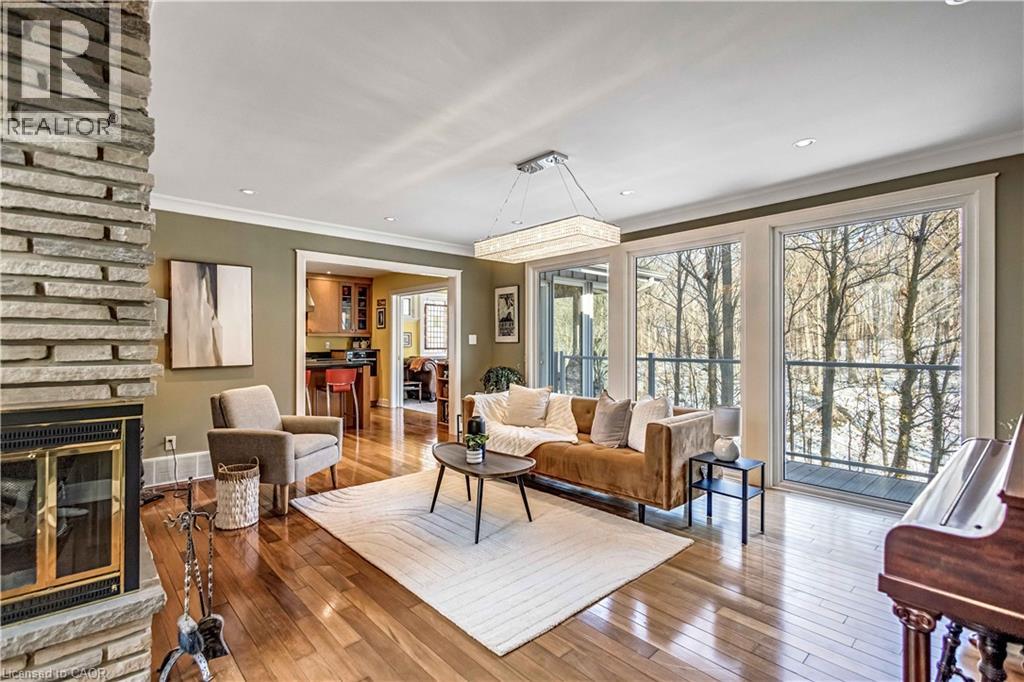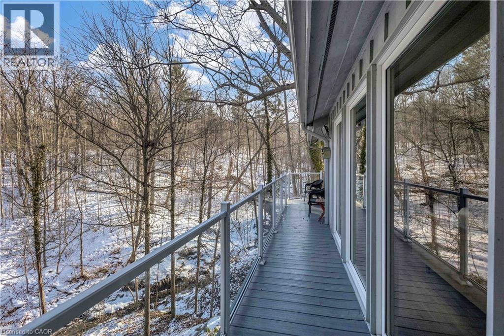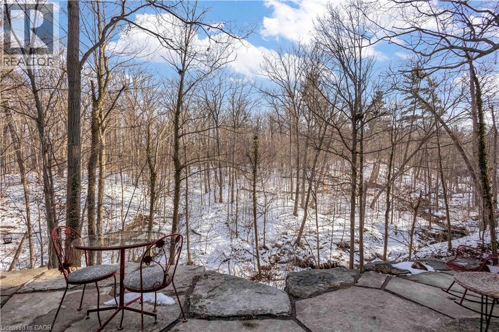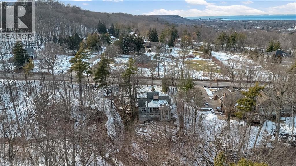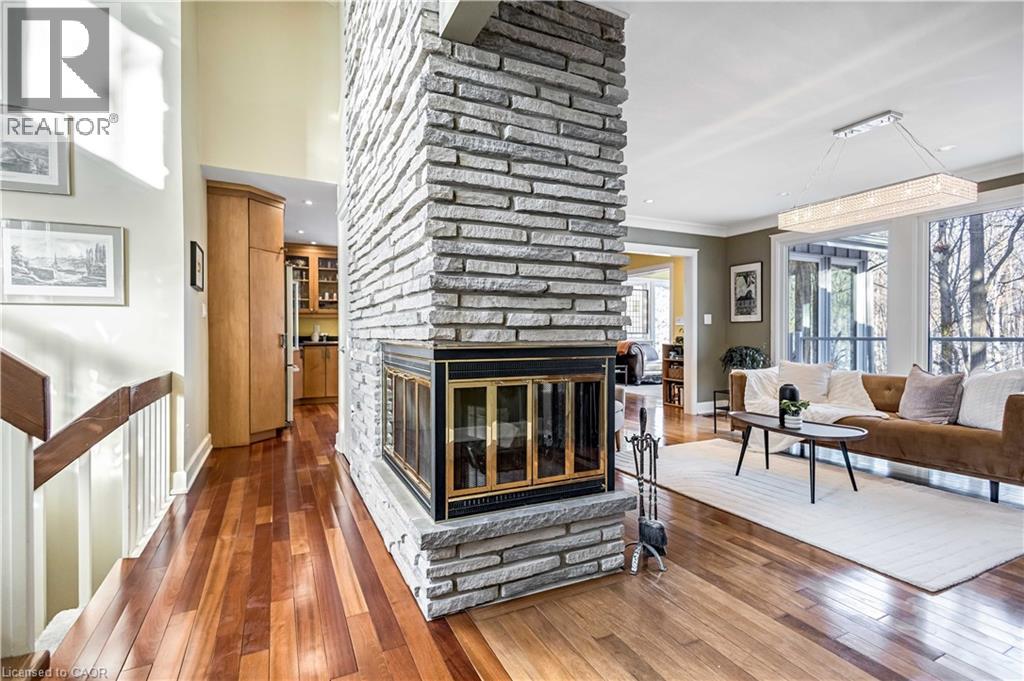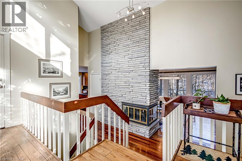 Tucked into the forest and backing directly onto the Bruce Trail and Grimsby Bench Nature Preserve, this ARCHITECTURALLY DISTINCTIVE retreat offers a RARE OPPORTUNITY to live completely immersed in nature — without sacrificing proximity to town, restaurants, and highway access. Designed for those who value COMPLETE PRIVACY, tranquility, and character over cookie-cutter living, every window frames a different woodland view, creating a true storybook setting throughout. A vaulted foyer welcomes you into a dramatic main living space featuring a striking three-way stone wood-burning fireplace, Brazilian hardwood floors, and walls of windows that blur the line between indoors and out. The thoughtfully designed kitchen balances everyday function with elevated entertaining, offering soapstone countertops, a 10-foot island with prep sink, custom detailing, and premium appliances including a Thermador gas range and steam oven, flowing seamlessly into a glass-enclosed sunroom and expansive balcony that stretches along the back of the home among the treetops. The upper level serves as a private primary retreat with balcony access, an oversized windowed dressing closet, and a spa-inspired bath featuring a jetted tub and infrared heat lamp for year-round comfort. The lower level provides exceptional flexibility with a spacious recreation room anchored by a second wood-burning fireplace, two additional bedrooms, a full bath, and a dedicated office with walk-out access ideal for remote work or guest accommodation. Outdoors, terraced stone landscaping, a pizza oven, hot tub, and direct forest access create a secluded escape, while an eight-car driveway and garage with inside entry add everyday convenience. This ONE-OF-A-KIND property is perfectly suited for buyers seeking a refined woodland lifestyle in one of Grimsby’s most desirable locations. RSA. (id:64974)