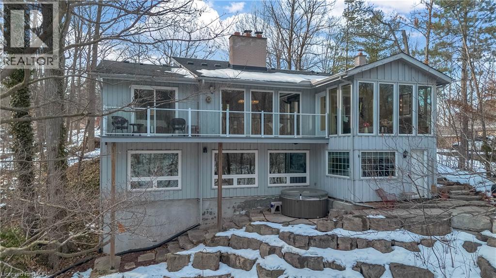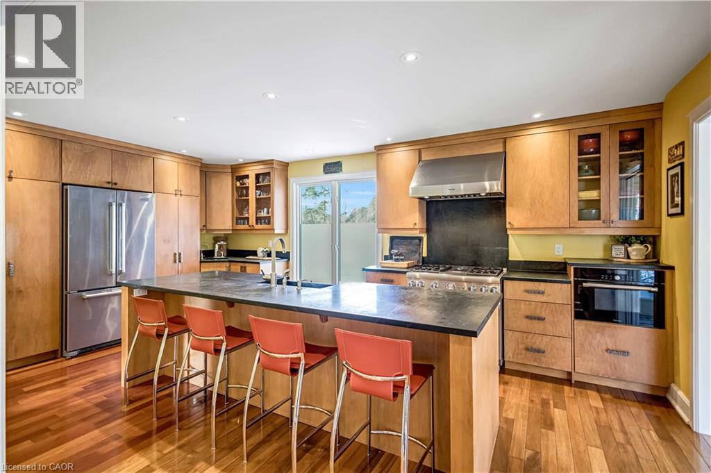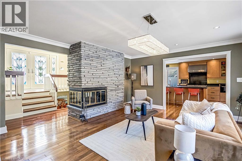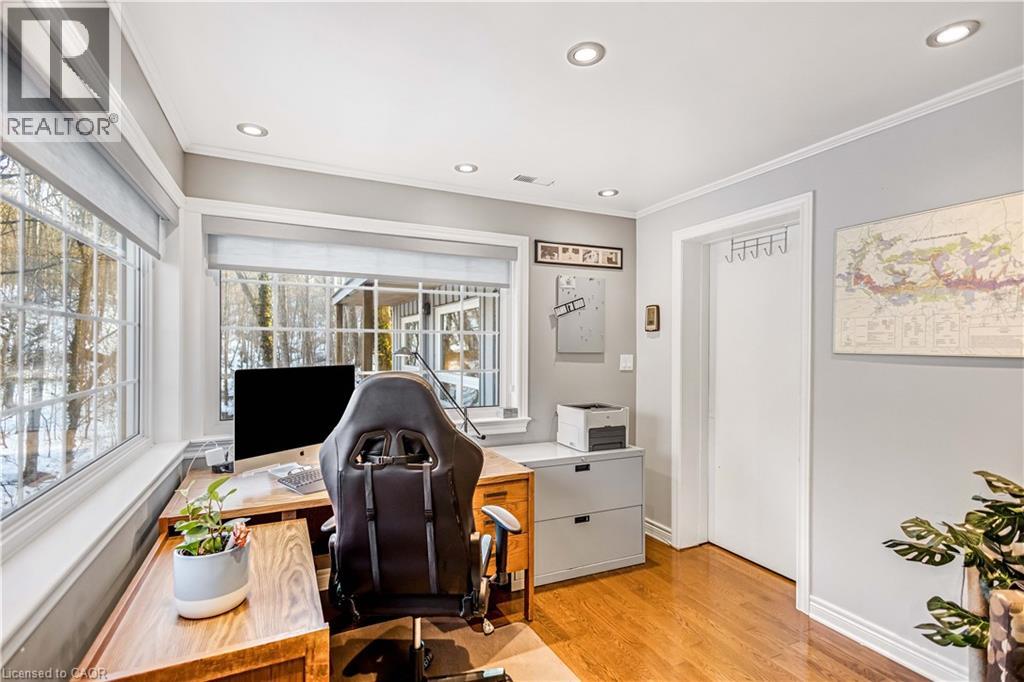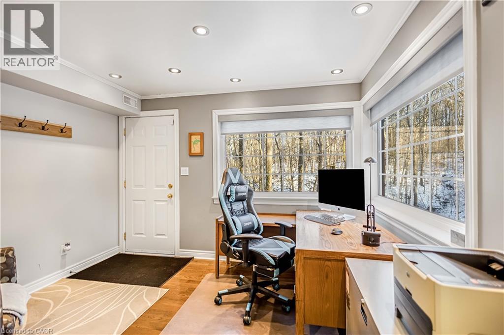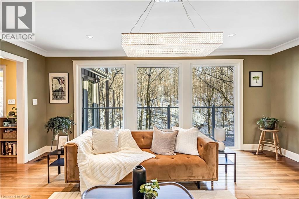 Tucked into the forest and backing directly onto the Bruce Trail and Grimsby Bench Nature Preserve, this ARCHITECTURALLY DISTINCTIVE retreat offers a RARE OPPORTUNITY to live completely immersed in nature — without sacrificing proximity to town, restaurants, and highway access. Designed for those who value COMPLETE PRIVACY, tranquility, and character over cookie-cutter living, every window frames a different woodland view, creating a true storybook setting throughout. A vaulted foyer welcomes you into a dramatic main living space featuring a striking three-way stone wood-burning fireplace, Brazilian hardwood floors, and walls of windows that blur the line between indoors and out. The thoughtfully designed kitchen balances everyday function with elevated entertaining, offering soapstone countertops, a 10-foot island with prep sink, custom detailing, and premium appliances including a Thermador gas range and steam oven, flowing seamlessly into a glass-enclosed sunroom and expansive balcony that stretches along the back of the home among the treetops. The upper level serves as a private primary retreat with balcony access, an oversized windowed dressing closet, and a spa-inspired bath featuring a jetted tub and infrared heat lamp for year-round comfort. The lower level provides exceptional flexibility with a spacious recreation room anchored by a second wood-burning fireplace, two additional bedrooms, a full bath, and a dedicated office with walk-out access ideal for remote work or guest accommodation. Outdoors, terraced stone landscaping, a pizza oven, hot tub, and direct forest access create a secluded escape, while an eight-car driveway and garage with inside entry add everyday convenience. This ONE-OF-A-KIND property is perfectly suited for buyers seeking a refined woodland lifestyle in one of Grimsby’s most desirable locations. RSA. (id:64974)