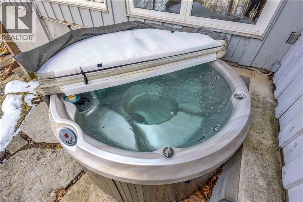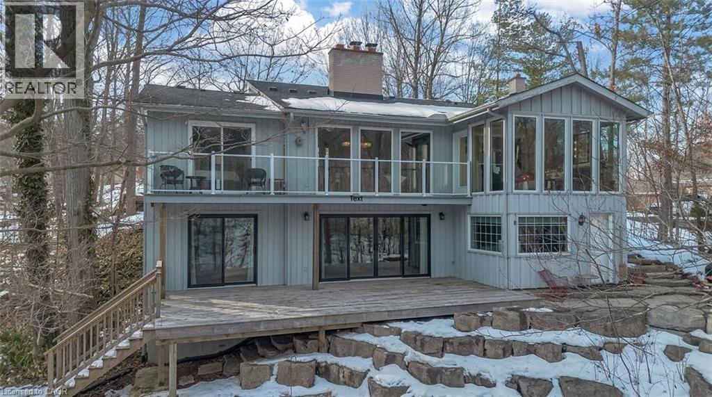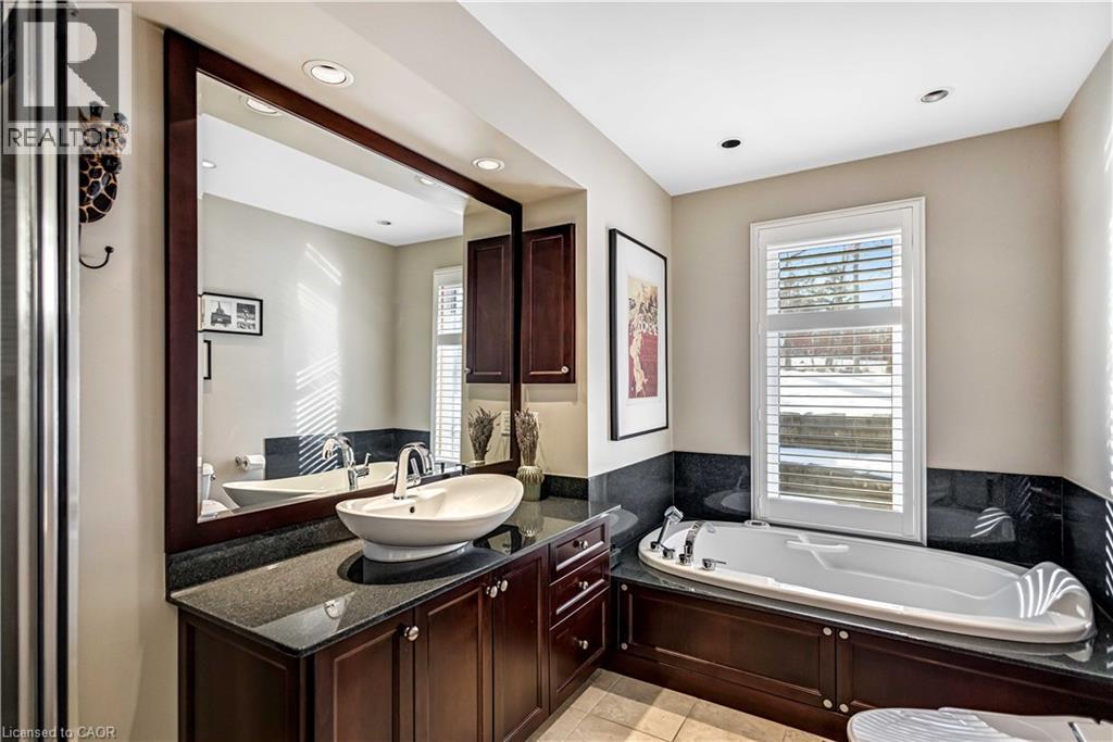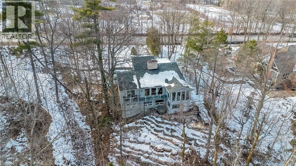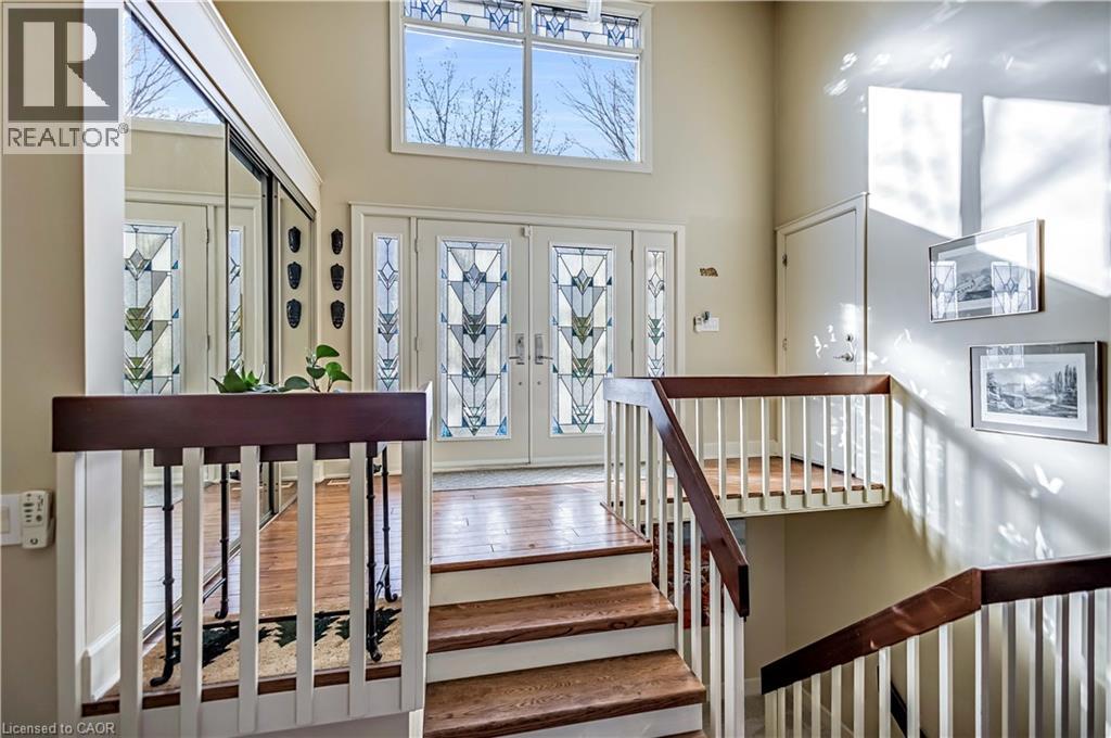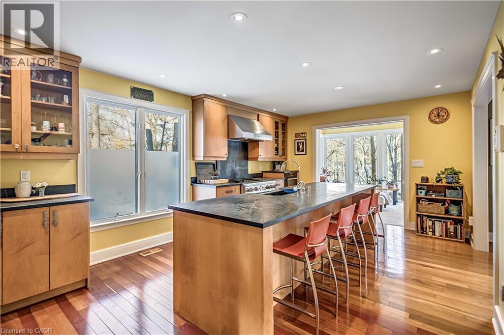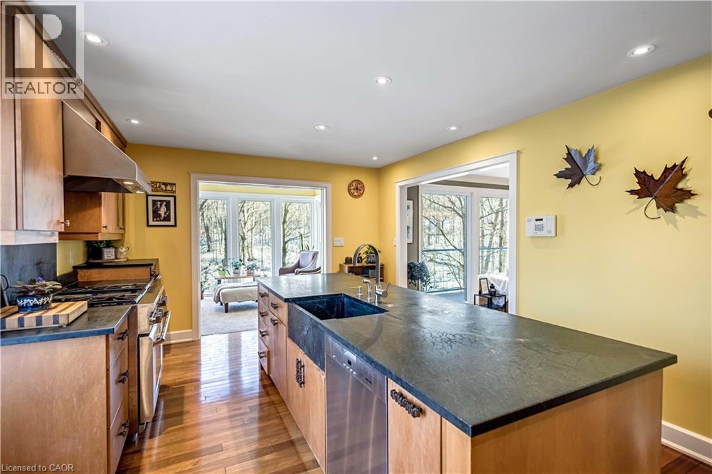 Tucked into the forest and backing directly onto the Bruce Trail and Grimsby Bench Nature Preserve, this ARCHITECTURALLY DISTINCTIVE retreat offers a RARE OPPORTUNITY to live completely immersed in nature — without sacrificing proximity to town, restaurants, and highway access. Designed for those who value COMPLETE PRIVACY, tranquility, and character over cookie-cutter living, every window frames a different woodland view, creating a true storybook setting throughout. A vaulted foyer welcomes you into a dramatic main living space featuring a striking three-way stone wood-burning fireplace, Brazilian hardwood floors, and walls of windows that blur the line between indoors and out. The thoughtfully designed kitchen balances everyday function with elevated entertaining, offering soapstone countertops, a 10-foot island with prep sink, custom detailing, and premium appliances including a Thermador gas range and steam oven, flowing seamlessly into a glass-enclosed sunroom and expansive balcony that stretches along the back of the home among the treetops. The upper level serves as a private primary retreat with balcony access, an oversized windowed dressing closet, and a spa-inspired bath featuring a jetted tub and infrared heat lamp for year-round comfort. The lower level provides exceptional flexibility with a spacious recreation room anchored by a second wood-burning fireplace, two additional bedrooms, a full bath, and a dedicated office with walk-out access ideal for remote work or guest accommodation. Outdoors, terraced stone landscaping, a pizza oven, hot tub, and direct forest access create a secluded escape, while an eight-car driveway and garage with inside entry add everyday convenience. This ONE-OF-A-KIND property is perfectly suited for buyers seeking a refined woodland lifestyle in one of Grimsby’s most desirable locations. RSA. (id:64974)