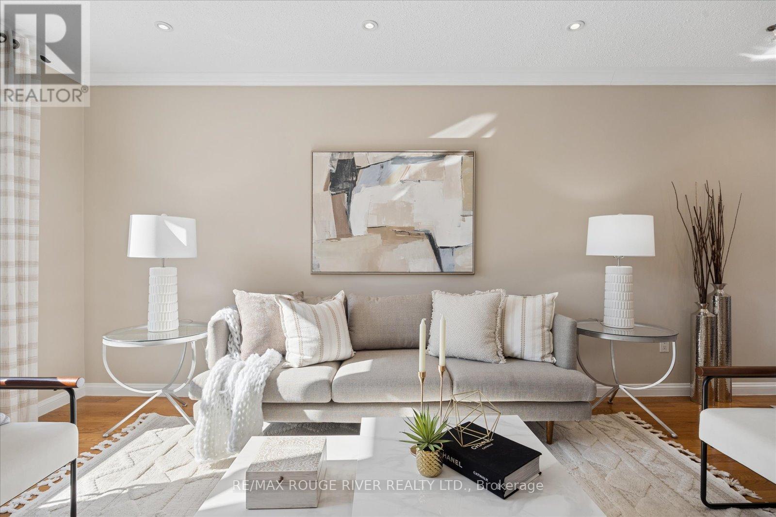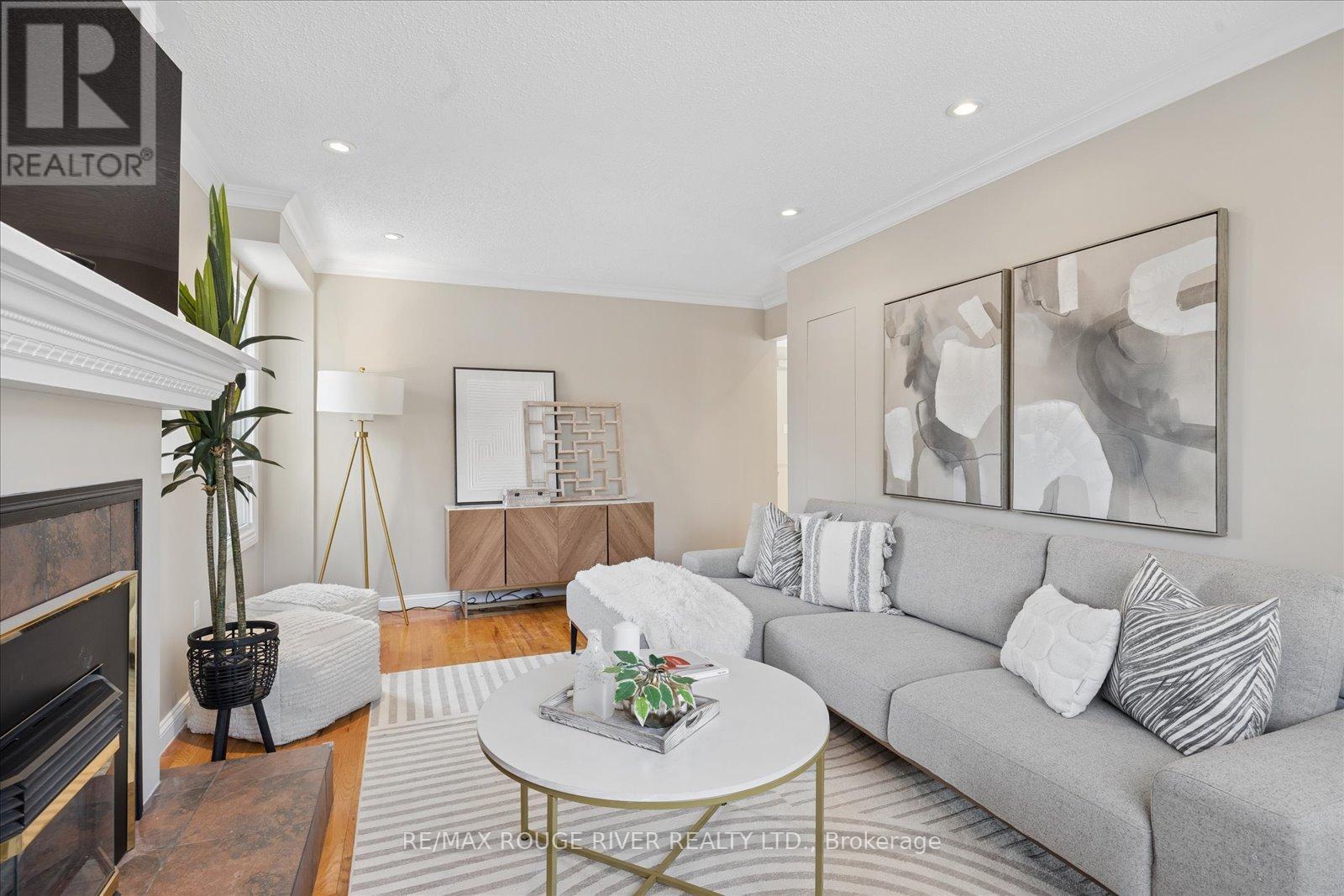 Located in South Pickering's prestigious Rosebank, this 2,242 sq. ft. residence is perfectly situated within walking distance of the scenic trails of Petticoat Creek Conservation Area, Rouge Beach, and the Rosebank Road Tennis Club. The home is bathed in natural light, featuring a bright, sun-filled layout that begins with a sweeping staircase in the grand foyer. Hardwood floors flow through the main level, leading into a spacious family room anchored by a cozy gas fireplace. The heart of the home is the renovated eat-in kitchen, a chef's delight featuring sleek Corian countertops, a built-in stainless oven and microwave, cooktop, and integrated dishwasher. From the kitchen, walk out to a private deck overlooking a serene, treed backyard retreat complete with a custom-built shed. The hardwood continues throughout most of the second floor, which offers four generously sized bedrooms. The primary suite is a true getaway, offering a spacious walk-in closet and a beautifully renovated 4-piece ensuite with a large glass-enclosed shower. The living space extends to a finished basement designed for wellness and leisure, featuring a large recreation room, a dedicated fitness area with a rough-in for a sauna, and a convenient 3-piece bathroom. This home is topped with a durable, long-lasting steel roof and features a 2-car garage, all located just steps from Rick Hall Memorial Park and top-rated schools. (id:64974)