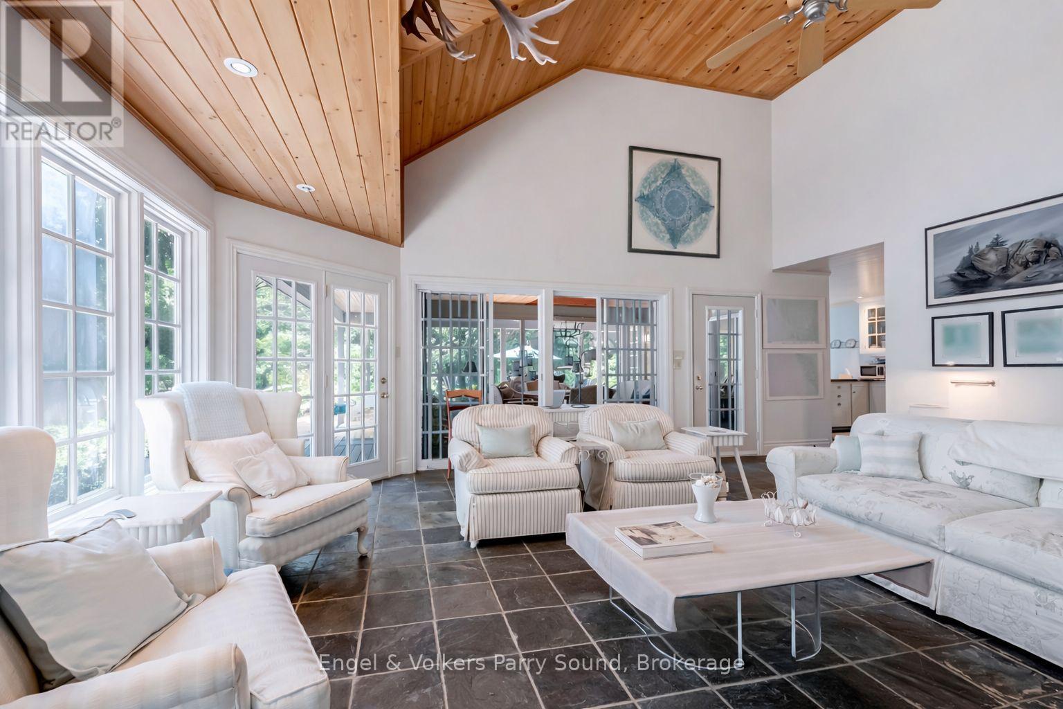 Welcome to an unparalleled Georgian Bay retreat--an exclusive 18+ acre estate on the highly coveted Mowat Island, just 10 minutes by boat from Hwy 400 & two local marinas (Harrison Landing & Carling Bay). Offering exceptional privacy, this legacy island property features 1,575' of pristine shoreline, where smooth granite outcrops meet a natural 400' sandy beach & sheltered lagoon with shallow, child-friendly entry. Crafted by Spragge & Company Architects & constructed by renowned builder Ron Bowman, the main cottage is a timeless blend of classic cottage warmth & refined design, seamlessly integrating indoor & outdoor living. Vaulted pine ceilings with dormers, slate floors & a dramatic floor-to-ceiling cultured stone fireplace set the tone for relaxed elegance. An inviting sunroom bathed in natural light offers water & forest views, while the custom kitchen boasts abundant cabinetry & premium finishes. The principal bedroom features a walkout to the deck & a second-level loft provides a cozy retreat for children or guests. Expansive panoramic southeast views of Parry Sound are matched only by the private west facing point, ideal for unforgettable sunset gatherings. With two deep-water docks, the shoreline accommodates larger vessels, making arrival & exploration effortless. A charming guest bunkie sits just steps from the beach, complete with kitchen amenities, a 2-pc bath & a secluded outdoor shower perfect for hosting family or friends in comfort & style. Wander the picturesque walking trails that wind through the property's mature forest, discover foraging delights, or relax at the tent platform perched on an elevated rock face, where sweeping views create a tranquil escape. Zoning allows for a second full cottage on the property, and the existing Managed Forest Tax Incentive Plan (MFTIP) offers notable tax savings. Turn-key and fully furnished, this one-of-a-kind island estate is ready for immediate enjoyment. (id:64974)
