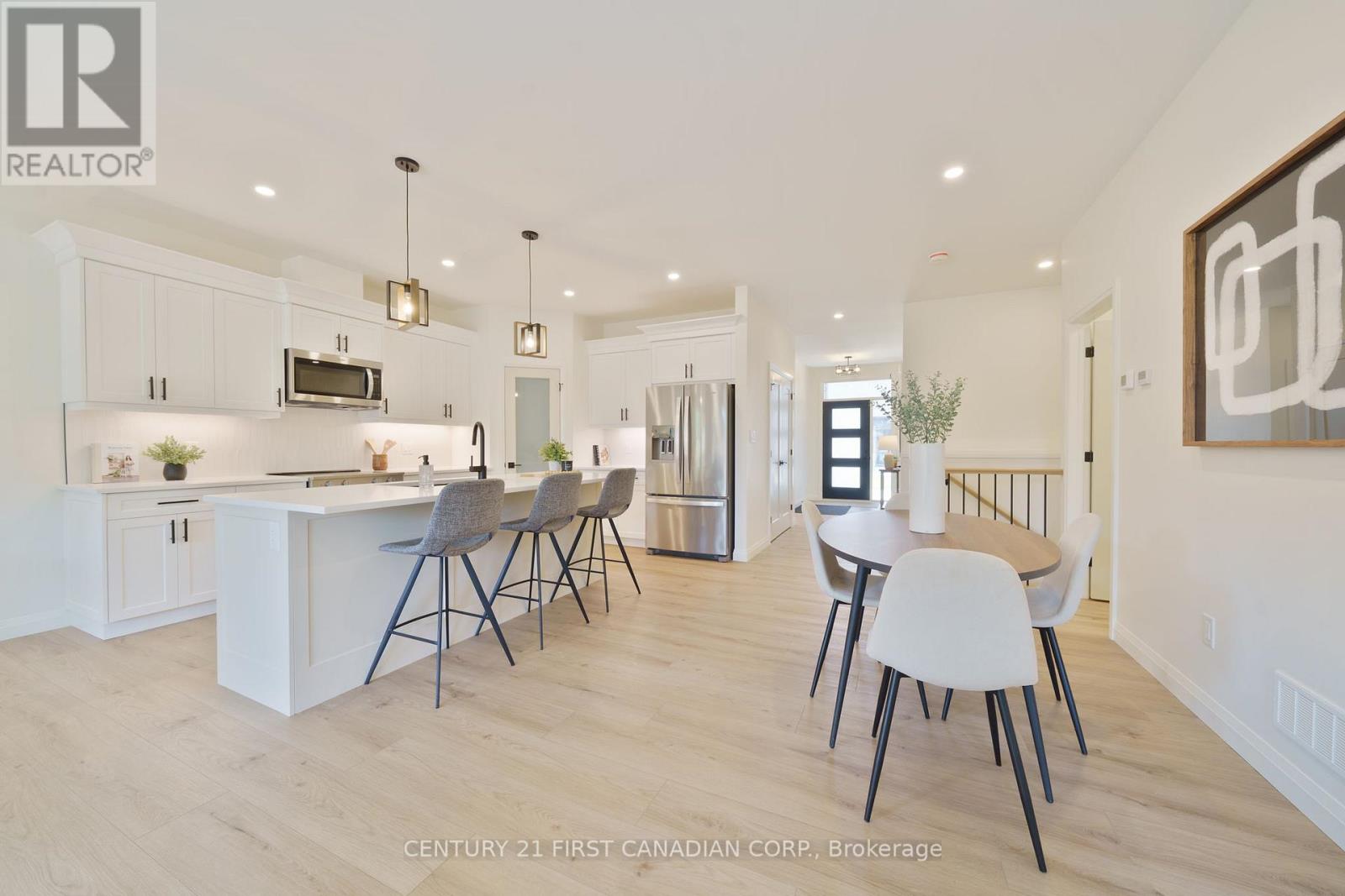 MOVE IN READY! Welcome to the Ausable Bluffs of Ailsa Craig, a beautifully crafted single-floor freehold condo built by Morrison Homes, known for quality construction and thoughtful design. This modern residence offers an open-concept main floor featuring 2 spacious bedrooms and 2 well-appointed bathrooms. The kitchen is highlighted by sleek quartz countertops, stylish wood cabinetry, and contemporary finishes, perfect for both everyday living and entertaining. Throughout the home, luxury vinyl flooring adds both durability and timeless appeal for today's busy families. The unfinished basement provides a generous footprint with a rough-in bathroom, offering excellent potential to customize and expand your living space to suit your needs. Blending practicality with refined style, this Morrison Homes build presents an exceptional opportunity to enjoy modern living in the heart of Ailsa Craig. The common element fee includes full lawn care, full snow removal, common area expenses, and management fees. **Property tax and assessment not yet set. Note: Interior photos are from a similar model; some upgrades or finishes may not be included.** (id:64974)