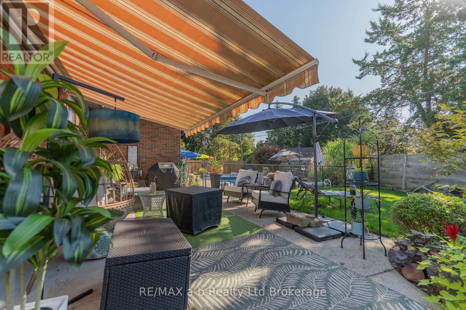 Welcome to this charming and well-maintained brick bungalow, ideally situated just steps from Glendale High School in a mature, family-friendly neighbourhood. Set on a generous pie-shaped lot, this home offers a wonderful blend of comfort, functionality, and outdoor enjoyment - with many recent updates already completed.The freshly updated living room is warm and inviting, featuring new pot lights, updated flooring, and fresh paint throughout, complemented by large windows that flood the space with natural light. The eat-in kitchen provides a welcoming spot for everyday meals or casual gatherings with family and friends. The primary bedroom includes access to a convenient 2-piece cheater ensuite, while the main bathroom has been refreshed with a newer vanity for a clean, modern feel.The lower level expands your living space with a finished recreation room and dedicated office area, making it ideal for family movie nights, hobbies, or working comfortably from home.Step outside and discover where this property truly shines. Multiple outdoor living areas include a private, fenced front patio and recently poured concrete patios in the backyard - perfect for entertaining or unwinding at the end of the day. Summer living is a breeze with your own in-ground pool, surrounded by a spacious yard designed for both relaxation and play. An oversized driveway offers ample parking for family and guests.A terrific opportunity to own a move-in ready home in a sought-after location - this one is not to be missed! (id:64974)