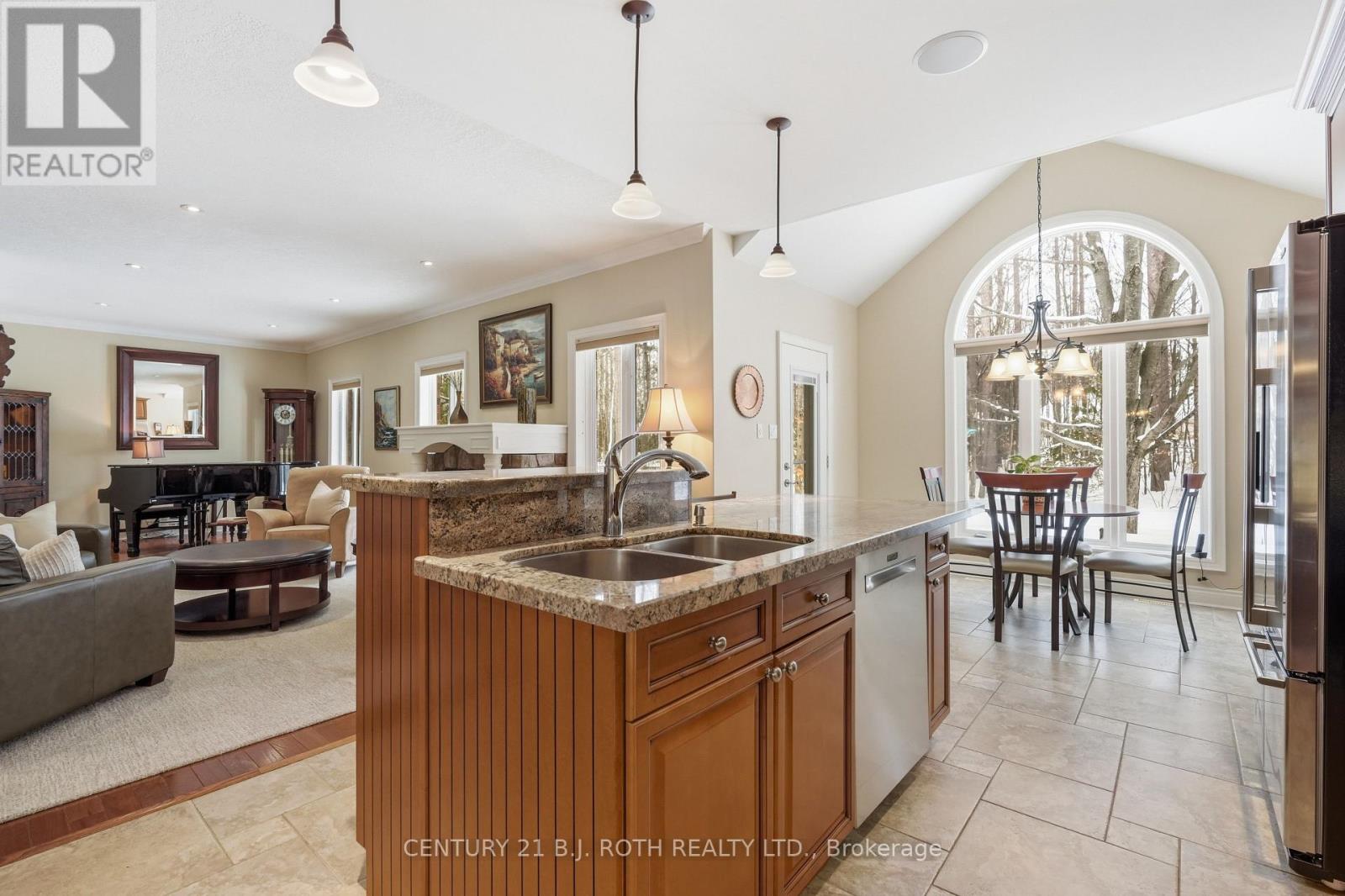 Timeless Estate Living in One of Simcoe County's Most Prestigious Enclaves. Gracefully poised on a private, fully landscaped estate lot framed by towering mature trees, this former model home by esteemed builder S.L. Witty is a masterclass in timeless architecture and enduring craftsmanship. A grand stone walkway and impeccably manicured grounds create a striking arrival, setting the tone for the elegance within. Inside, a thoughtfully designed split-bedroom layout offers 3 bedrooms, 4 bathrooms, and an impressive loft, blending refined privacy with exceptional functionality. The open-concept main level is illuminated by expansive windows that flood the home with natural light. Rich hardwood floors, crown moulding, California knockdown ceilings, and a gas fireplace create a warm yet sophisticated ambiance. At the heart of the residence, the gourmet kitchen showcases stainless steel appliances, gleaming granite countertops, and seamless flow into the living and dining areas, perfectly suited for elegant entertaining and elevated everyday living. The primary suite is a private sanctuary, complete with a walk-in closet, luxurious 5-pc. ensuite, and walkout to the serene backyard retreat. Above, the expansive loft with its own 2-pc. bath offers exceptional versatility, ideal as an executive office, guest suite, or media lounge. The fully finished lower level extends the living space with an additional bedroom, full 3-pc. bath, fully equipped wet bar, spacious recreation & games area, and abundant storage, designed for entertaining and multigenerational comfort. Outdoors, a stone patio anchors the professionally landscaped grounds, offering rare privacy and tranquility. Perfectly positioned to enjoy the best of the region, this distinguished residence is moments from prestigious golf courses, the fresh harvests of Barrie Hill Farms, and premier ski resorts, offering four-season recreation and an exceptional lifestyle in one of Simcoe County's most coveted neighbourhoods. (id:64974)