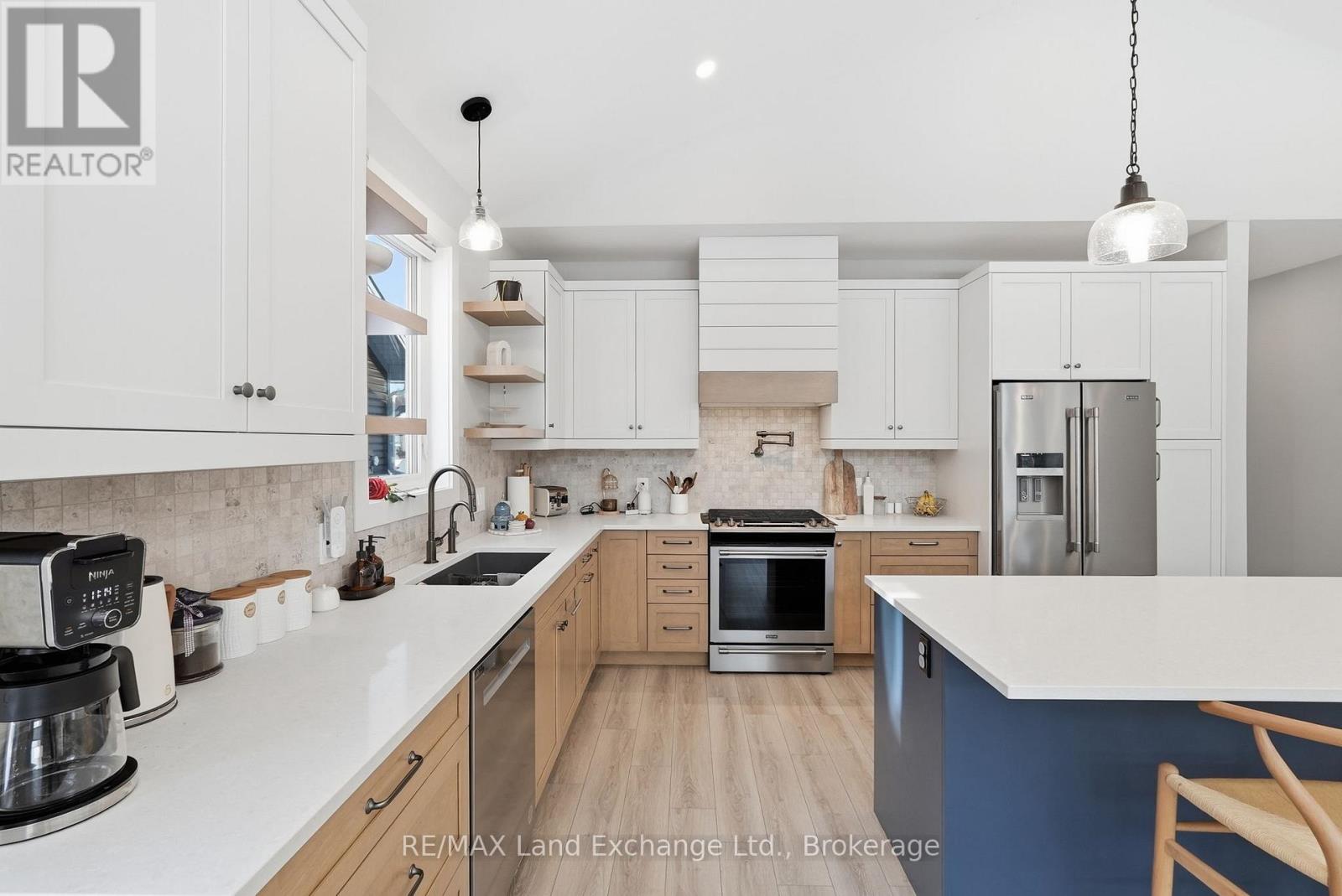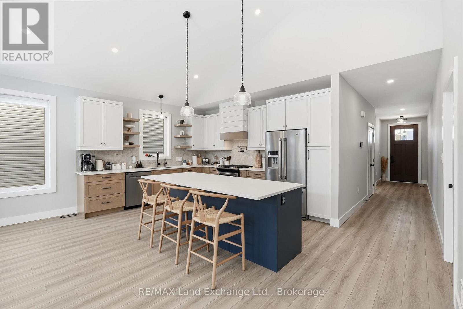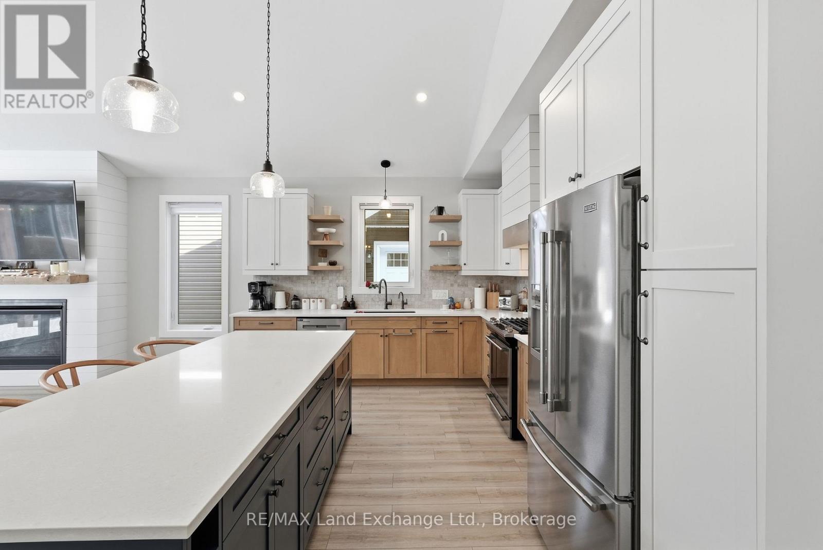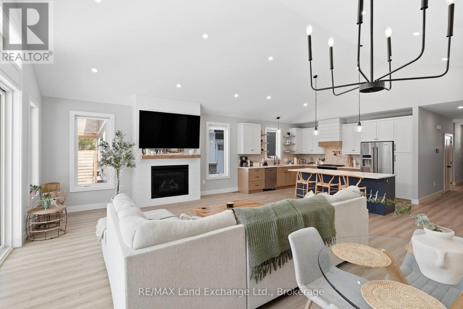 Welcome to 6 Marshall Place in the highly sought-after Southampton Landing community in beautiful Southampton. Built by renowned builder Alair Homes just four years ago, this thoughtfully designed 1,671 sq ft bungalow blends quality craftsmanship with stylish, family-friendly finishes. From the moment you step onto the covered front porch and into the spacious foyer, you'll appreciate the smart layout. At the front of the home, two generous bedrooms and a stunning 4-piece bath featuring custom tile work and a unique designer sink that adds personality and charm. Luxury vinyl plank flooring runs throughout-durable, scratch-resistant, and ideal for busy families or pets.The heart of the home is the breathtaking open-concept kitchen, living, and dining area, highlighted by cathedral ceilings and oversized patio doors that flood the space with natural light. The kitchen is a showstopper with white upper cabinetry, light oak lowers, a navy island, quartz countertops, custom shelving, and statement lighting. Built in stainless steel appliances all included. The cozy gas fireplace with shiplap surround creates a warm focal point for gatherings. Privately tucked at the rear of the home, the spacious primary suite offers built-in closet systems, and a luxurious 4-piece ensuite complete with a large tiled shower and double vanity. Even the laundry/mudroom off the oversized single car garage is elevated with custom cabinetry, drawers, and exceptional storage. The accessible crawl space adds even more practical storage options. Step outside to a generous covered back deck-perfect for summer entertaining and relaxing evenings. Move in, unpack, and enjoy everything Southampton has to offer this summer. Book your private showing today. (id:64974)