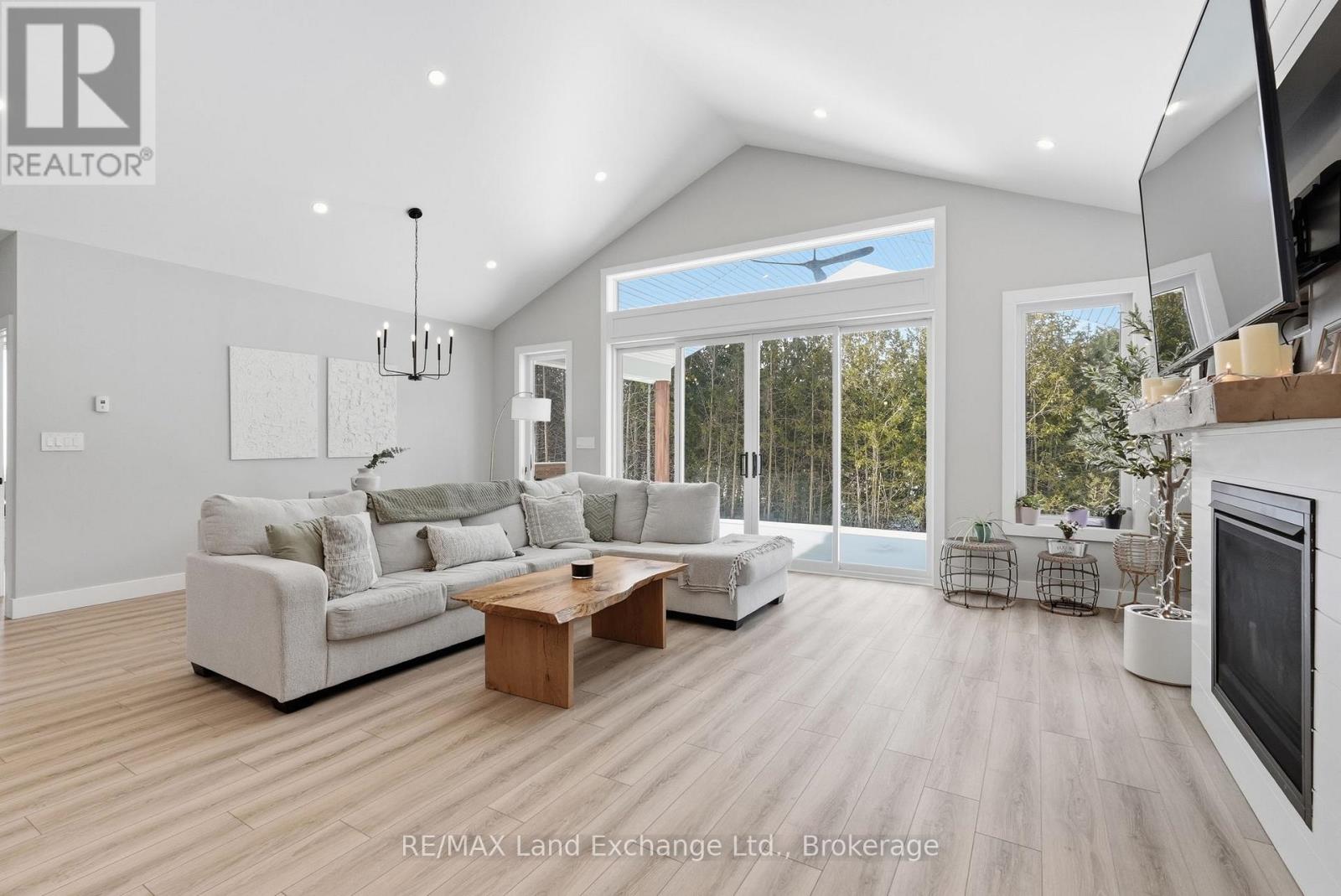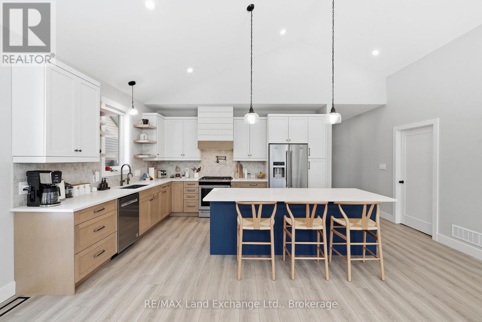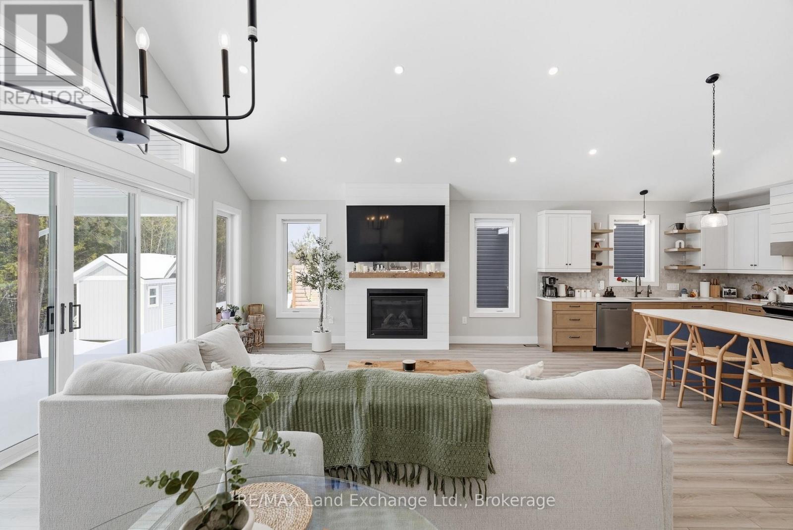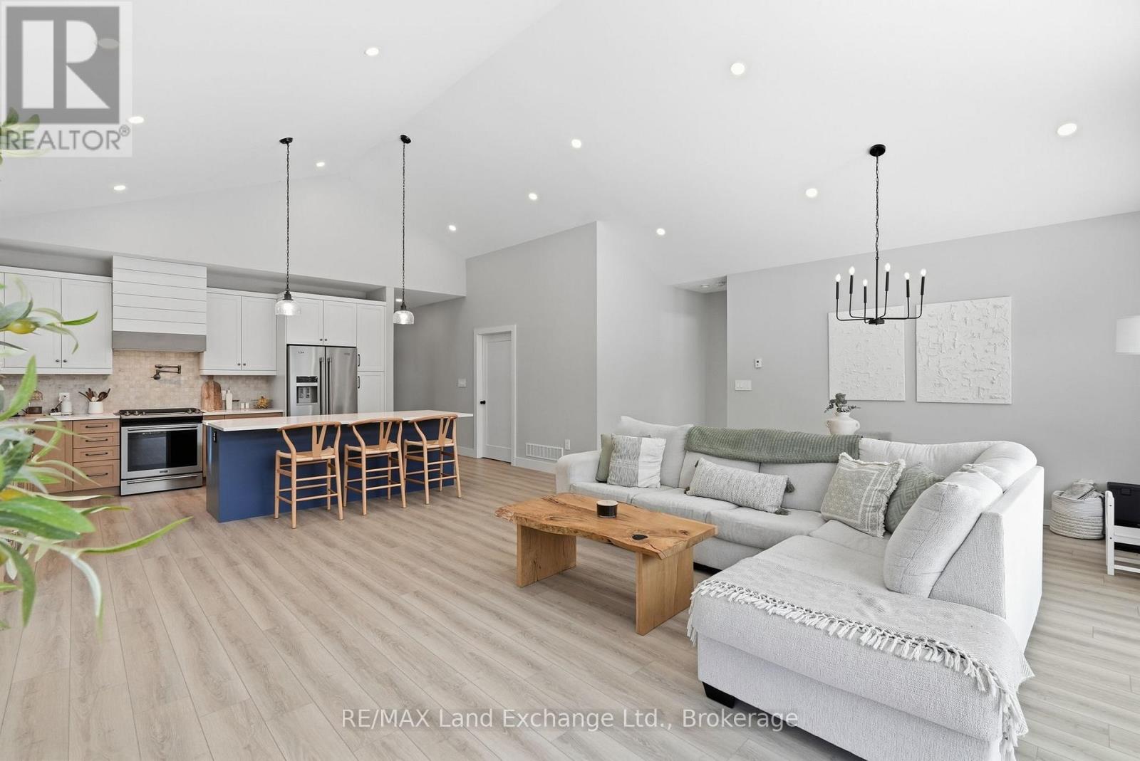 Welcome to 6 Marshall Place in the highly sought-after Southampton Landing community in beautiful Southampton. Built by renowned builder Alair Homes just four years ago, this thoughtfully designed 1,671 sq ft bungalow blends quality craftsmanship with stylish, family-friendly finishes. From the moment you step onto the covered front porch and into the spacious foyer, you'll appreciate the smart layout. At the front of the home, two generous bedrooms and a stunning 4-piece bath featuring custom tile work and a unique designer sink that adds personality and charm. Luxury vinyl plank flooring runs throughout-durable, scratch-resistant, and ideal for busy families or pets.The heart of the home is the breathtaking open-concept kitchen, living, and dining area, highlighted by cathedral ceilings and oversized patio doors that flood the space with natural light. The kitchen is a showstopper with white upper cabinetry, light oak lowers, a navy island, quartz countertops, custom shelving, and statement lighting. Built in stainless steel appliances all included. The cozy gas fireplace with shiplap surround creates a warm focal point for gatherings. Privately tucked at the rear of the home, the spacious primary suite offers built-in closet systems, and a luxurious 4-piece ensuite complete with a large tiled shower and double vanity. Even the laundry/mudroom off the oversized single car garage is elevated with custom cabinetry, drawers, and exceptional storage. The accessible crawl space adds even more practical storage options. Step outside to a generous covered back deck-perfect for summer entertaining and relaxing evenings. Move in, unpack, and enjoy everything Southampton has to offer this summer. Book your private showing today. (id:64974)