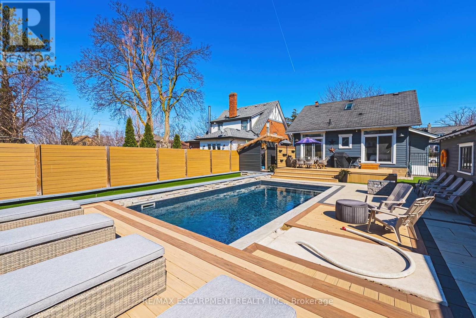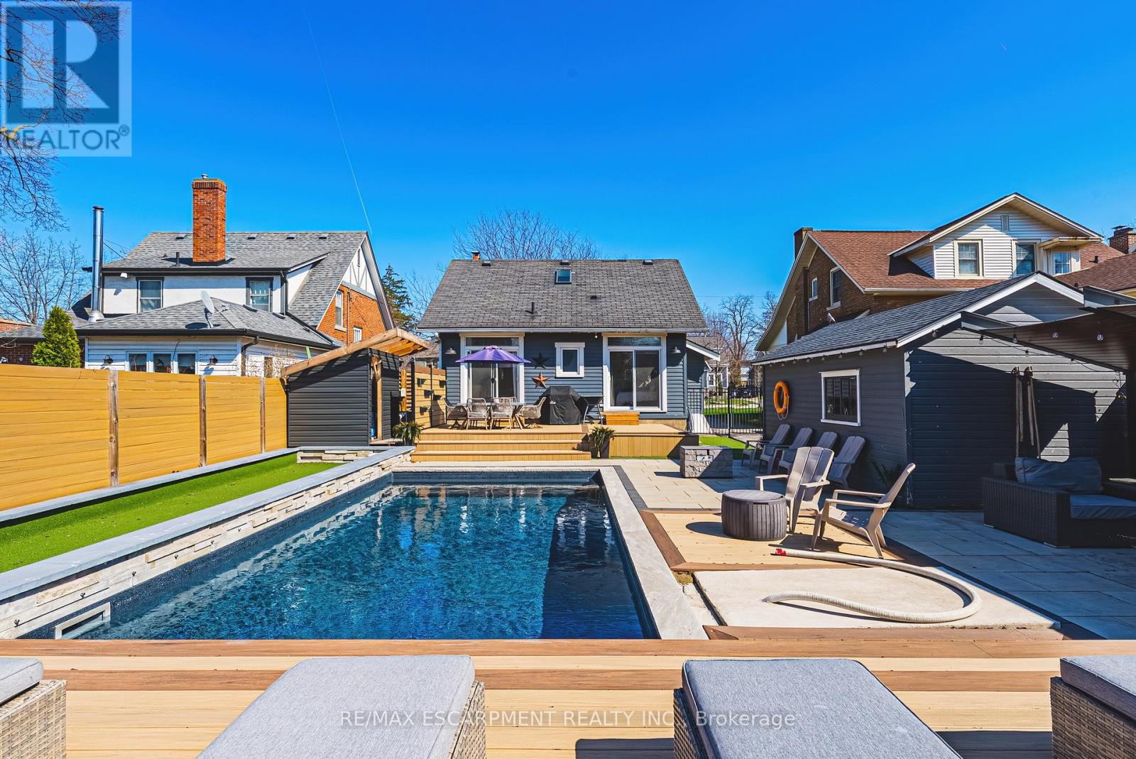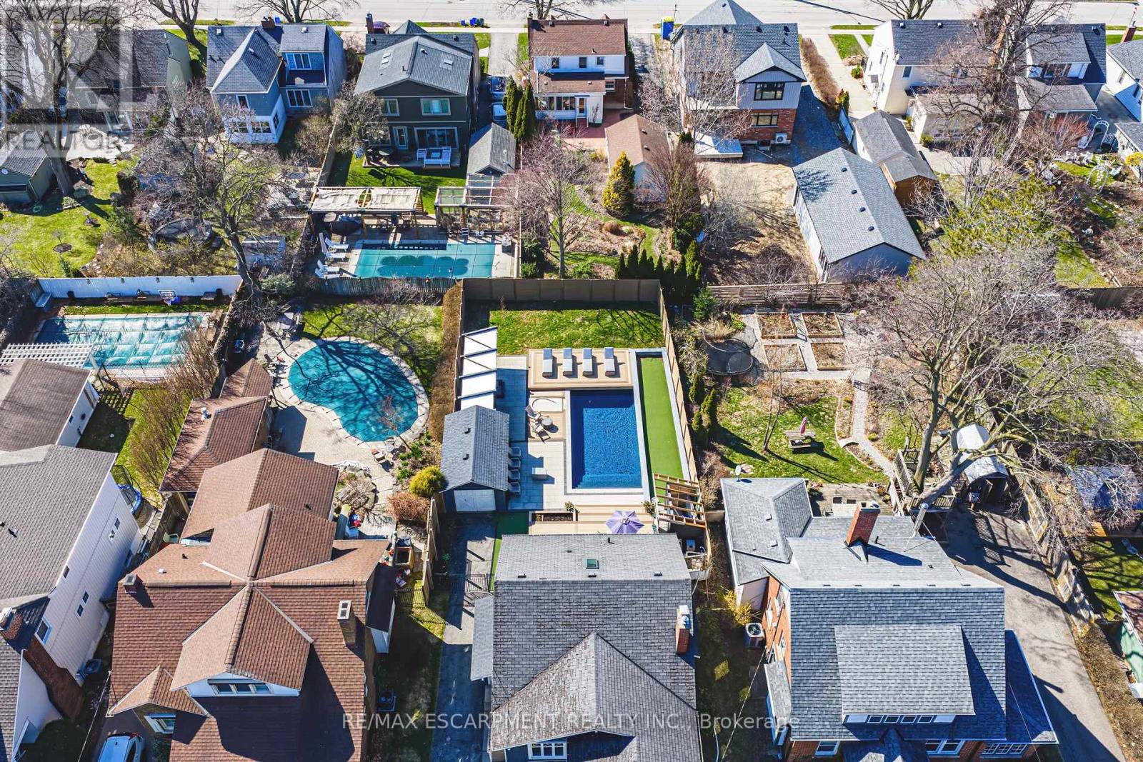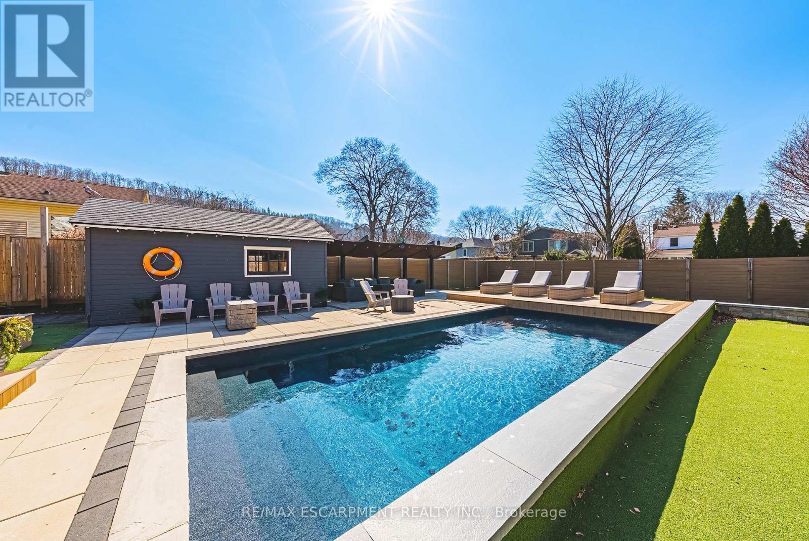 Summer awaits you, at 6 Nelles Blvd! Ideally situated in one of Grimsby's most sought-after neighbourhoods.Surrounded by mature trees and offering stunning Escarpment views, this location provides the perfect blend of tranquility and convenience, just moments from all amenities. Set on an oversized lot, the backyard is a true private oasis.In 2021 a full luxury backyard renovation was completed. Enjoy an in-ground saltwater pool, bocce ball court, composite decking, and a cozy gas fireplace-perfect for entertaining or relaxing. With so many exceptional features, this outdoor space is exceptional. The beautifully finished, move-in ready home features two main floor bedrooms, each with walkouts to the backyard. The upper level boasts a luxurious primary suite complete with a skylight and a private ensuite, creating a bright and serene retreat. The gourmet kitchen is thoughtfully designed, featuring high-end finishes and a cozy built-in breakfast nook-perfect for casual dining and everyday living. The living room is complete with a wood burning fireplace, perfect for a night in. With so many exceptional features, this home and outdoor space truly has it all. Ample parking for up to five vehicles adds to the home's exceptional functionality and convenience. Walk to the village of Grimsby with shops and restaurants. This is a place to call home. (id:64974)