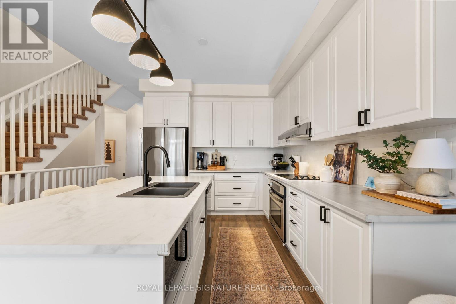 The most stylish and move-in-ready townhouse in Halton Hills, where thoughtful design meets effortless everyday living. Offering more than 1,700 square feet of finished space plus a full walk-out lower level, this home provides the versatility buyers want. The bright open-concept main level delivers an immediate sense of flow. Large windows fill the living and dining areas with natural light, while the walk-out balcony extends entertaining outdoors. At the center of the home, the kitchen features stainless steel appliances, generous cabinetry and a large island, offering excellent prep space for both daily routines and hosting. A main floor powder room adds convenience for guests. Upstairs, the primary bedroom retreat includes a walk-in closet and private four-piece ensuite. Two additional bedrooms each offer their own walk-in closets, a rare and valuable feature in townhome living, making the layout ideal for families, visitors, or work-from-home needs. The finished walk-out lower level adds exceptional flexibility, perfect for a recreation room, media space, office or guest suite. The updated laundry keeps the upper floors peaceful and organized. Two parking spaces and a location close to shopping, schools, parks, and commuter routes complete the package. For buyers seeking a turn-key townhouse in Halton Hills with modern finishes, parking, and room to grow, this home delivers on all levels. (id:64974)