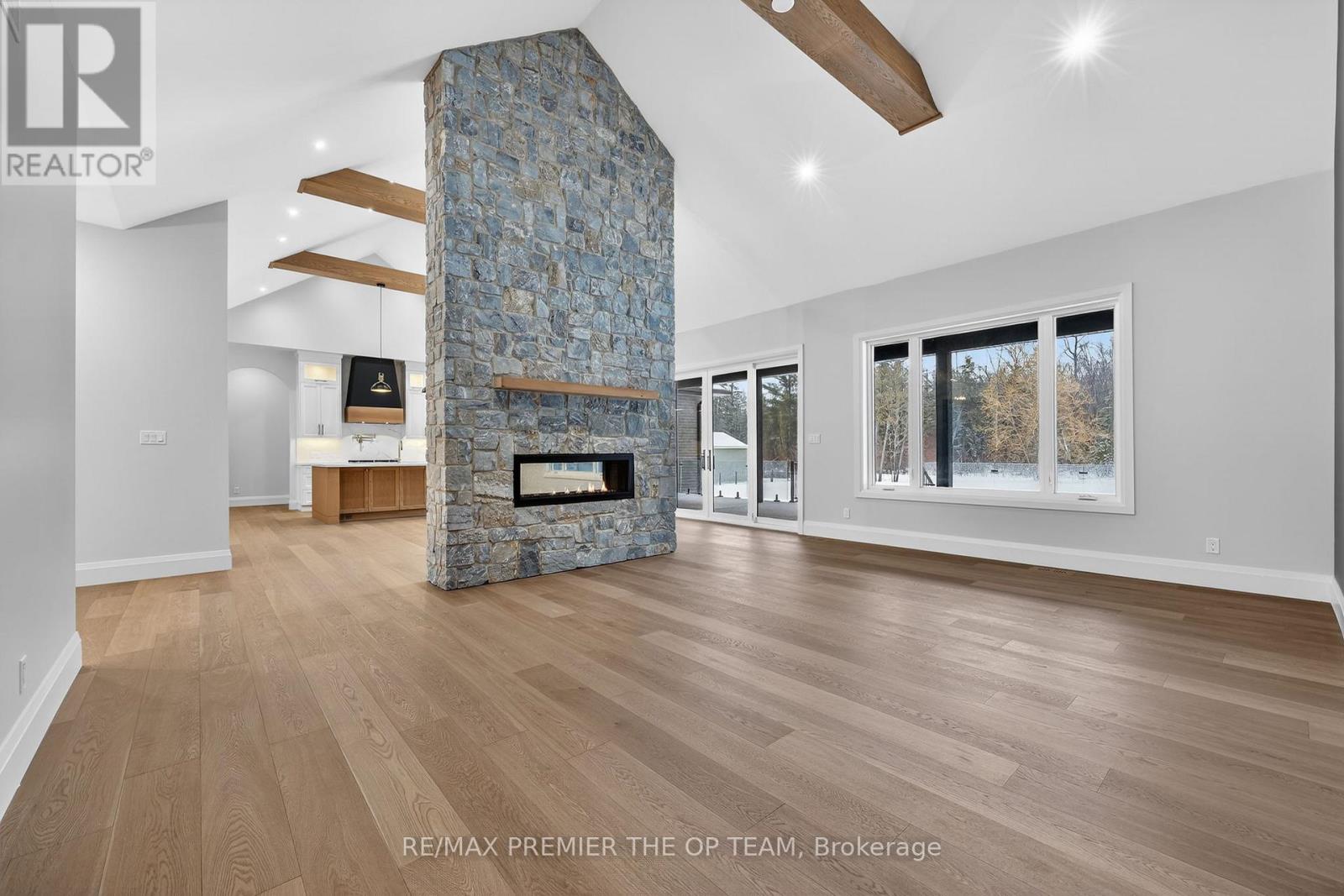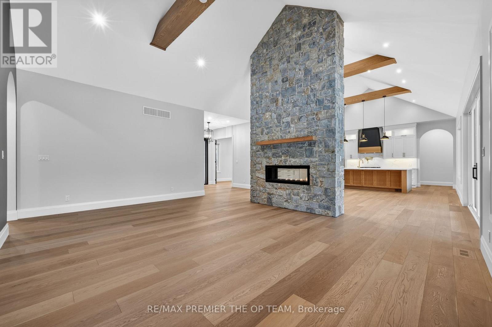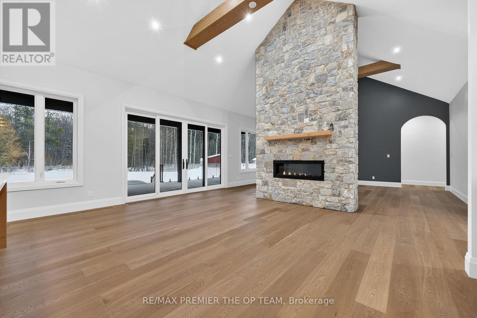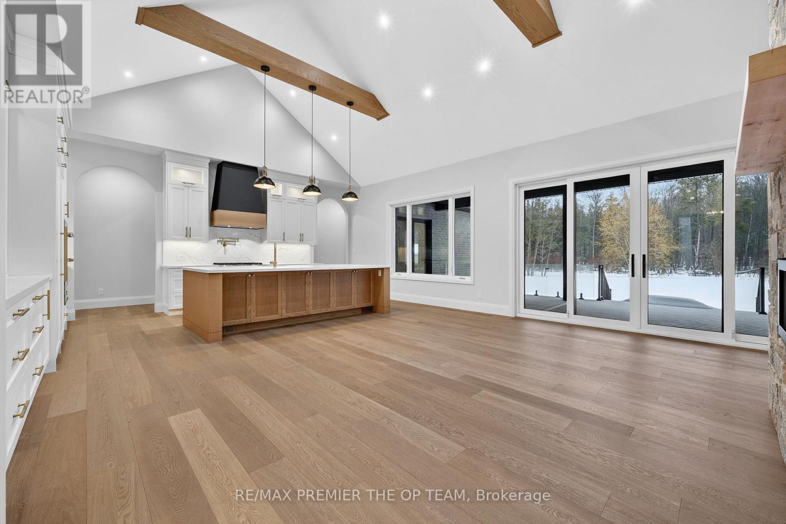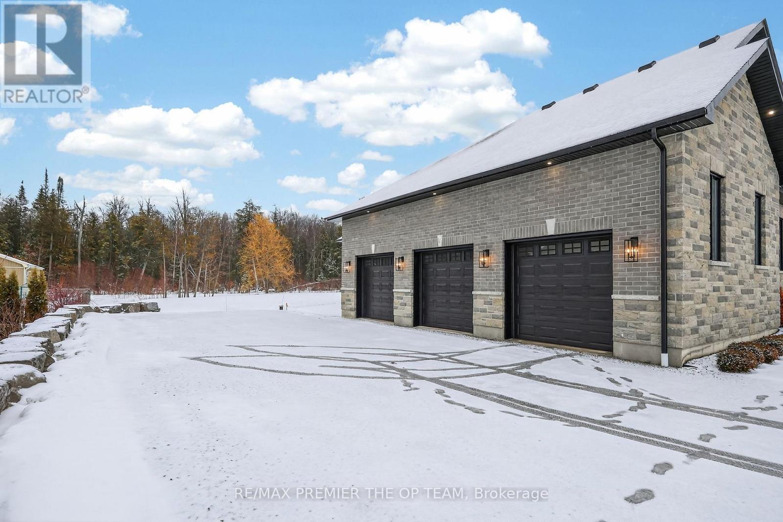 New 3,200 sq. ft. custom stone and brick bungalow on over an acre, built by a quality builder and backed by Tarion warranty. This stunning home features wide plank hardwood floors, high-end light fixtures, JennAir appliances, and Riobel bathroom fixtures throughout. The open-concept kitchen and living area is highlighted by a massive island, butler's pantry with espresso bar, and a dramatic floor-to-ceiling double-sided stone fireplace, with walkout to a covered back deck overlooking a pool-sized yard and forest backdrop. The principal suite offers a feature wall, walk-through custom closet, and spa-inspired ensuite. Separate bedroom wing with 3 bedrooms and 2 full baths. Main floor laundry and mudroom off the impressive 40' x 30' garage with oversized doors, high ceilings for car lifts, and basement walk-up. Basement features 9 ft ceilings and rough-in for additional bath. Landscaping package includes exposed stone concrete walkway, entrance garden with two trees, sodded front yard, and hydro-seeded backyard. Excellent commuter location with easy access to Barrie and Hwy 400. (id:64974)