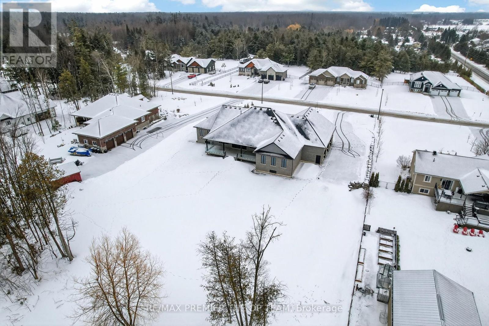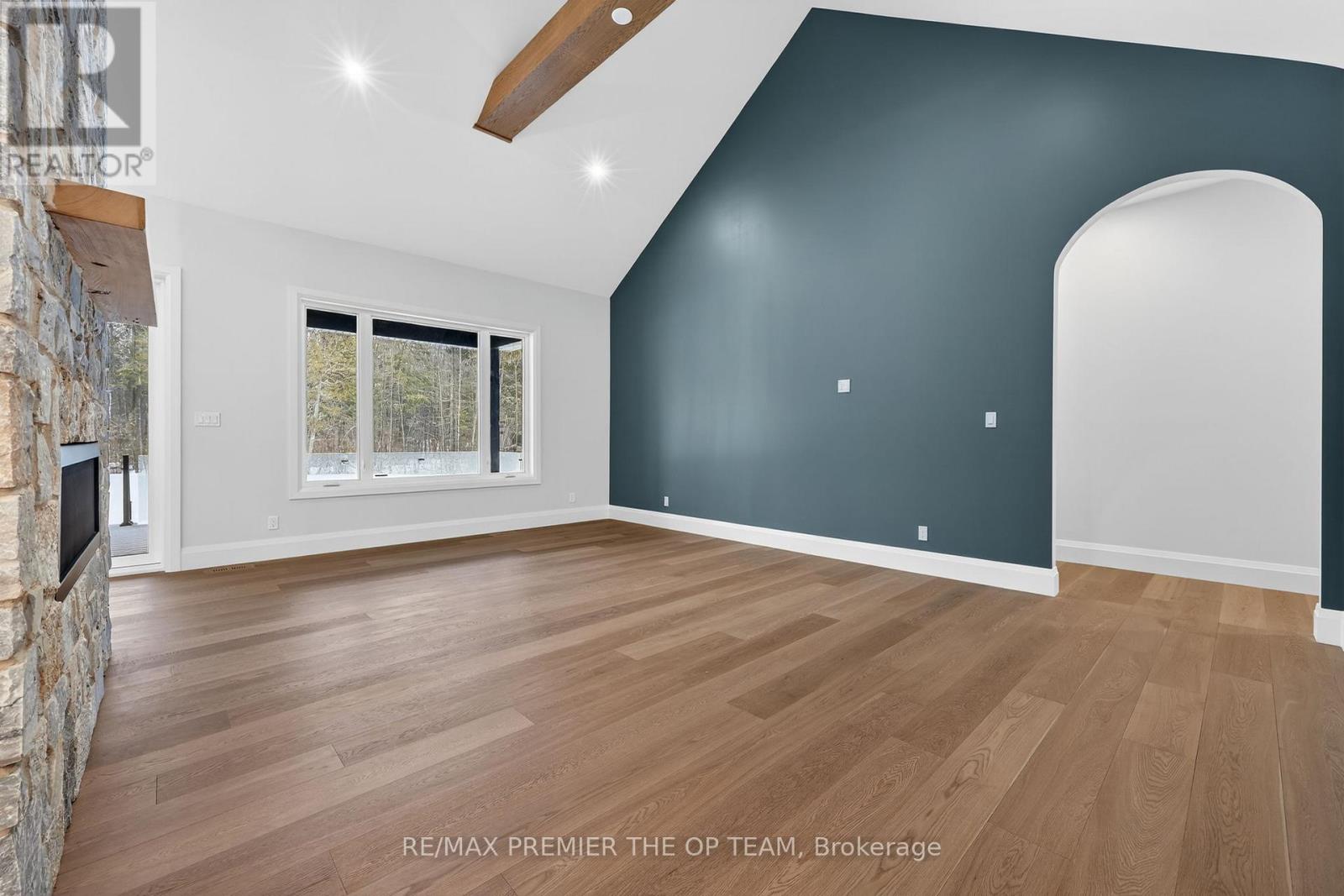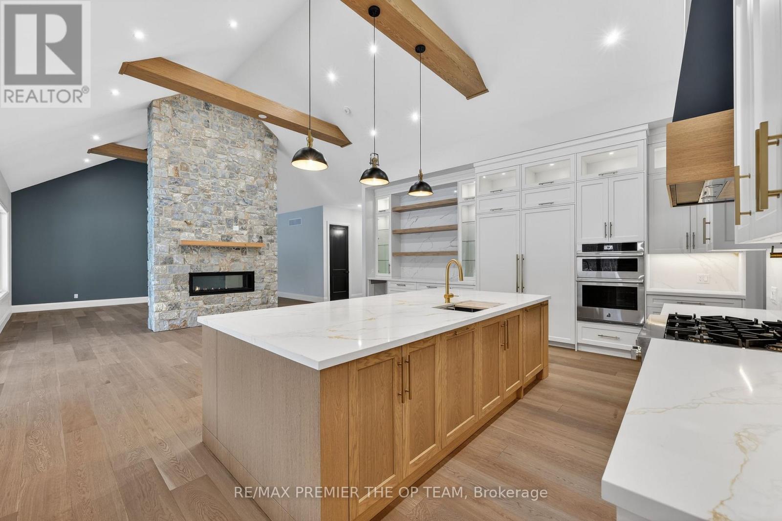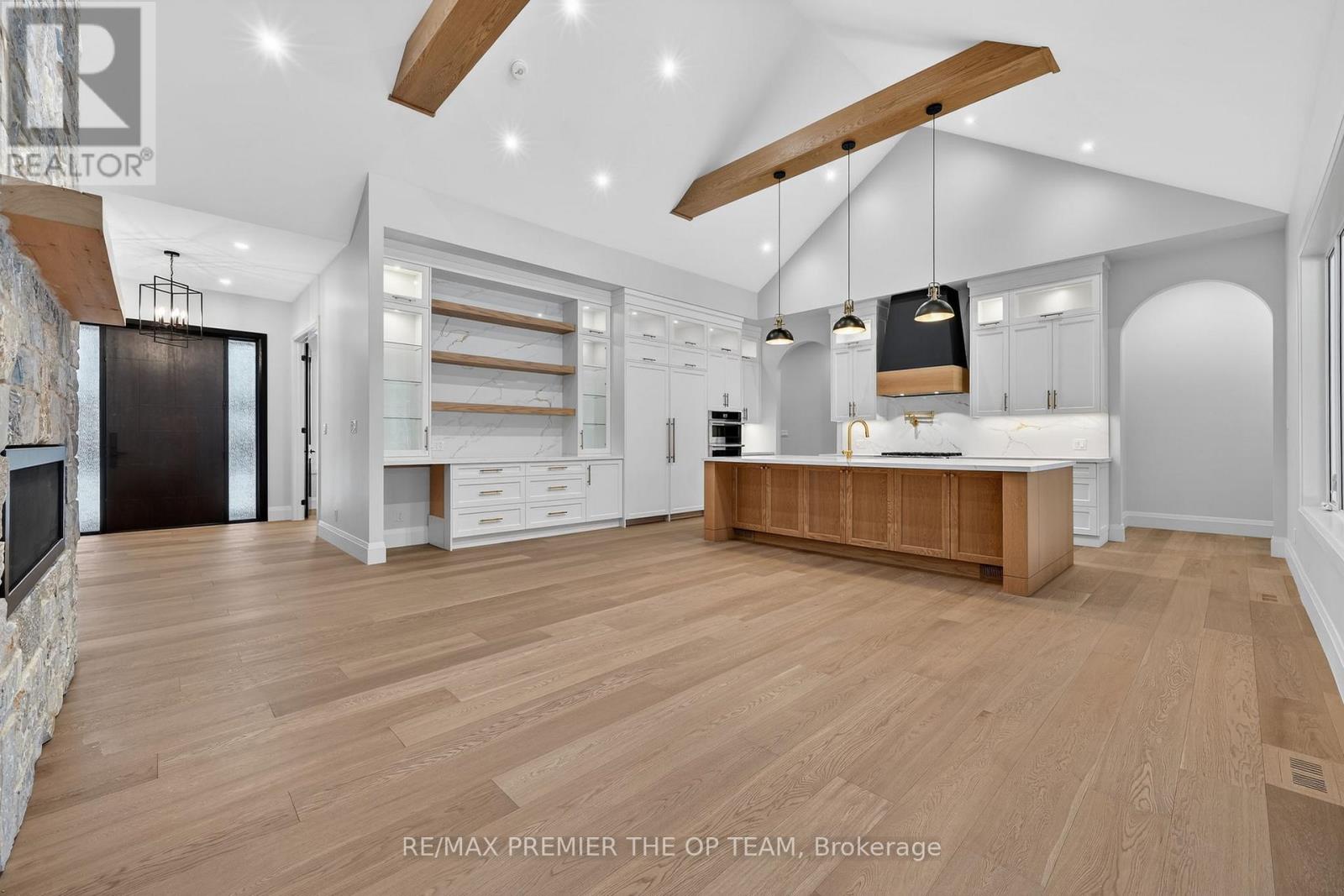 New 3,200 sq. ft. custom stone and brick bungalow on over an acre, built by a quality builder and backed by Tarion warranty. This stunning home features wide plank hardwood floors, high-end light fixtures, JennAir appliances, and Riobel bathroom fixtures throughout. The open-concept kitchen and living area is highlighted by a massive island, butler's pantry with espresso bar, and a dramatic floor-to-ceiling double-sided stone fireplace, with walkout to a covered back deck overlooking a pool-sized yard and forest backdrop. The principal suite offers a feature wall, walk-through custom closet, and spa-inspired ensuite. Separate bedroom wing with 3 bedrooms and 2 full baths. Main floor laundry and mudroom off the impressive 40' x 30' garage with oversized doors, high ceilings for car lifts, and basement walk-up. Basement features 9 ft ceilings and rough-in for additional bath. Landscaping package includes exposed stone concrete walkway, entrance garden with two trees, sodded front yard, and hydro-seeded backyard. Excellent commuter location with easy access to Barrie and Hwy 400. (id:64974)
