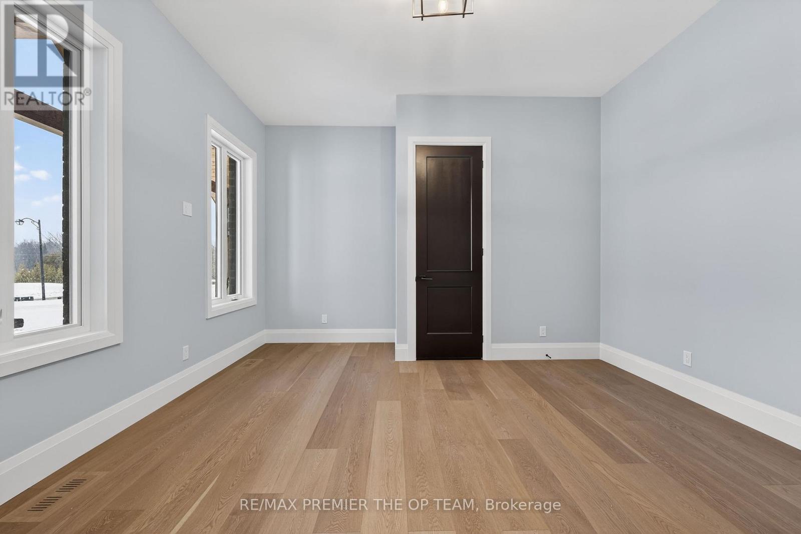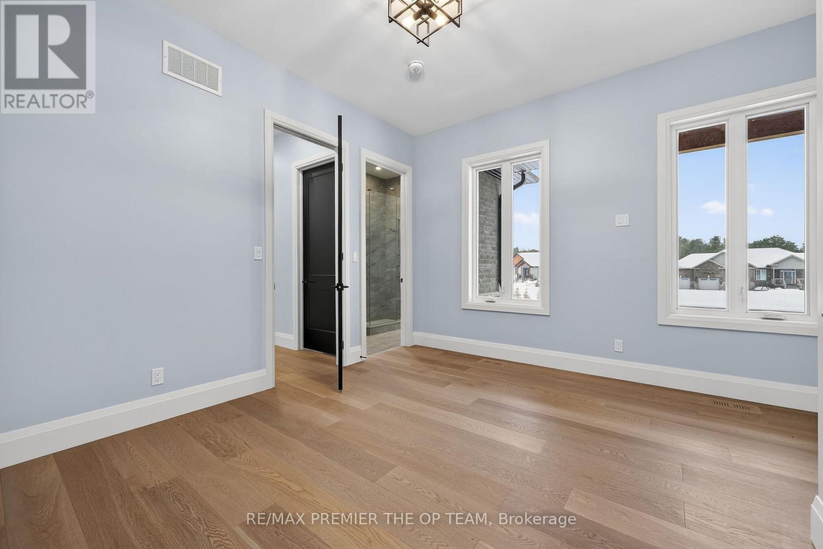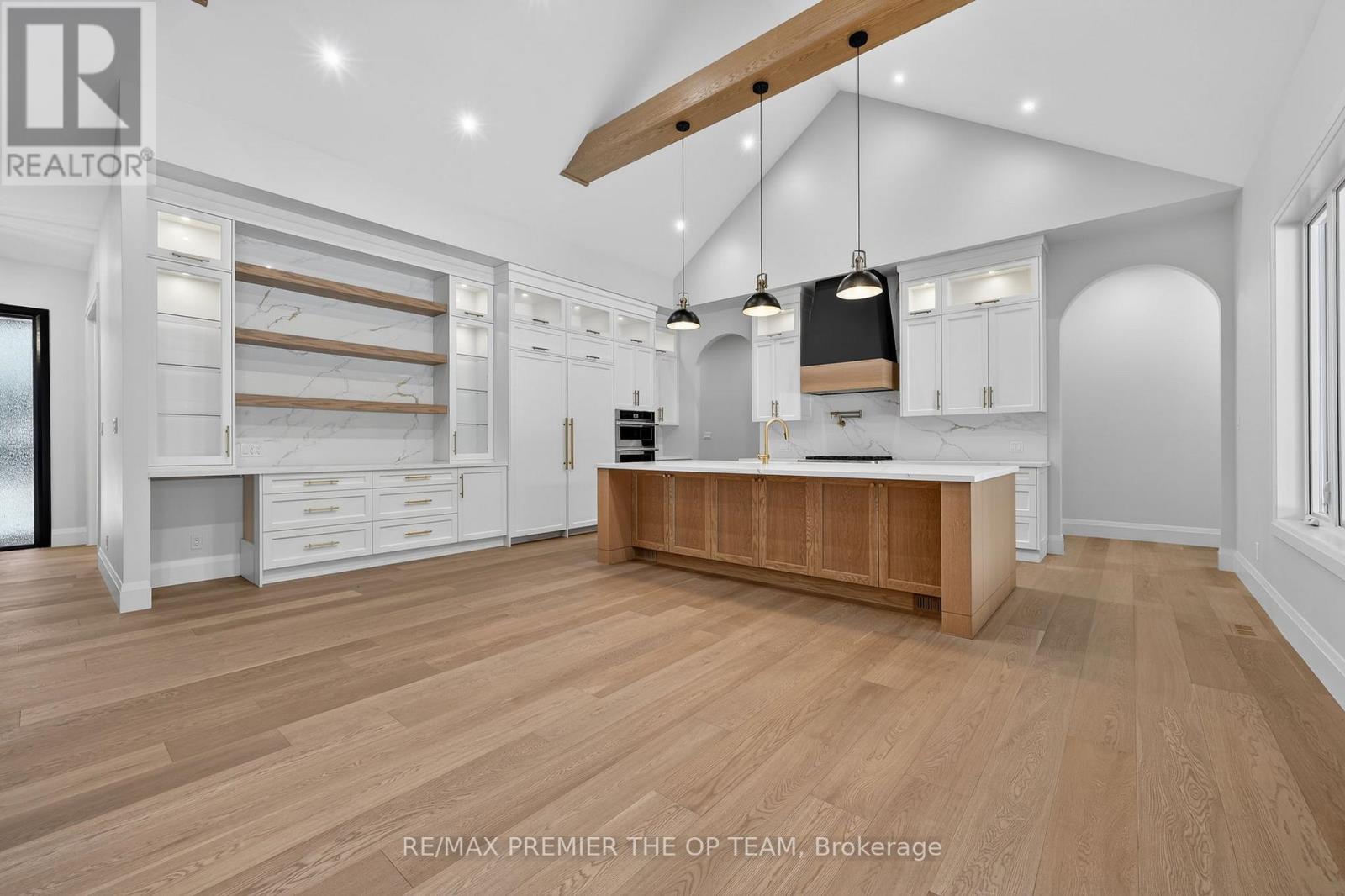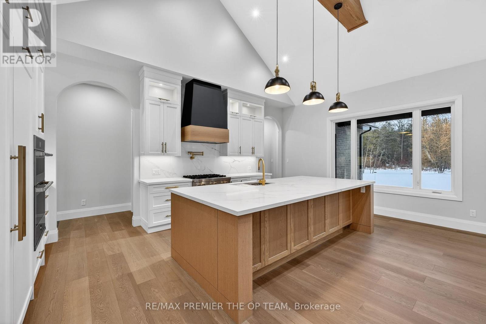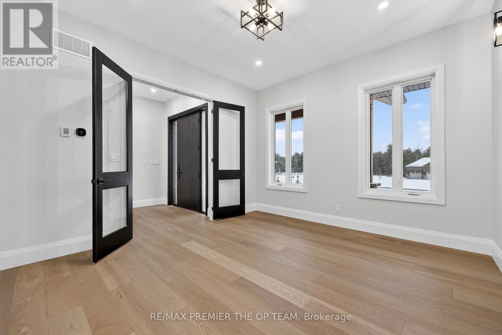New 3,200 sq. ft. custom stone and brick bungalow on over an acre, built by a quality builder and backed by Tarion warranty. This stunning home features wide plank hardwood floors, high-end light fixtures, JennAir appliances, and Riobel bathroom fixtures throughout. The open-concept kitchen and living area is highlighted by a massive island, butler's pantry with espresso bar, and a dramatic floor-to-ceiling double-sided stone fireplace, with walkout to a covered back deck overlooking a pool-sized yard and forest backdrop. The principal suite offers a feature wall, walk-through custom closet, and spa-inspired ensuite. Separate bedroom wing with 3 bedrooms and 2 full baths. Main floor laundry and mudroom off the impressive 40' x 30' garage with oversized doors, high ceilings for car lifts, and basement walk-up. Basement features 9 ft ceilings and rough-in for additional bath. Landscaping package includes exposed stone concrete walkway, entrance garden with two trees, sodded front yard, and hydro-seeded backyard. Excellent commuter location with easy access to Barrie and Hwy 400. (id:64974)